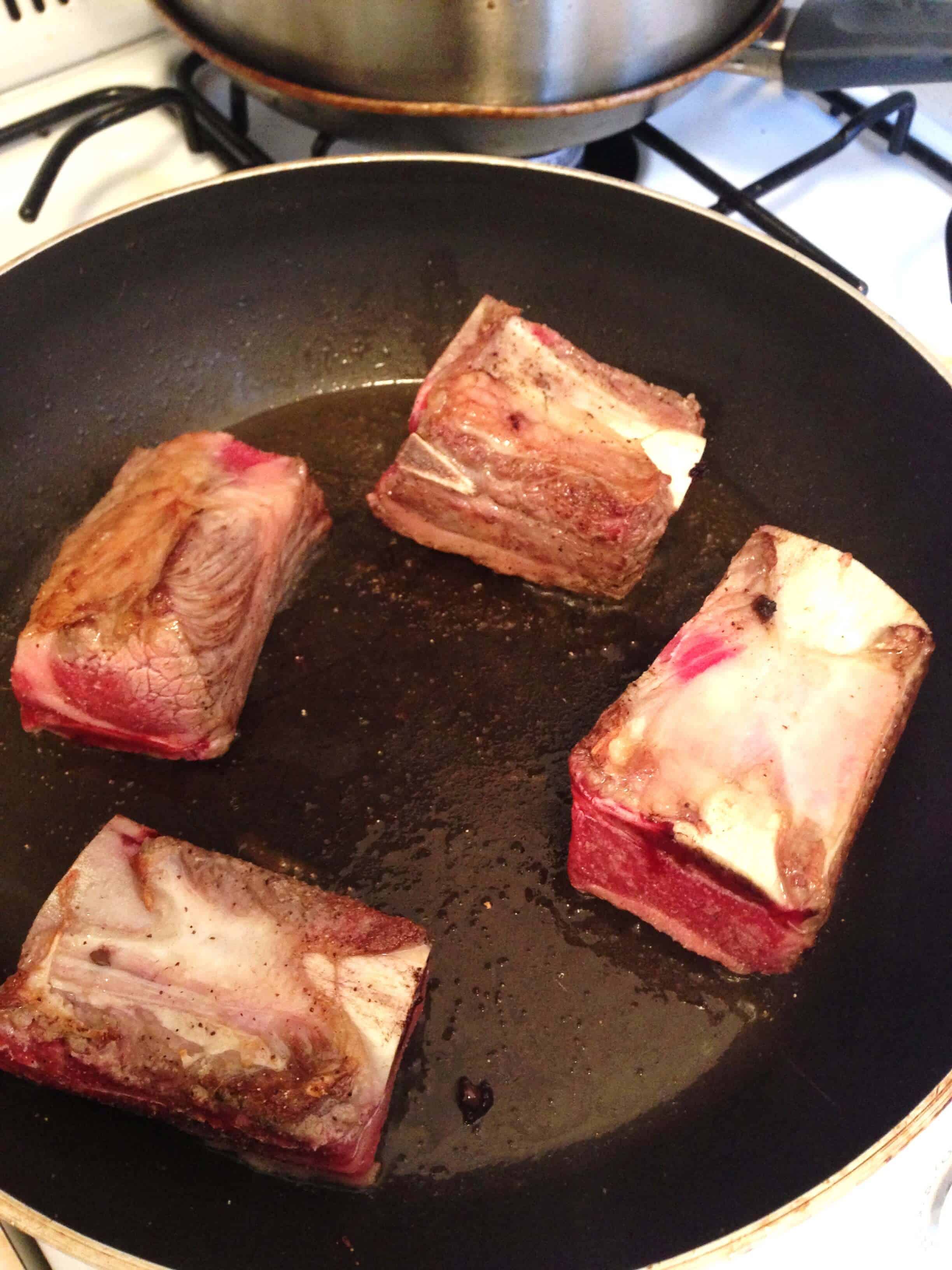 我开始通过在肋骨洒盐和胡椒大方量。在中高热量的大盆,然后我焦黄四面肋骨,并从锅中取出它们(保持盘中的水滴)。