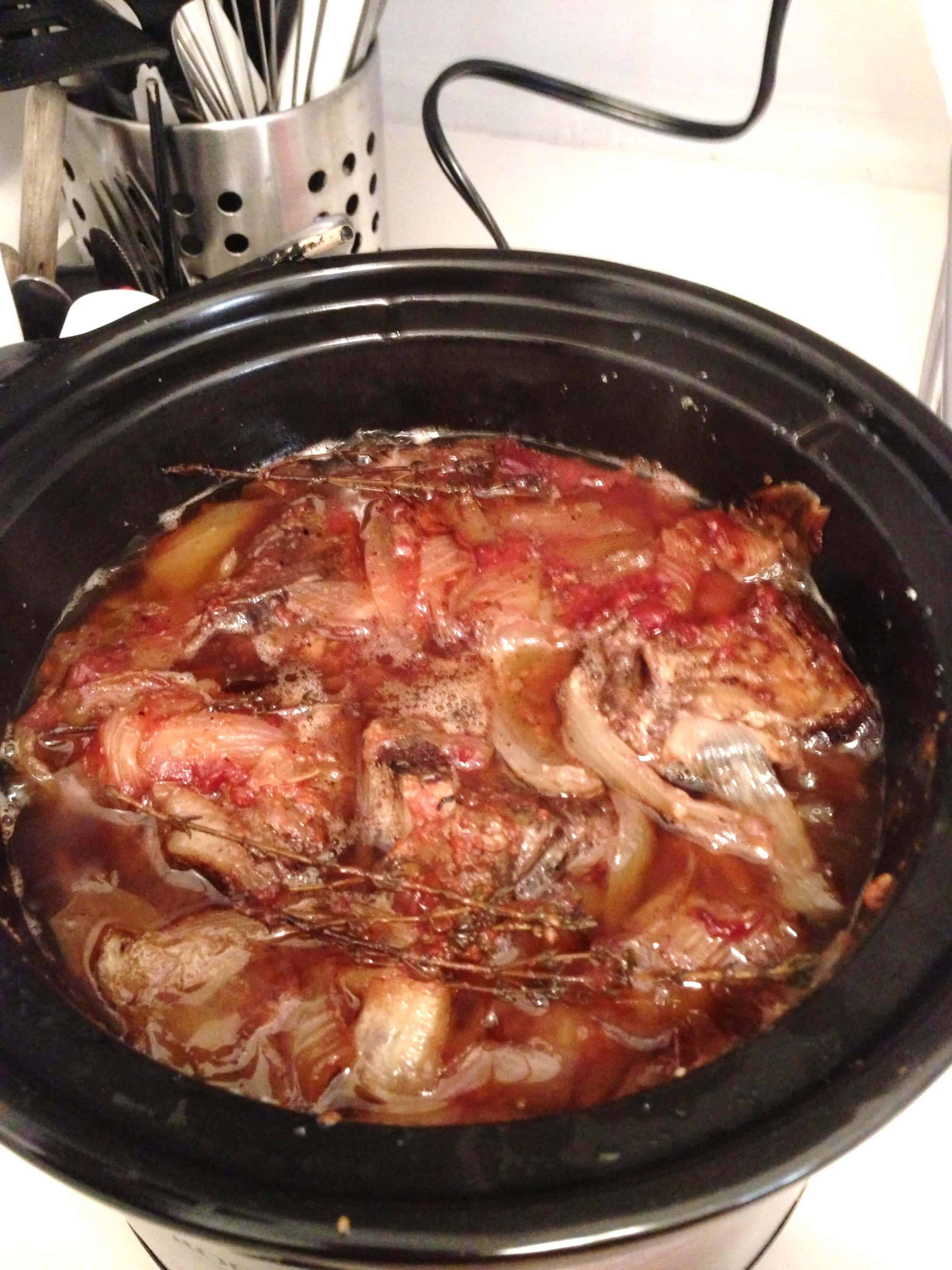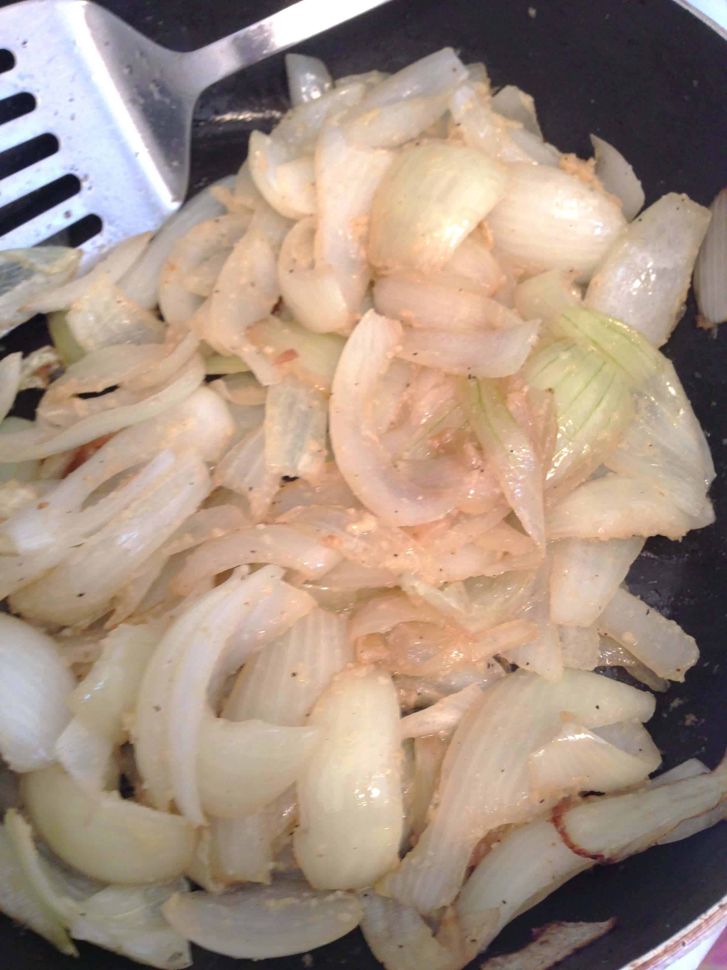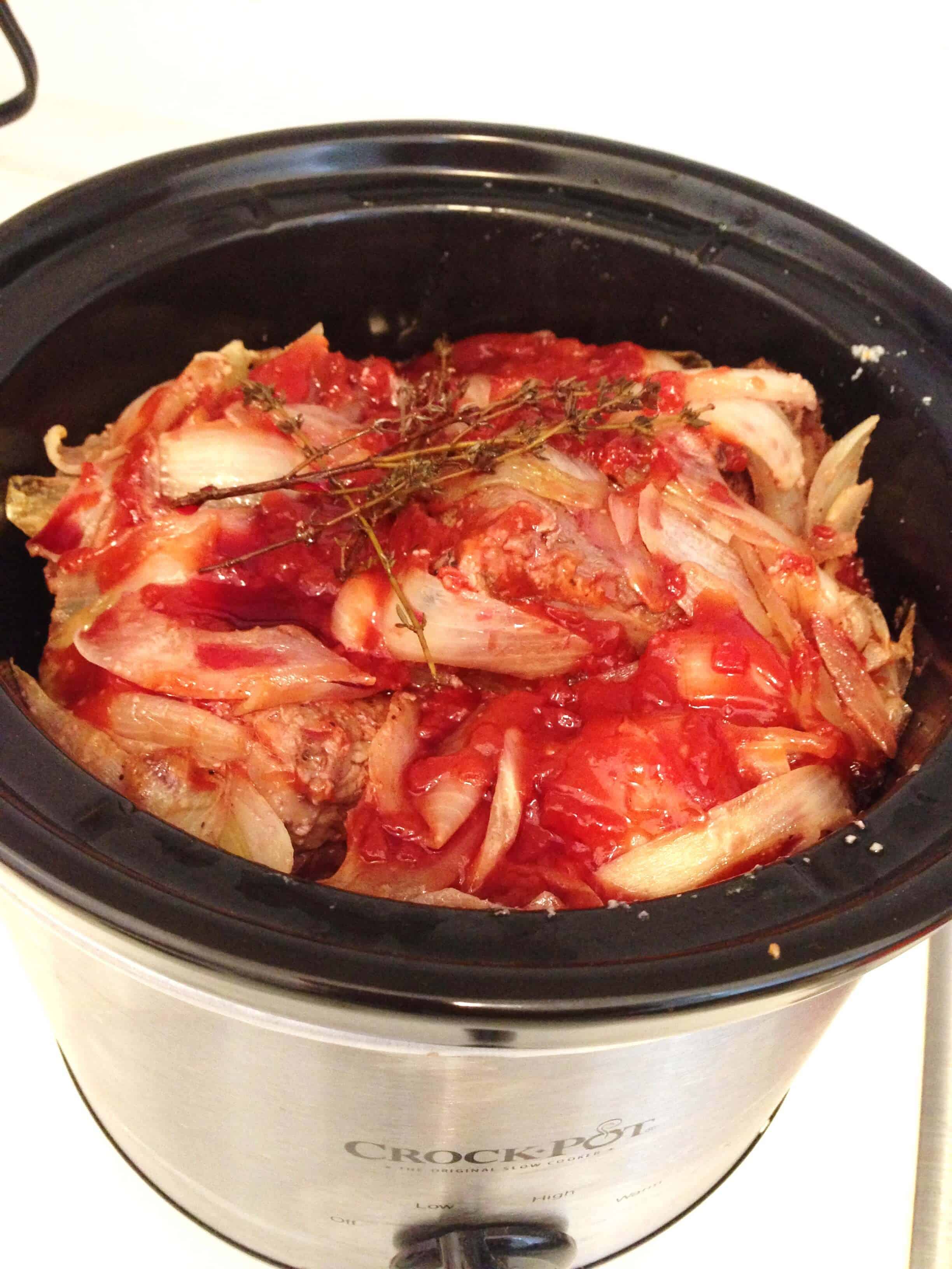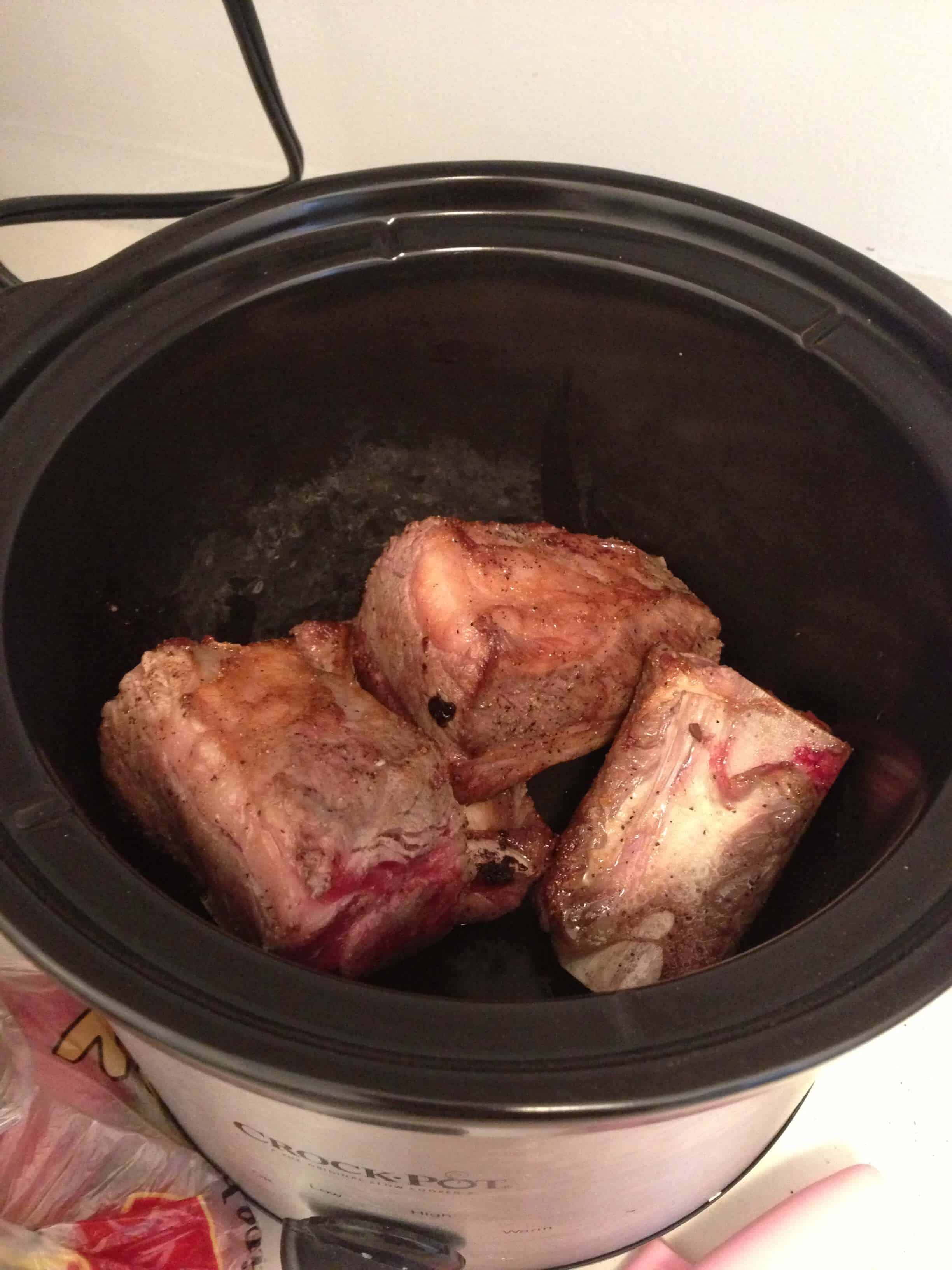 接下来,我炒洋葱在同一个平底锅,直到他们是半透明的,并增加了大蒜。我让再煮分钟,然后放入排骨,我crockpot,覆盖它们与洋葱/大蒜混合物。