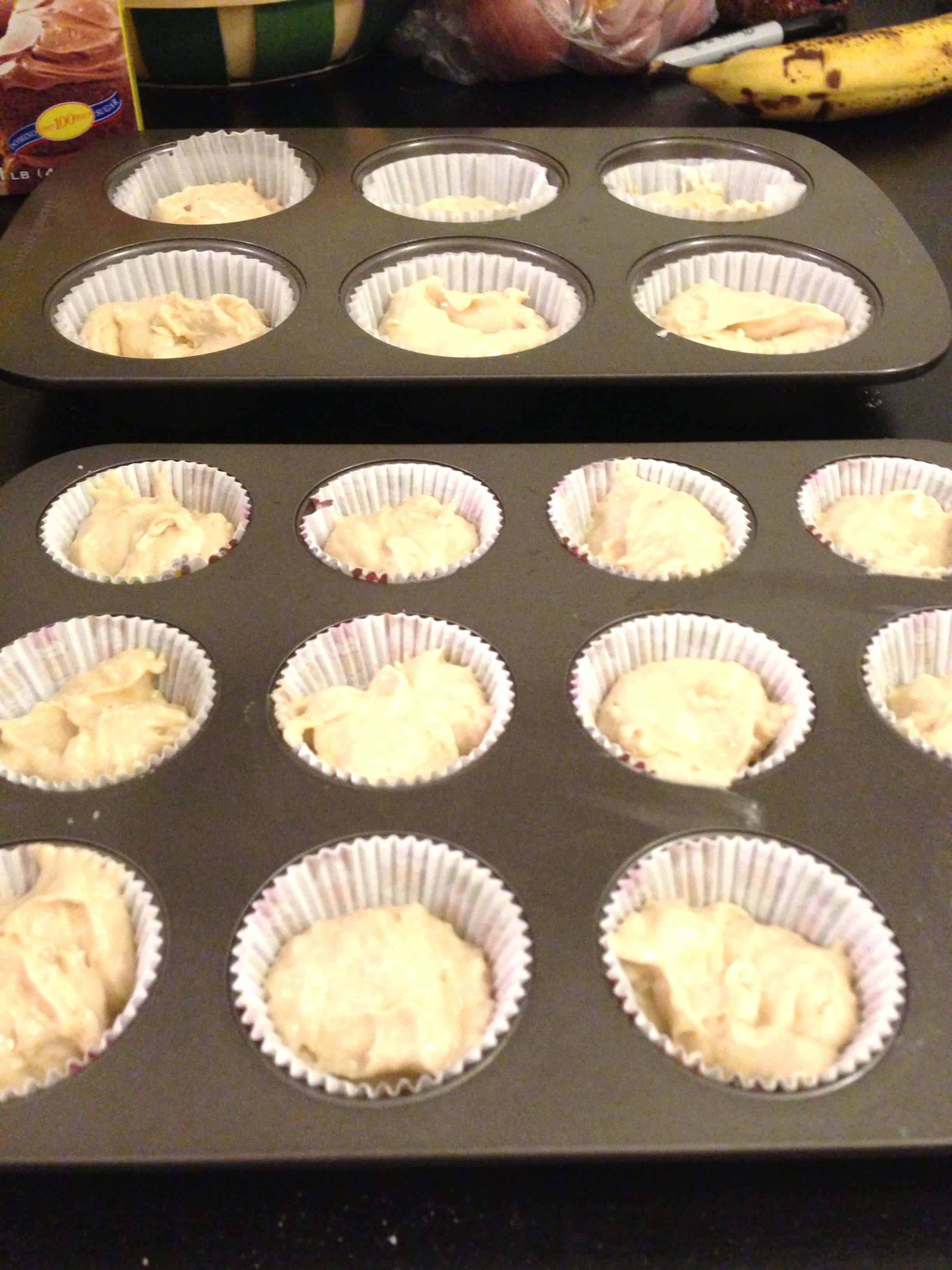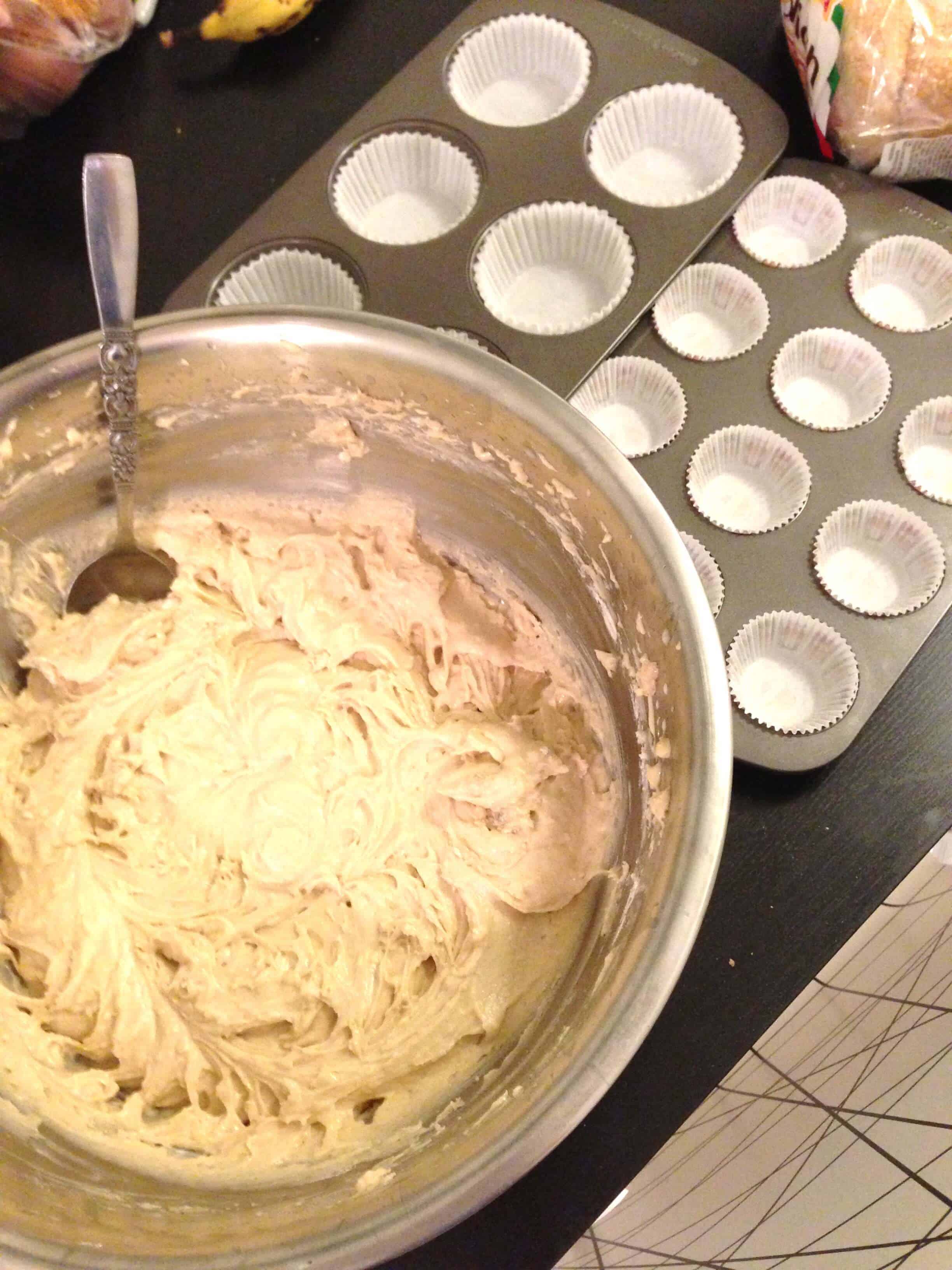 为了使蛋糕,我预热烘箱至350°F。然后我衬以纸衬里2个蛋糕盘(一个用于常规大小蛋糕,一个用于微型蛋糕)。在一个大碗我结合黄油和红糖,在中高速一起打他们,直到它的混合物轻和蓬松。我再在鸡蛋一次一个混合,每次加入后打匀,并根据需要刮上下碗的边。