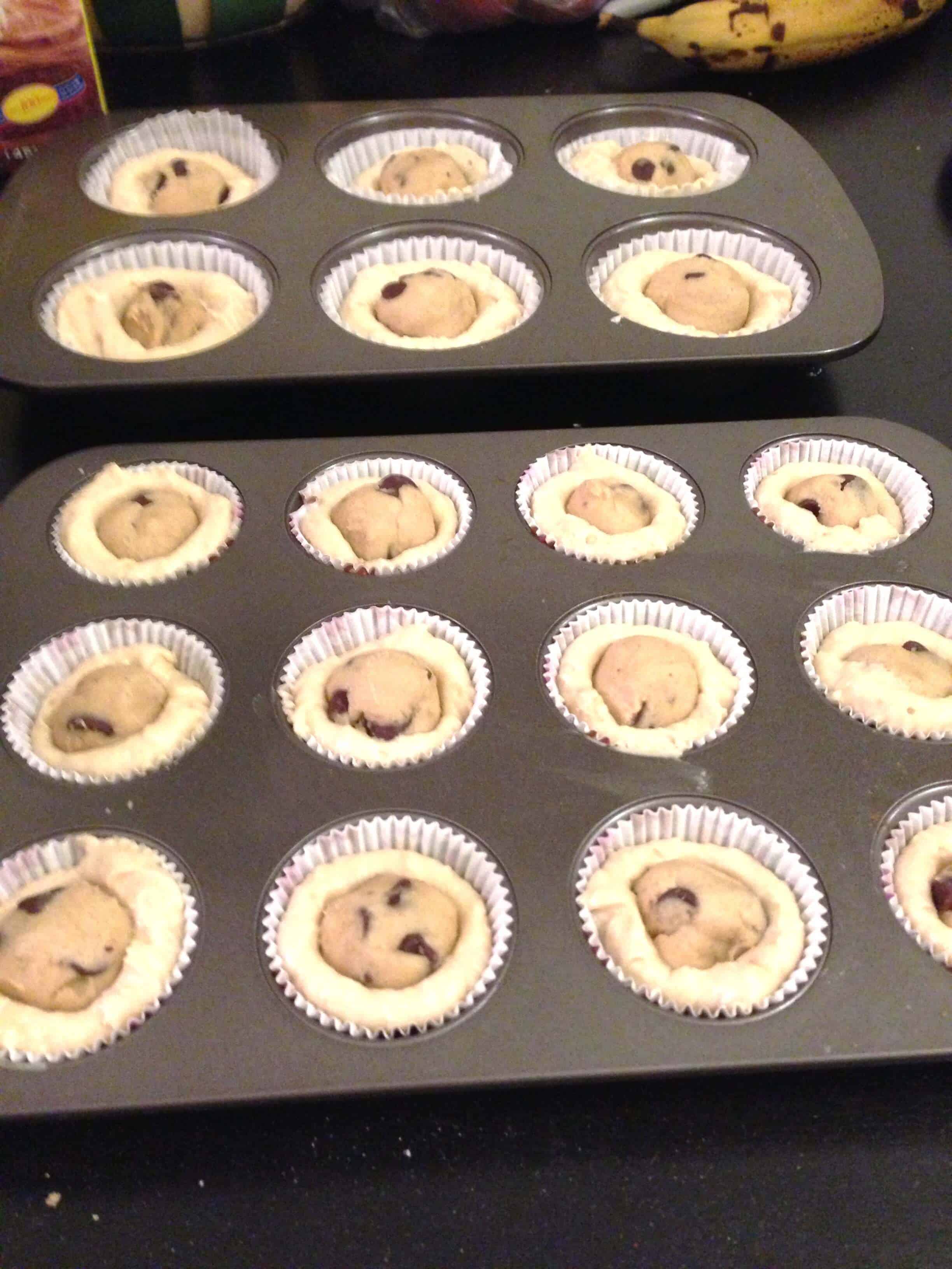 用两个勺子,我把准备好的蛋糕杯垫装满了半杯蛋糕面糊。然后我把一个冷冻面团球塞到每个蛋糕的中间。我让纸杯蛋糕烤了15-18分钟;迷你杯形蛋糕显然比普通的烤得快一些。然后我把纸杯蛋糕从平底锅里拿出来,让它们完全凉在铁架上,然后在上面撒上糖霜。我有一个小烤箱,所以我做了大约4个批次(我的纸杯蛋糕平底锅只有一半大小)。