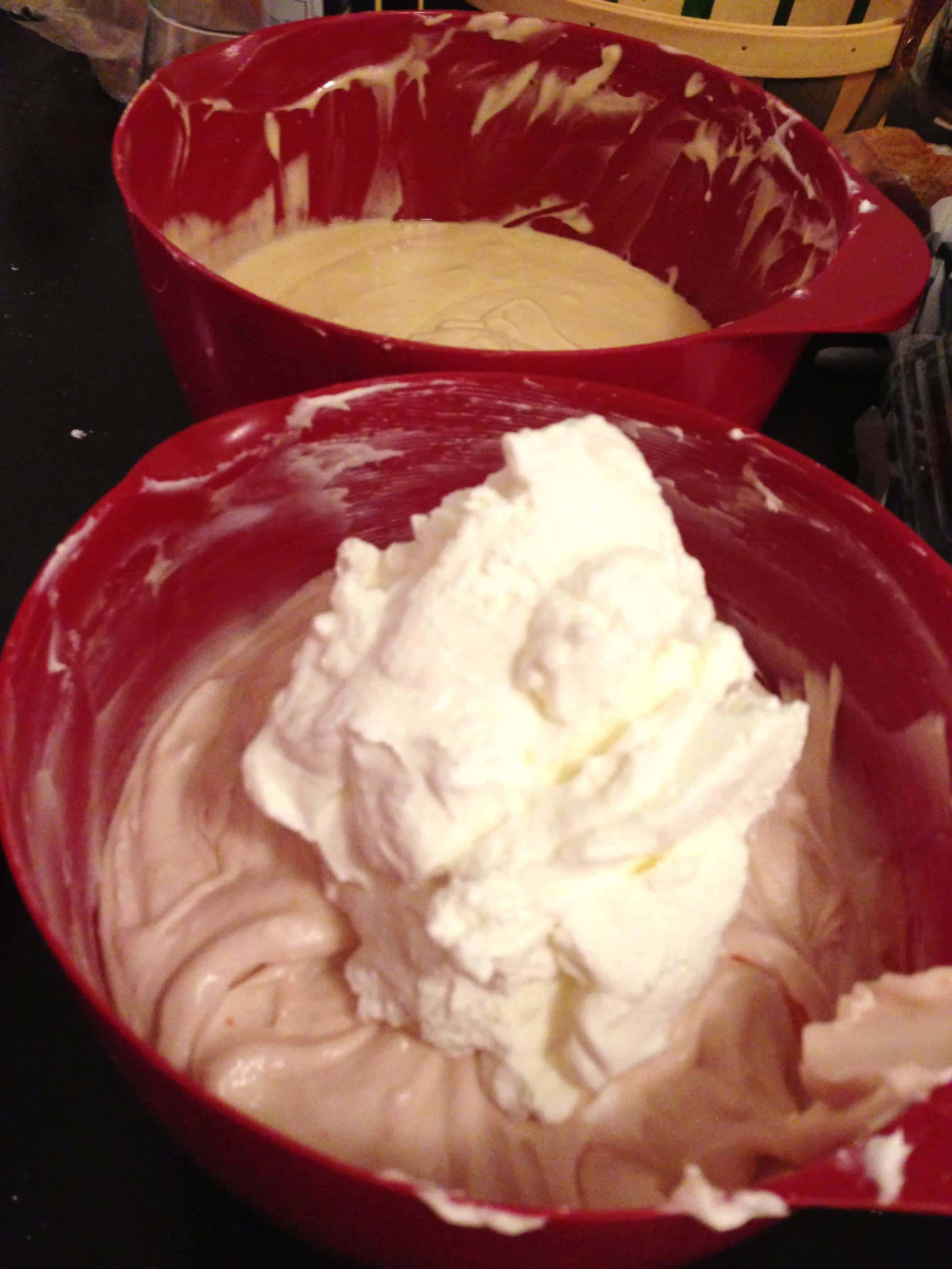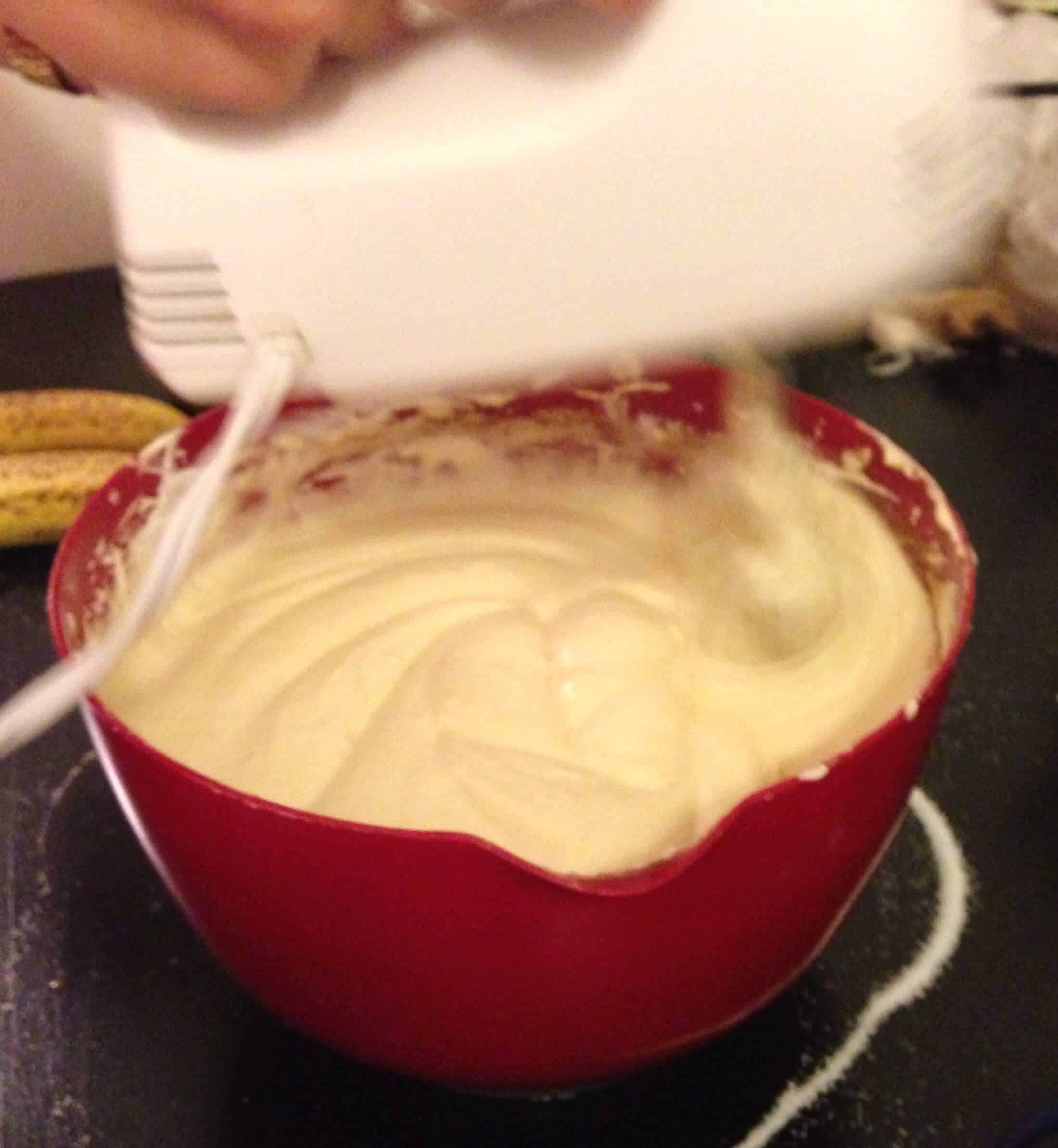 接下来,我从冰箱中取出冷冻的碗,搅拌奶油直到形成泡沫(冷冻的碗确实加快了这部分的速度)。最后一步是把鲜奶油拌成糖霜。