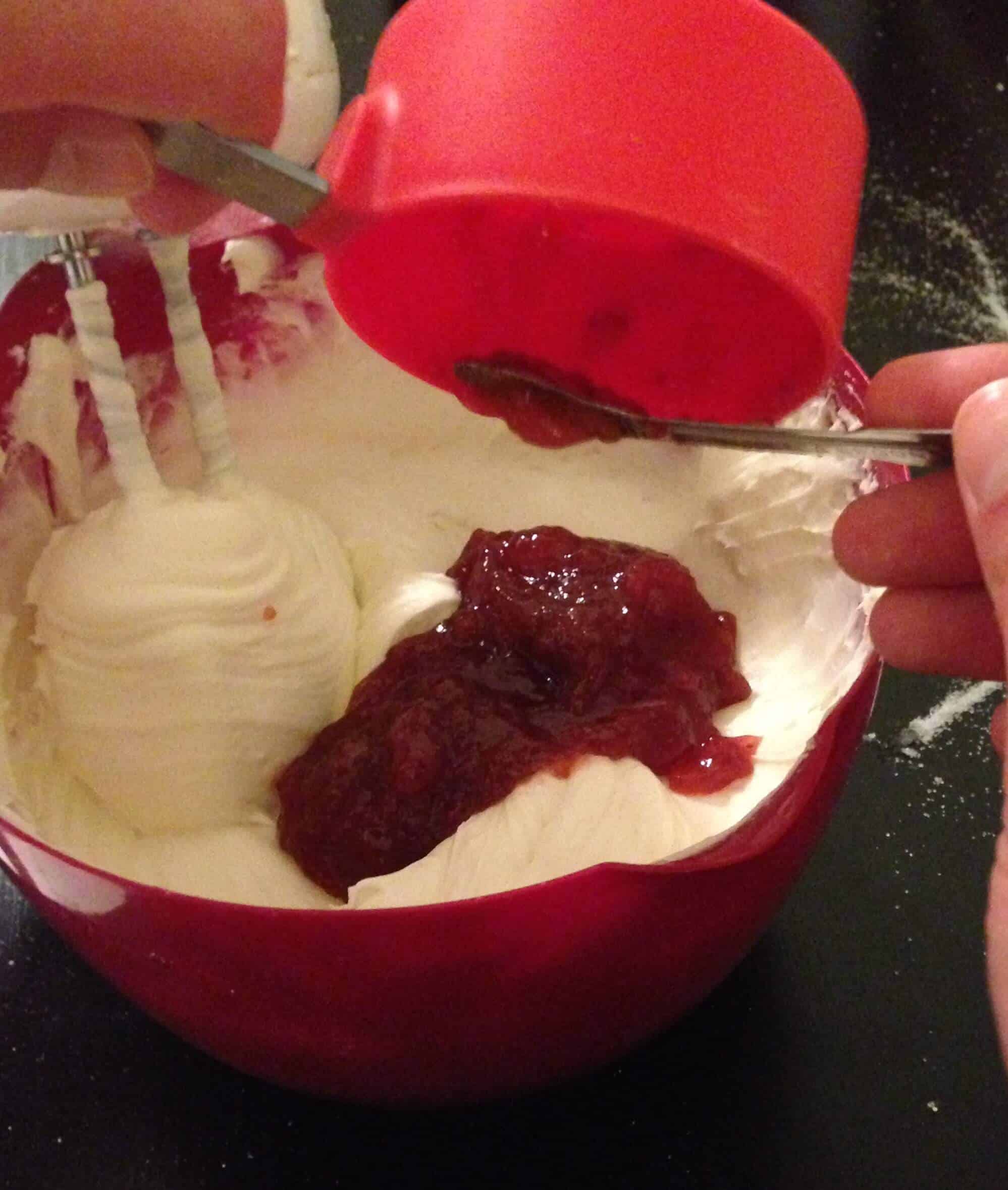 接下来我们加入酸奶油、6汤匙草莓酱和香草精,搅拌直到所有东西都混合在一起。我们分三次加入干的混合物,每次加入后都要搅拌。