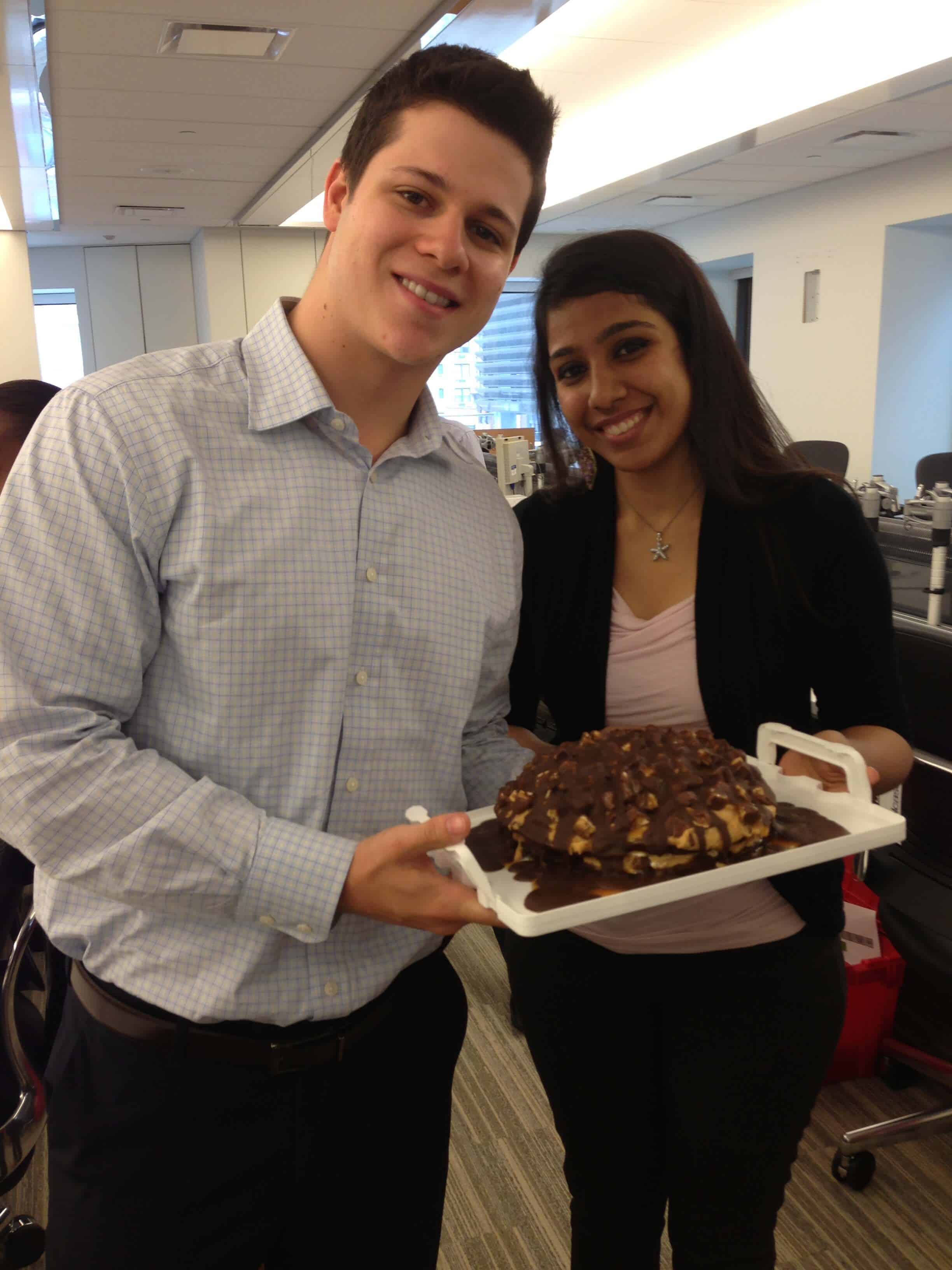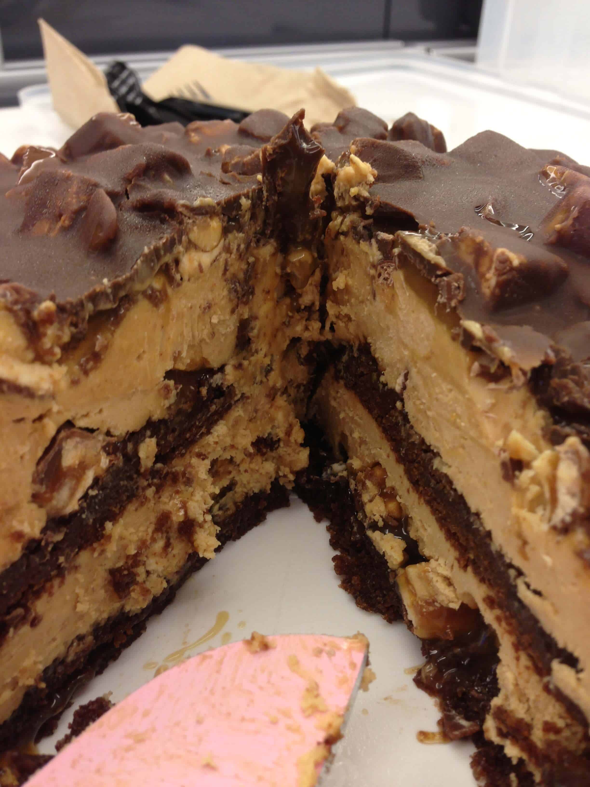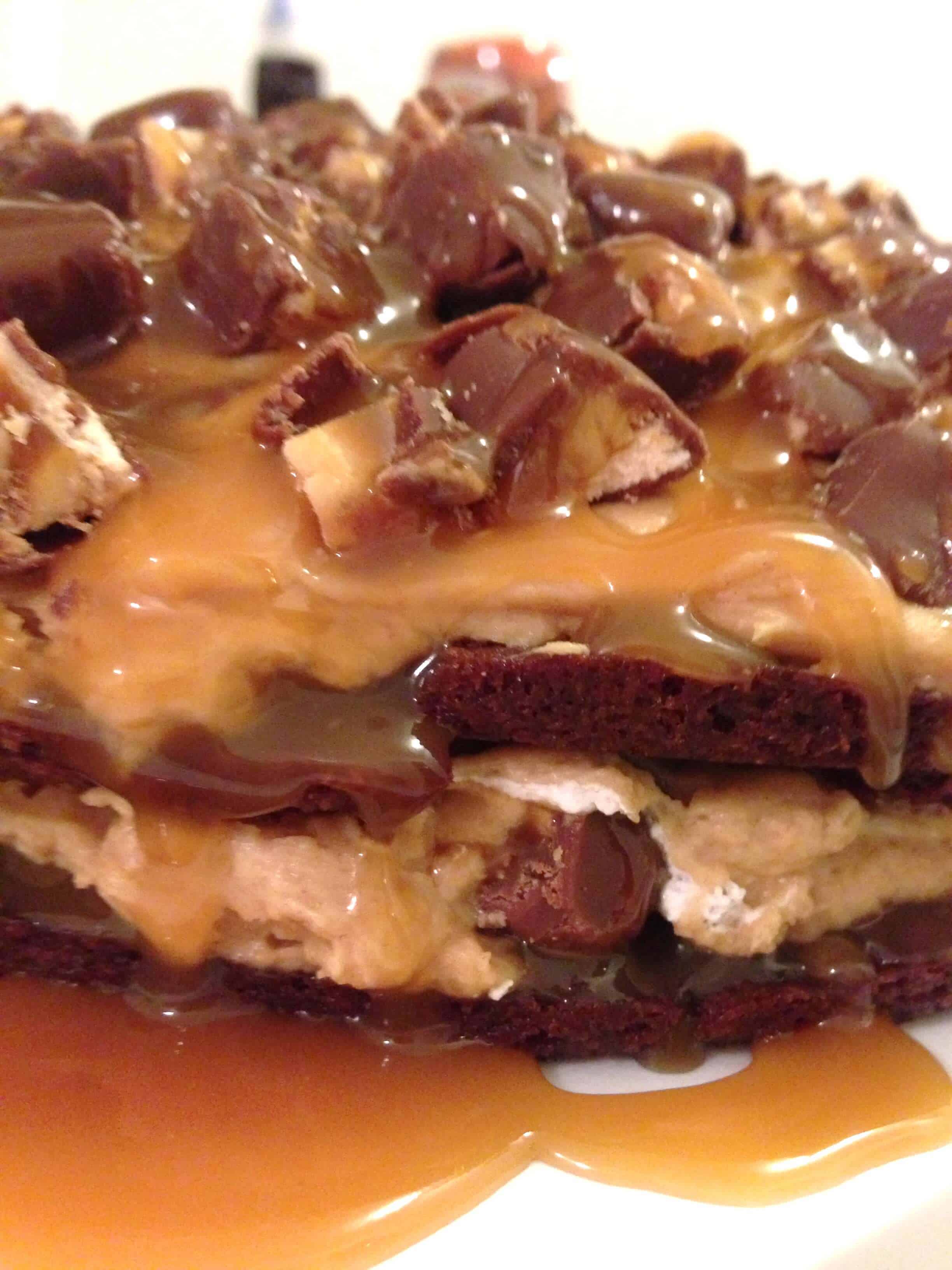 对于蛋糕的组装,我放在我的蛋糕托盘和窃笑均匀地分布在顶部蔓延1/3的中间层布朗尼之一。然后我淋上1/2杯焦糖酱和1/2杯巧克力酱在布朗尼的。然后我用花生酱冰激凌的一半突破这一点,并让约15分钟这一级冻结。然后我放置在冰淇淋的顶部上的第二层布朗尼,再次覆盖与所述第二组短切嘲笑的,1/2杯焦糖酱,和1/2杯巧克力酱布朗尼。我突破这个用剩下的花生酱冰激凌,然后用剩下的窃笑,焦糖酱,巧克力酱淋上,允许其小雨下来的两侧。
