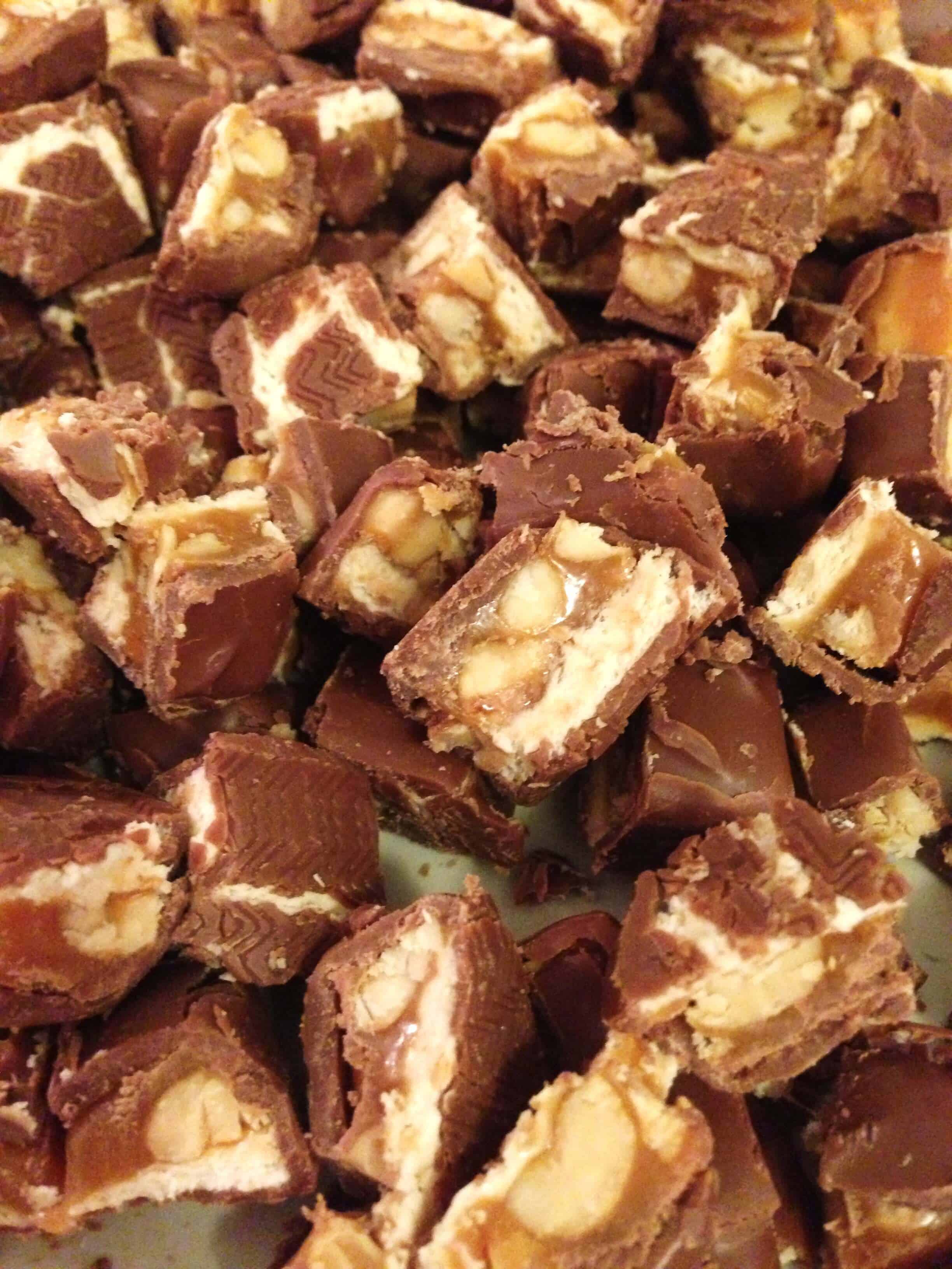 - 1个11.5盎司袋迷你窃笑,切碎,分成三组