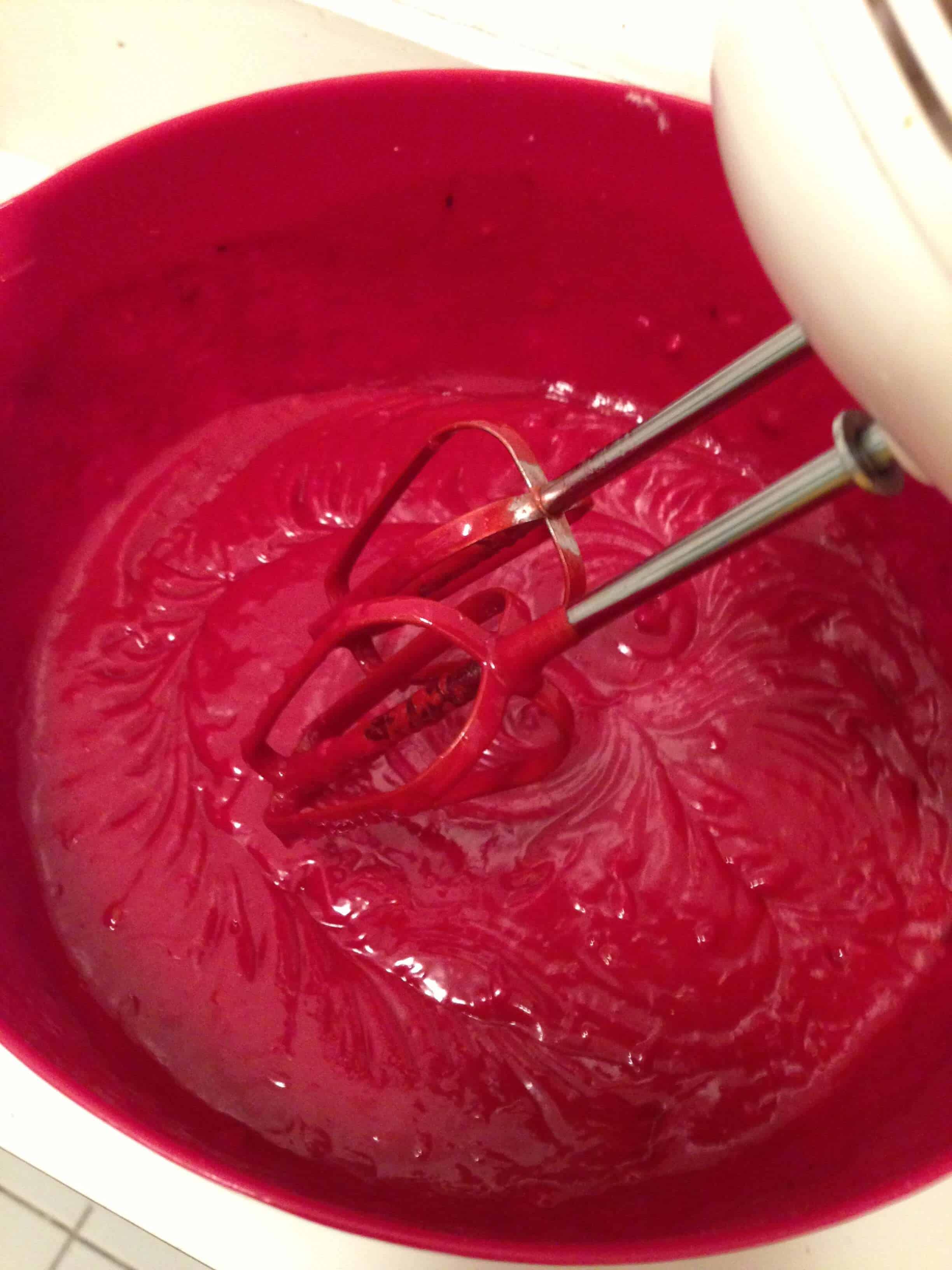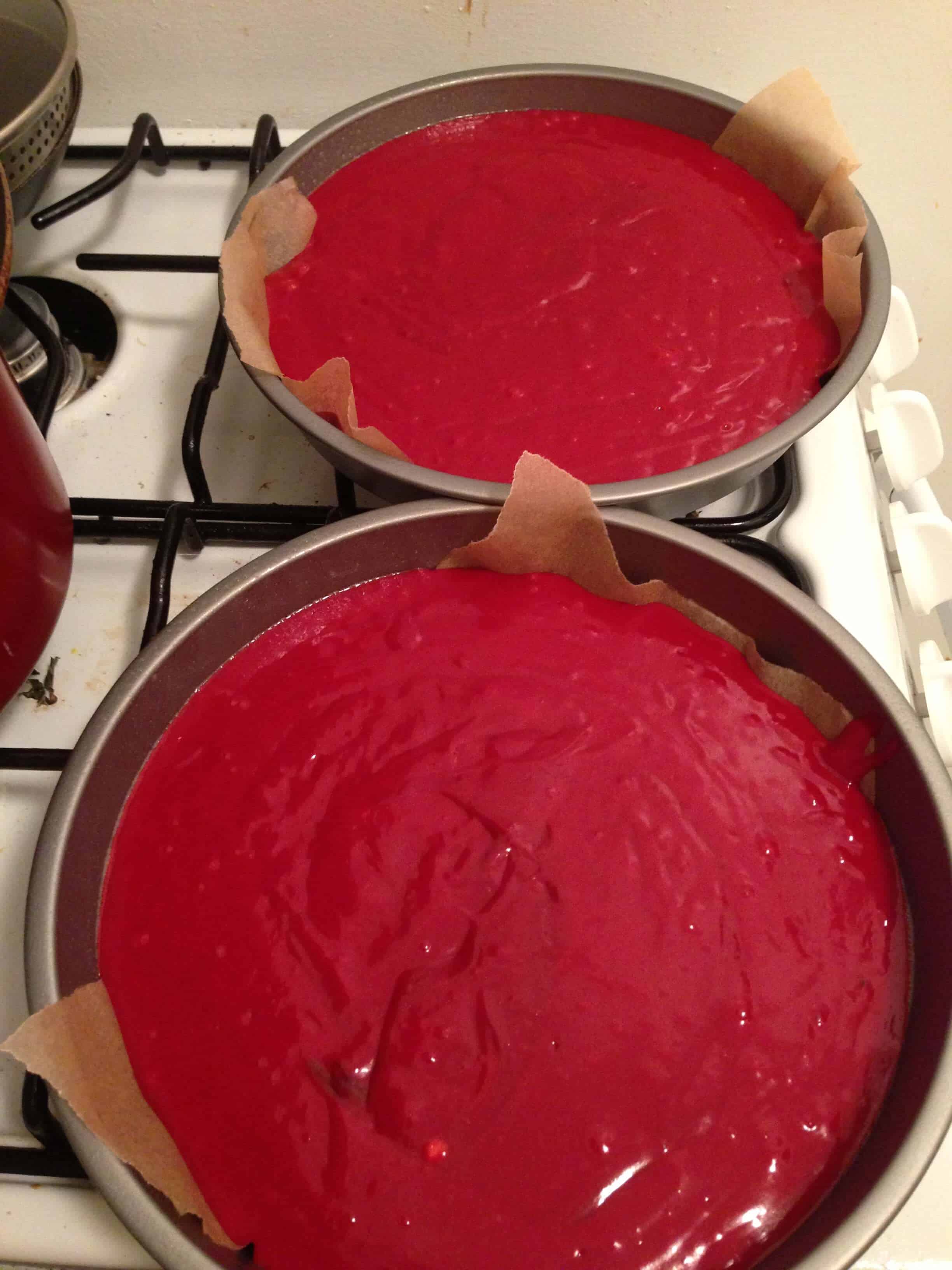 第二天晚上,我做了红丝绒蛋糕层。我预热烤箱我到350华氏度,并涂油和面粉我的两个9英寸的圆形金属烤盘。在一个大碗里,我飞快地把面粉,糖,可可粉,小苏打和盐。然后我加入鸡蛋,油,酪乳,食品着色剂,香草和醋面粉混合物。使用我的手混合器上中,低速,我击败该混合物,直到它被混合(约2分钟)的。我再均匀地涂抹面糊倒入准备我的锅,烤他们为30〜35分钟(或直到插入中心牙签出来与一些潮湿面包屑附后)。我让他们在锅冷却在电线支架10分钟,然后从盘中取出蛋糕,直到他们完全冷却(跑来跑去的蛋糕边缘用刀使得很多更容易去除)。