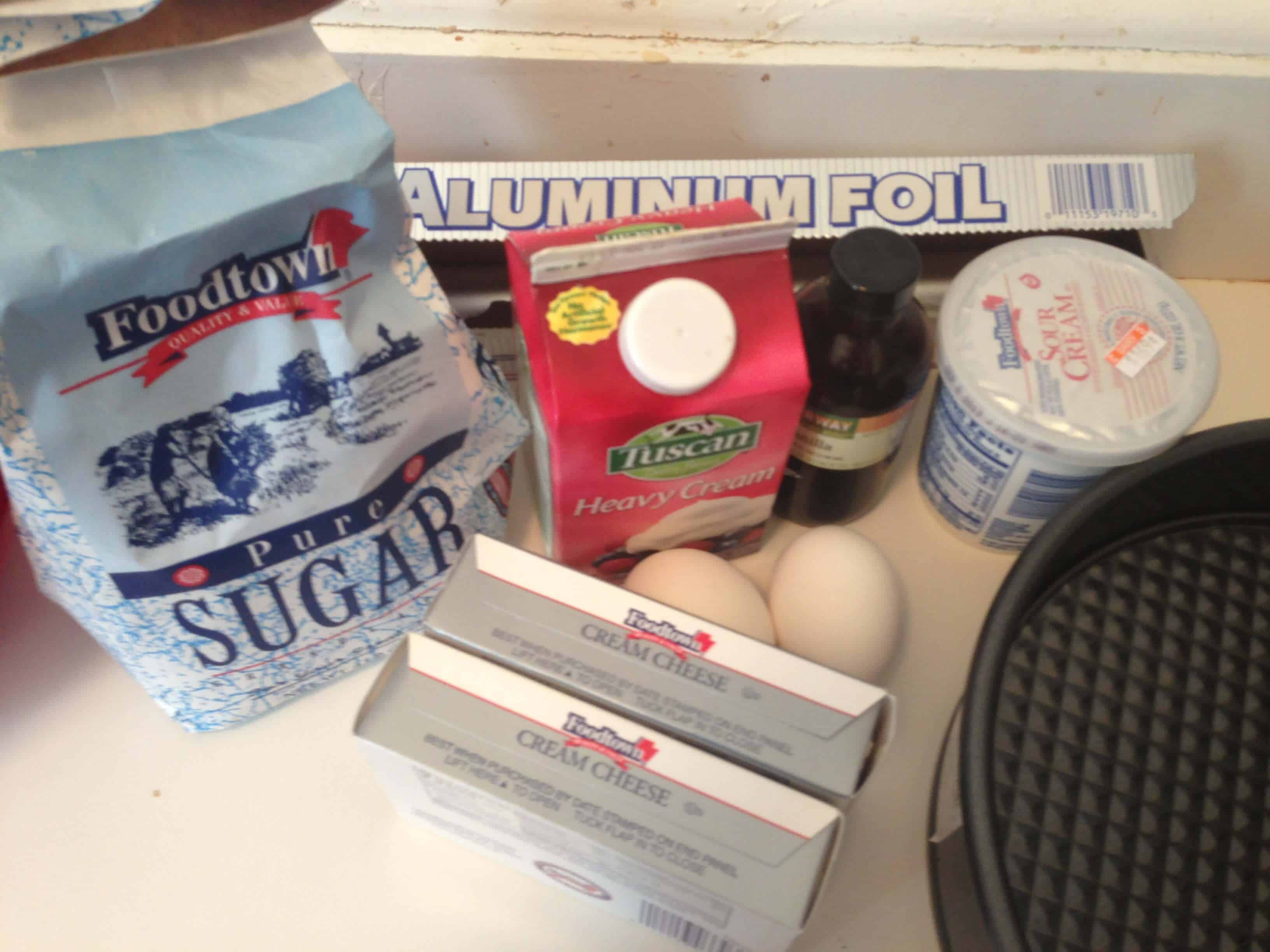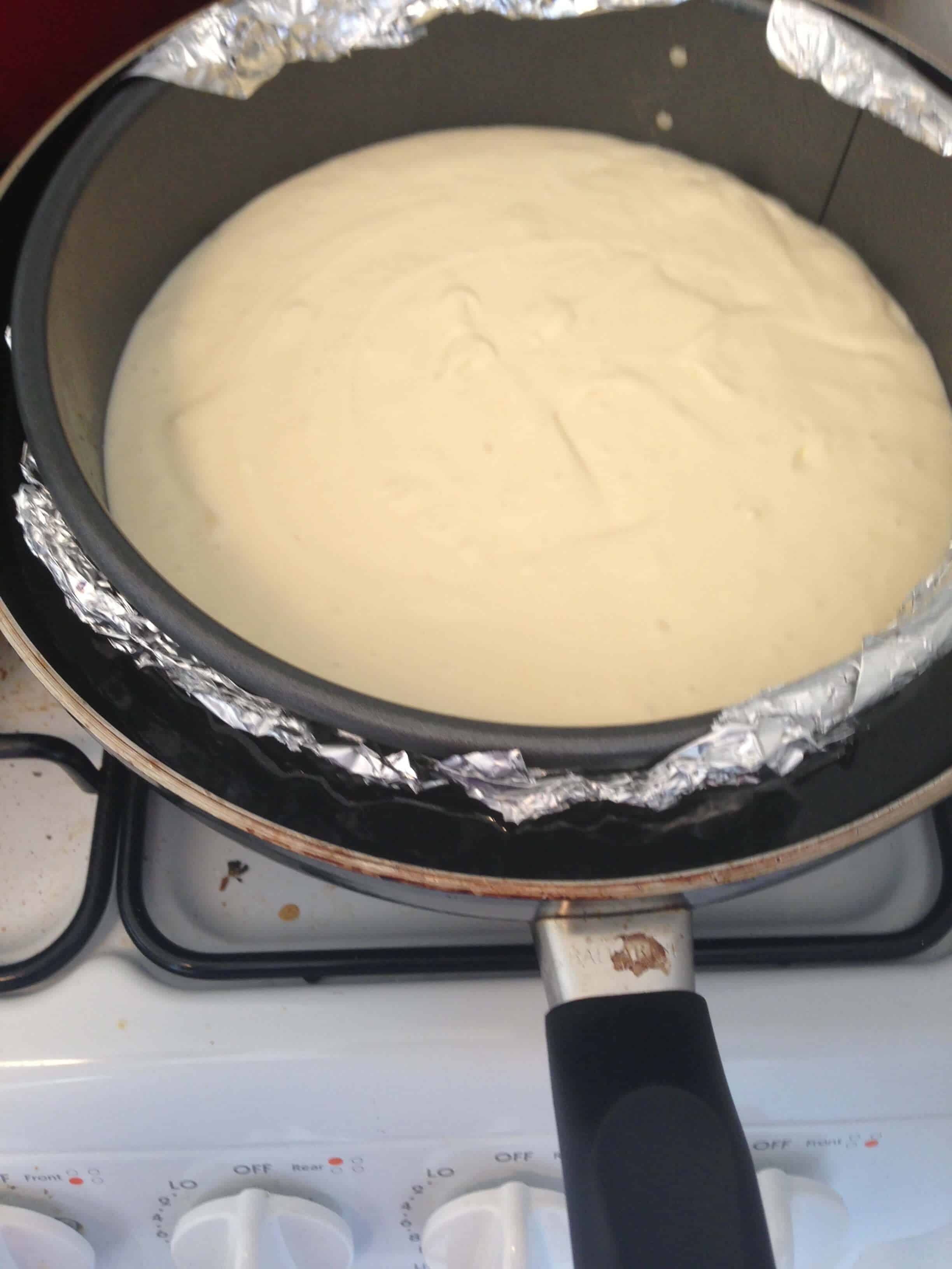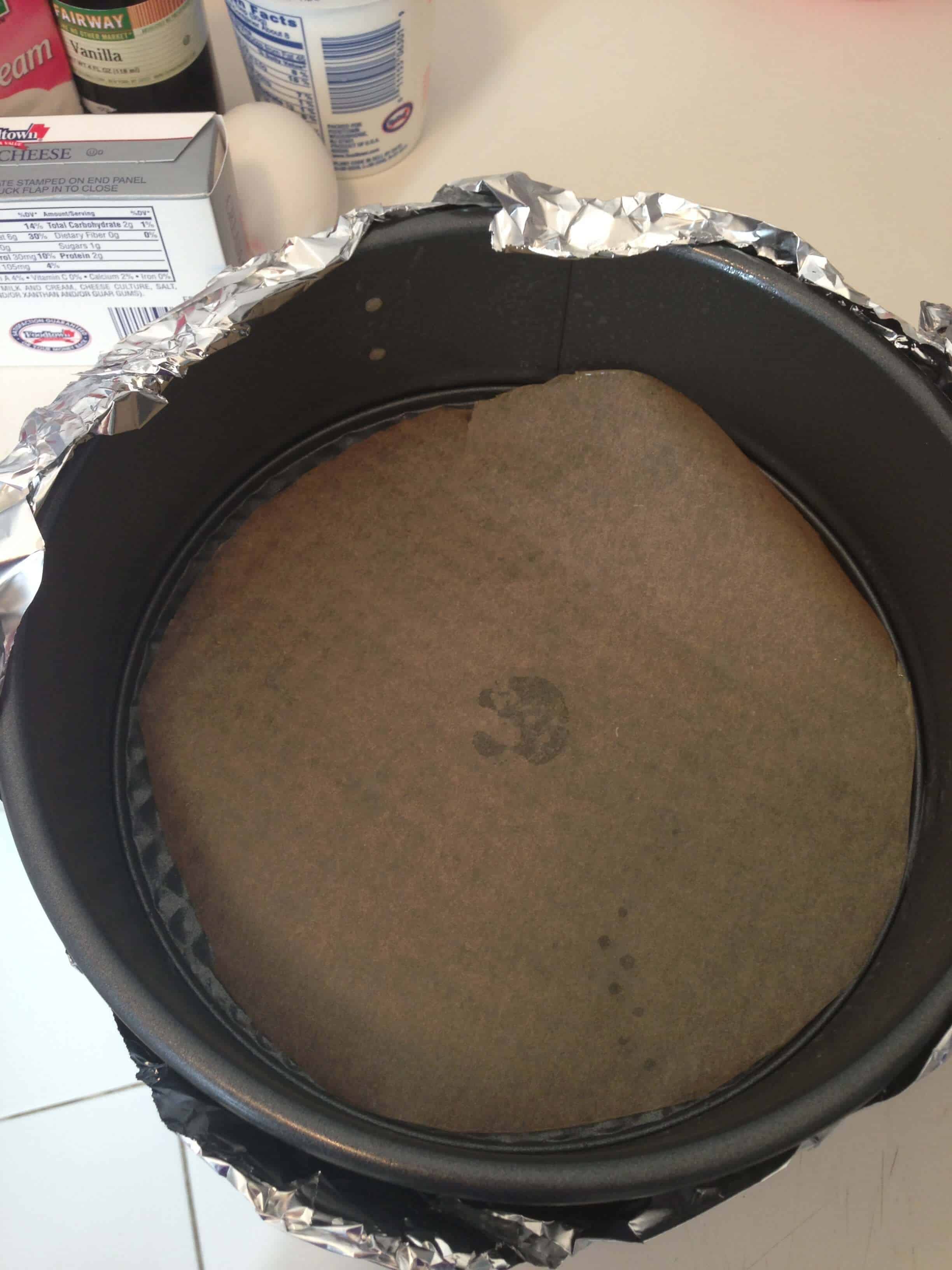 我开始预热烤箱我到325华氏度,并放在烤箱我的下第三架一个大烤盘。我把水水壶放在炉子上烧开,再喷加衬我的9寸的弹簧形平锅不粘用喷雾和圆形羊皮纸。我缠底部和向上锅的侧面箔的双层(以密封它,以便从水浴中水不会渗入锅)。
