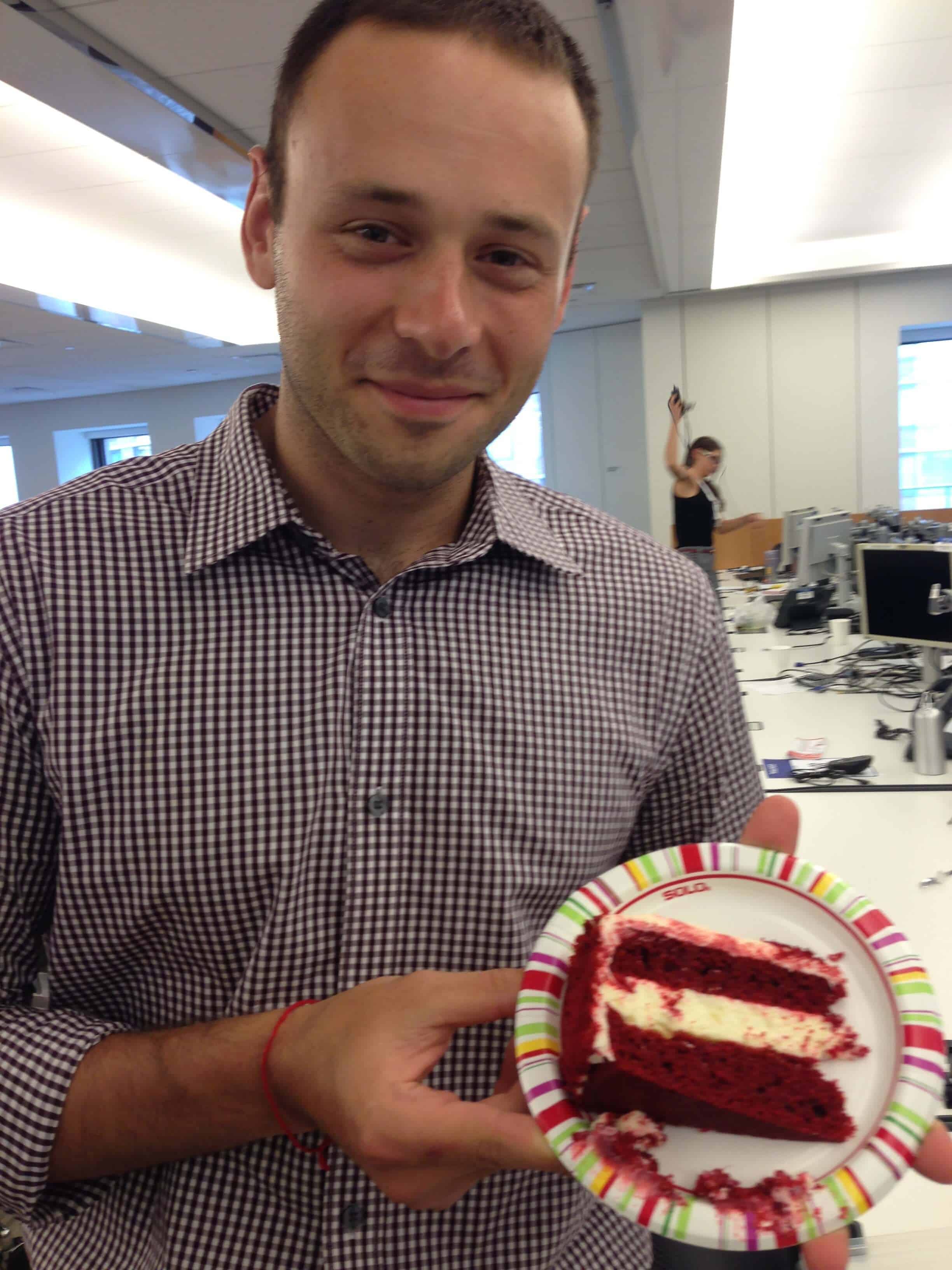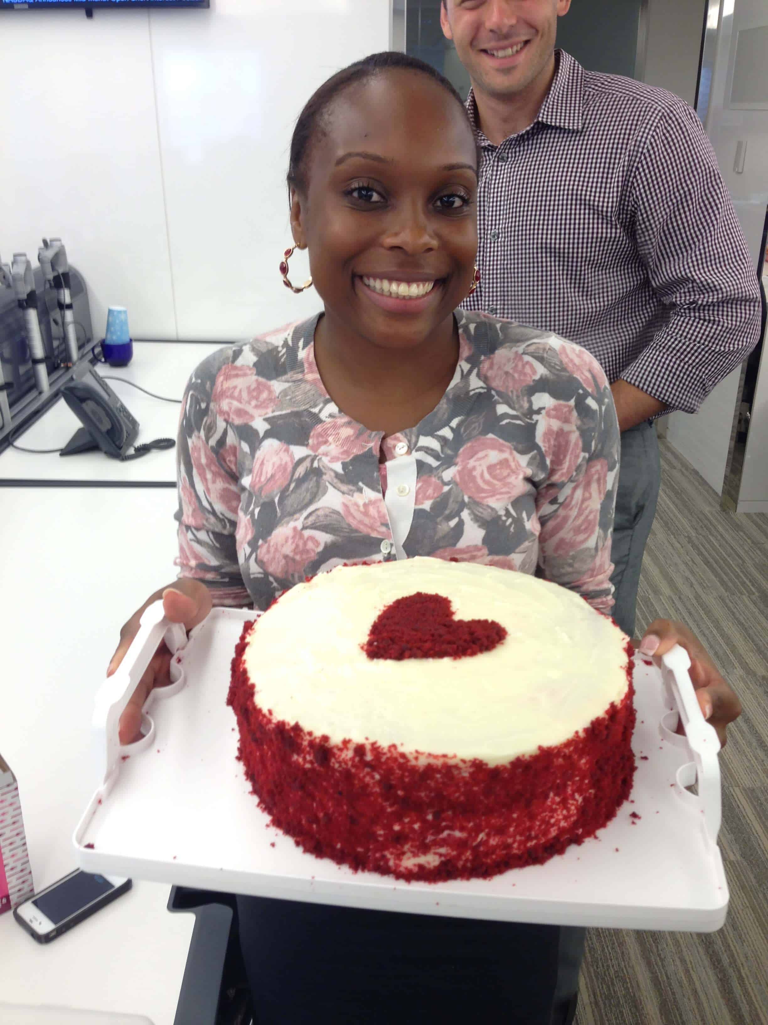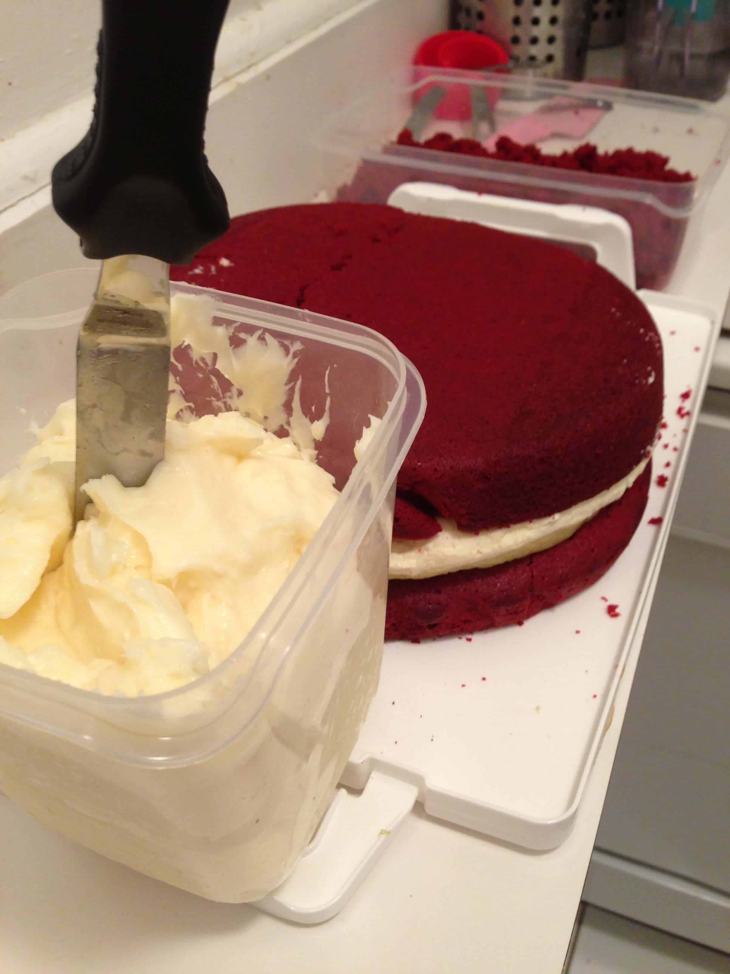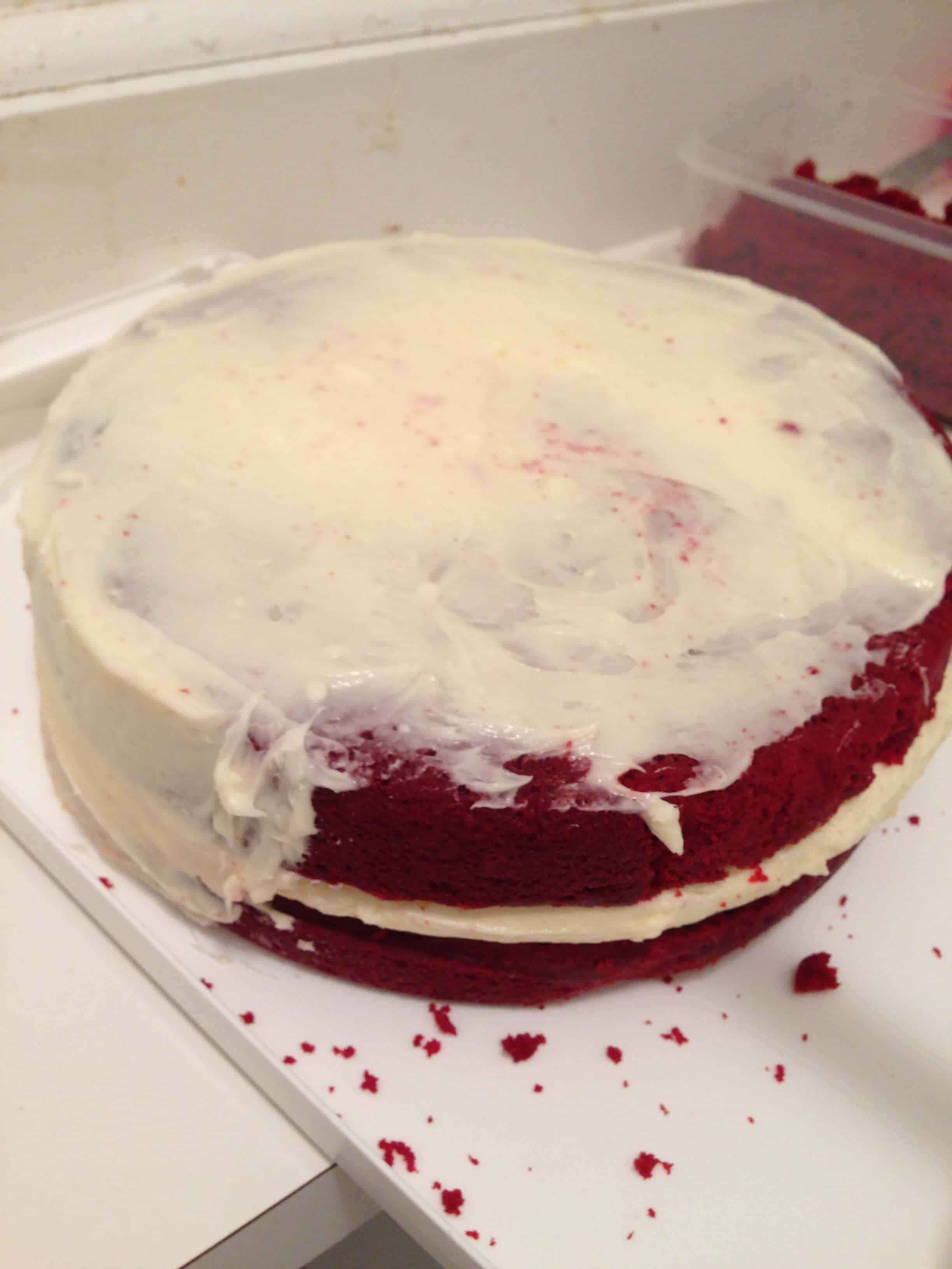 这个蛋糕本质上只是层的乳酪蛋糕二,颓废轮红丝绒蛋糕之间,并配上丰富的,奶油乳酪糖霜。