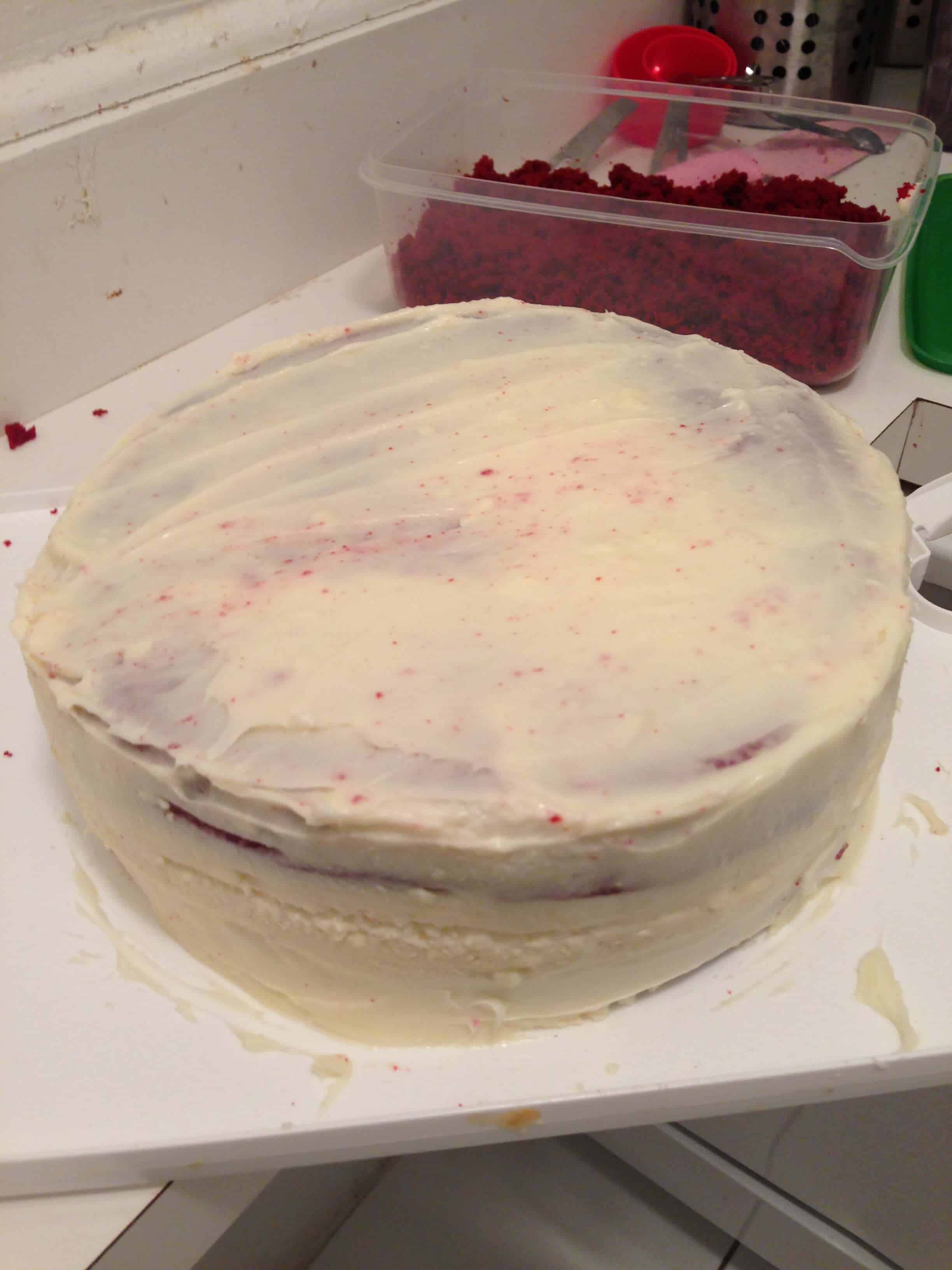 然后是我最喜欢的部分 - 汇编!我放置在我的蛋糕盘的中心一个糕饼层,并除去从冷冻乳酪蛋糕。我摘下盘的两侧,羊皮纸下滑动的刀从锅里取出乳酪蛋糕。我剥离羊皮纸,然后测量针对的糕饼层我的乳酪蛋糕层。如果乳酪蛋糕层原来是一个稍大轮比蛋糕,它移动到砧板,轻轻刮去一些乳酪蛋糕的外部以得到它的大小相同蛋糕层。我非常有我的层是相同的大小幸运的,但拉平红色天鹅绒轮的顶部,使均匀层。我保留了截止顶部,并打破了下来成屑用于装饰。然后我放置在第一滤饼层的顶部上的乳酪蛋糕层,然后把第二饼层上的乳酪蛋糕的顶部。我接着霜冻整个蛋糕,并申请碎屑涂层到滤饼首先要保证一个干净外部(使用长,薄刮刀与结霜的薄且均匀的层完全覆盖蛋糕;每次擦去您的刮刀you are about to dip it back into the bowl. Don’t worry at this point about the crumbs being visible in the frosting on the cake).