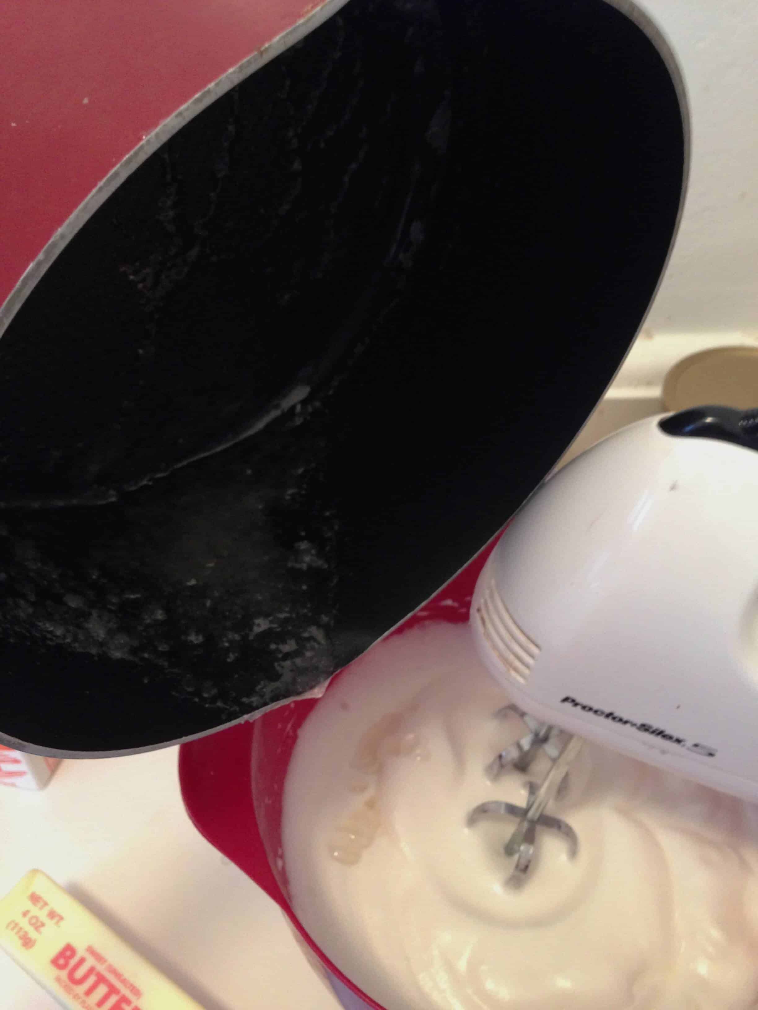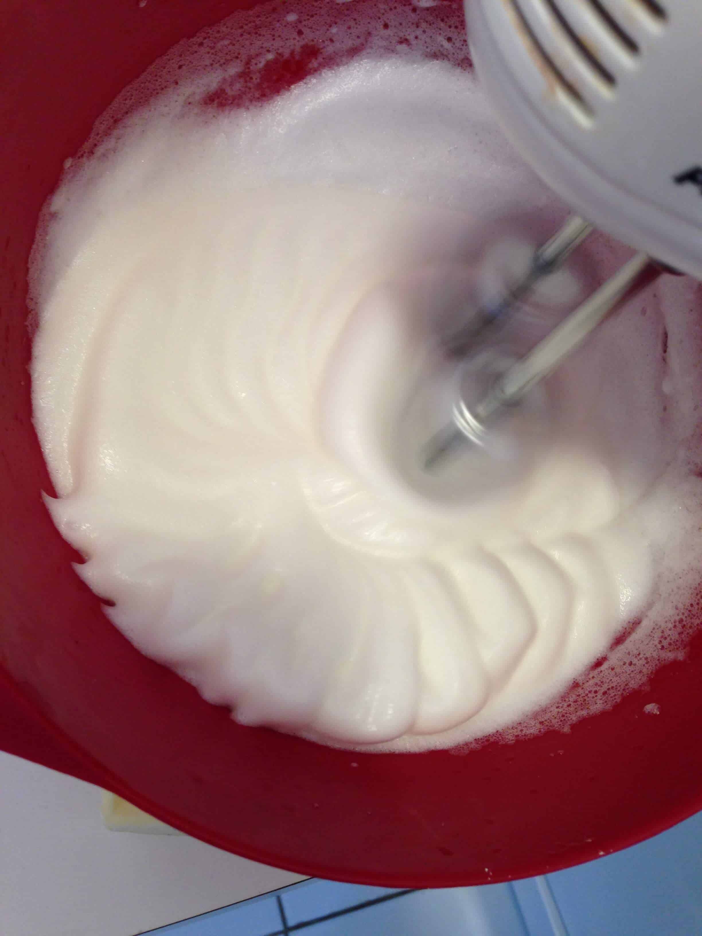 制作马卡龙面糊时,将糖和水放入平底锅加热,直到糖融化。煮4分钟左右,偶尔用湿刷子把糖从边上刷下来(这样糖就不会结晶)。在一个大碗里,用手搅拌蛋白,直到它们形成峰状。慢慢加入热糖浆,同时不断搅拌。搅拌直到混合物变得有光泽。