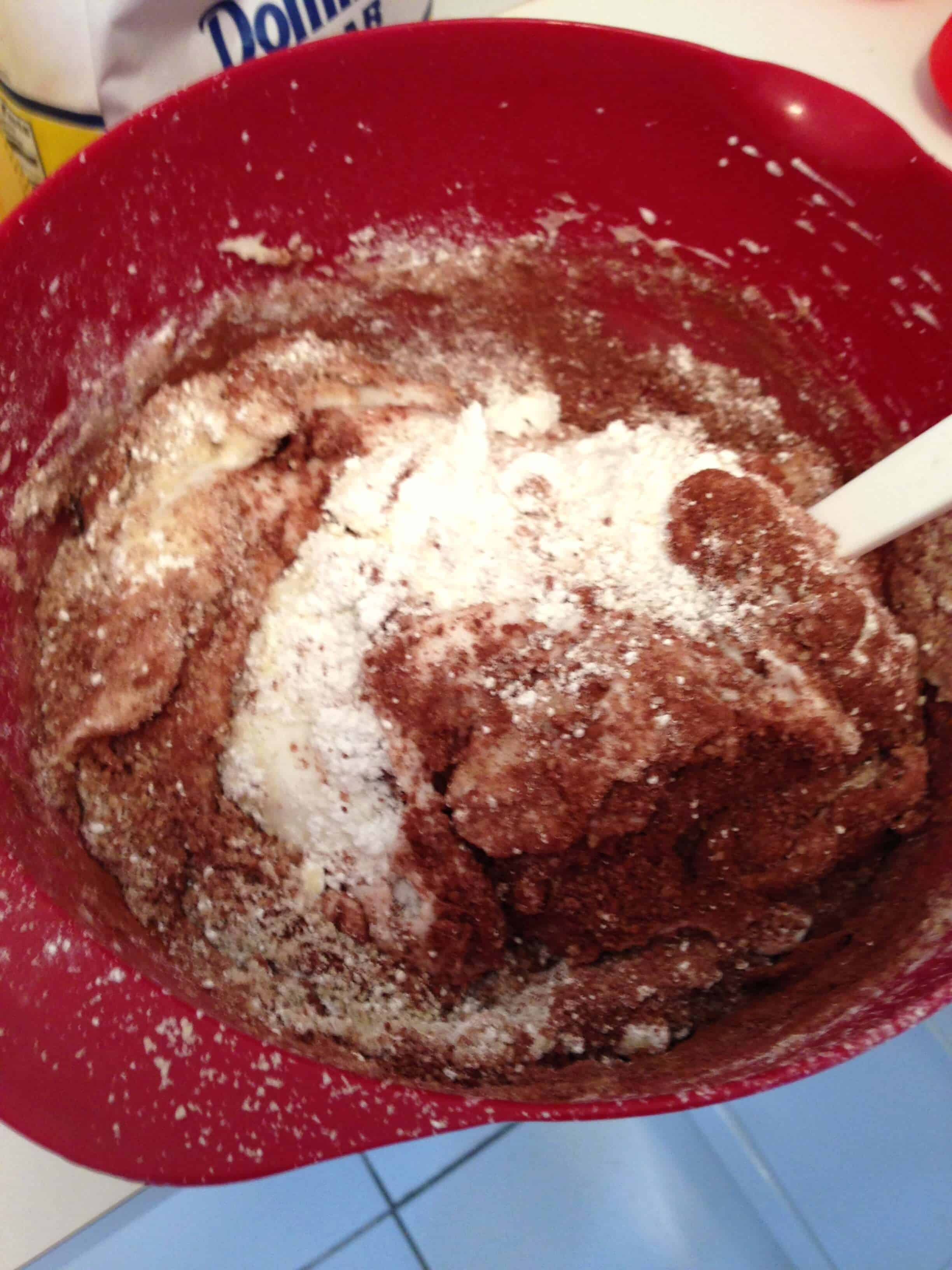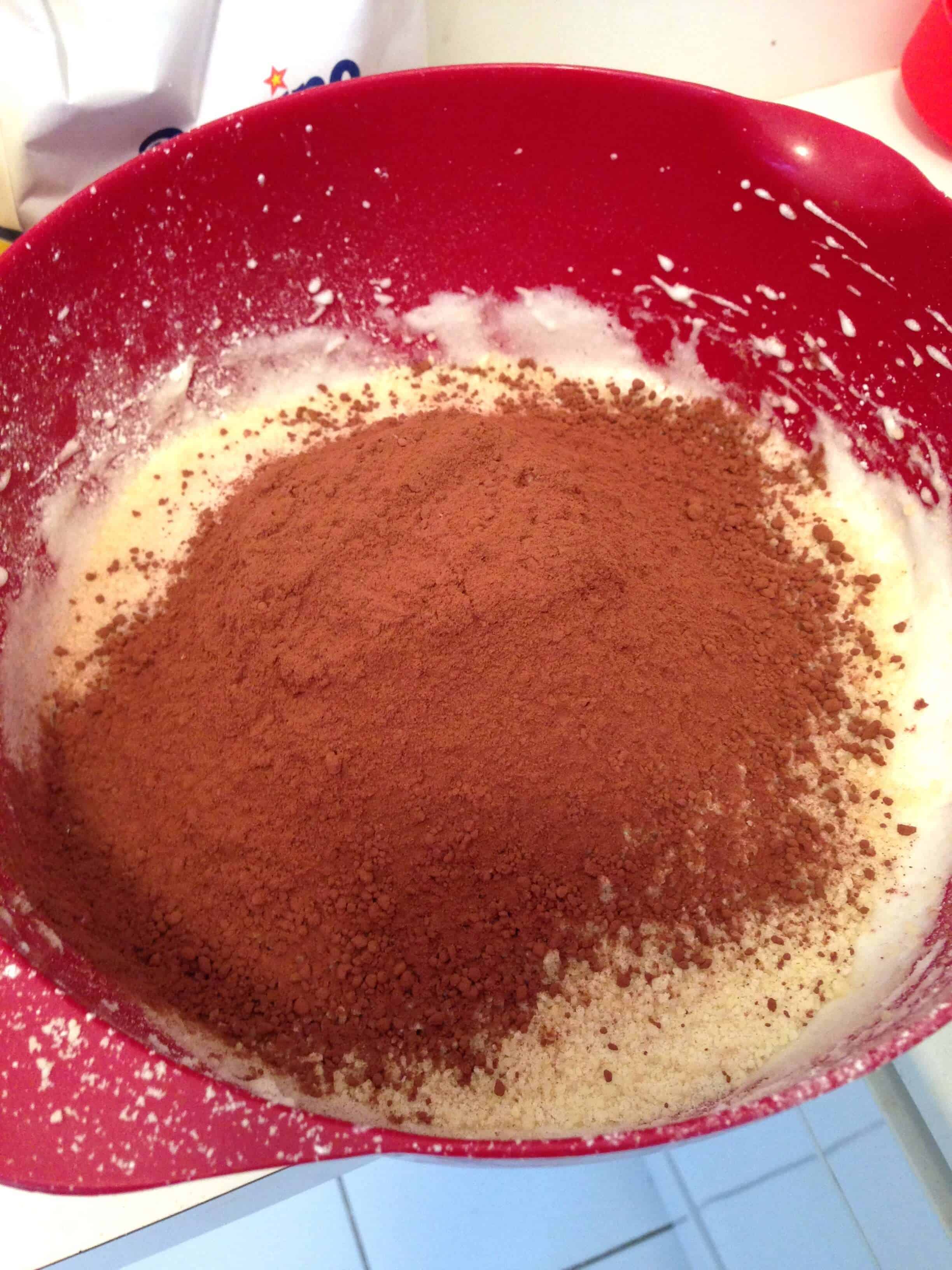 将糖粉、可可粉和杏仁粉筛入碗中。轻轻地把这些混合物加入蛋白霜混合物中,直到所有的东西都融合在一起。