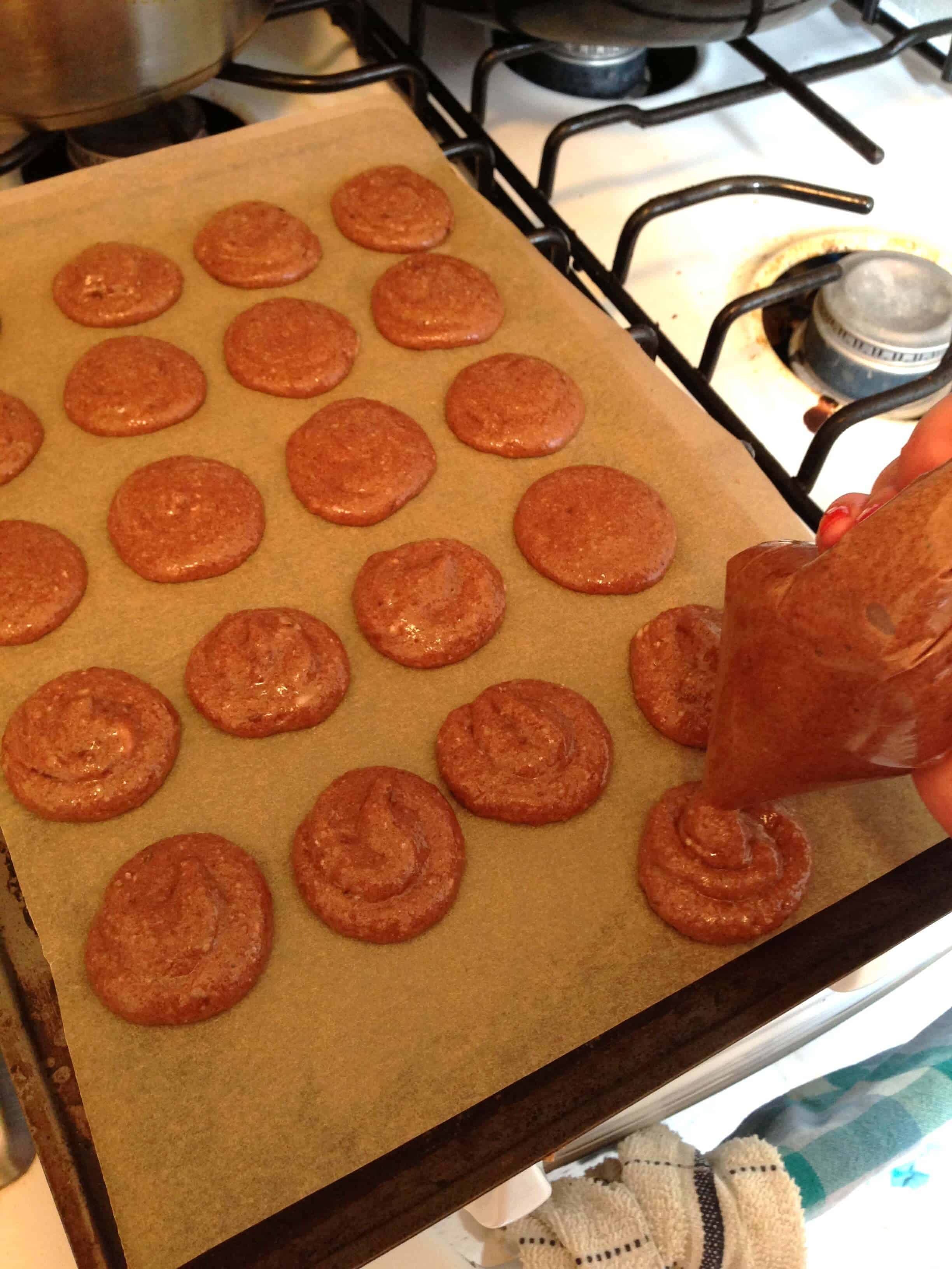 将面糊倒入开孔1厘米的袋中(我用塑料袋把边角切掉),然后将1英寸的面糊放入有内衬的烤盘中。把它们放在一边,直到马卡龙的顶部有了皮(大约30分钟)。