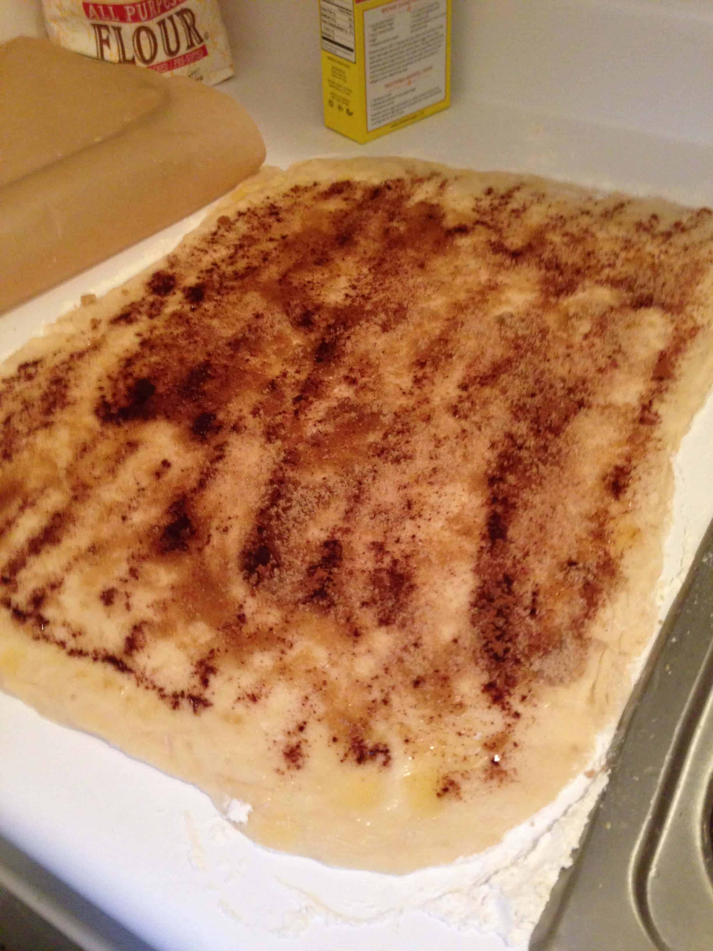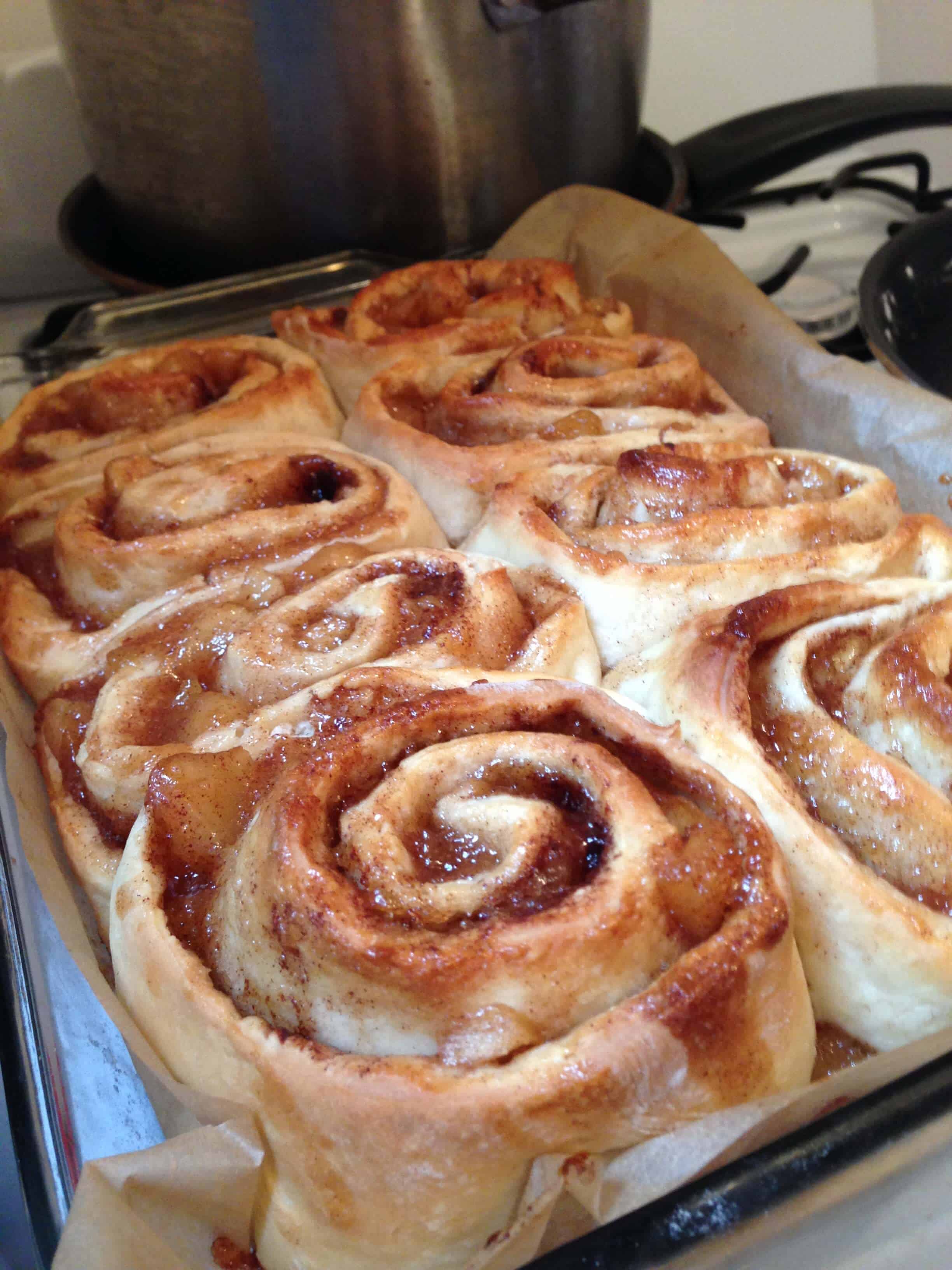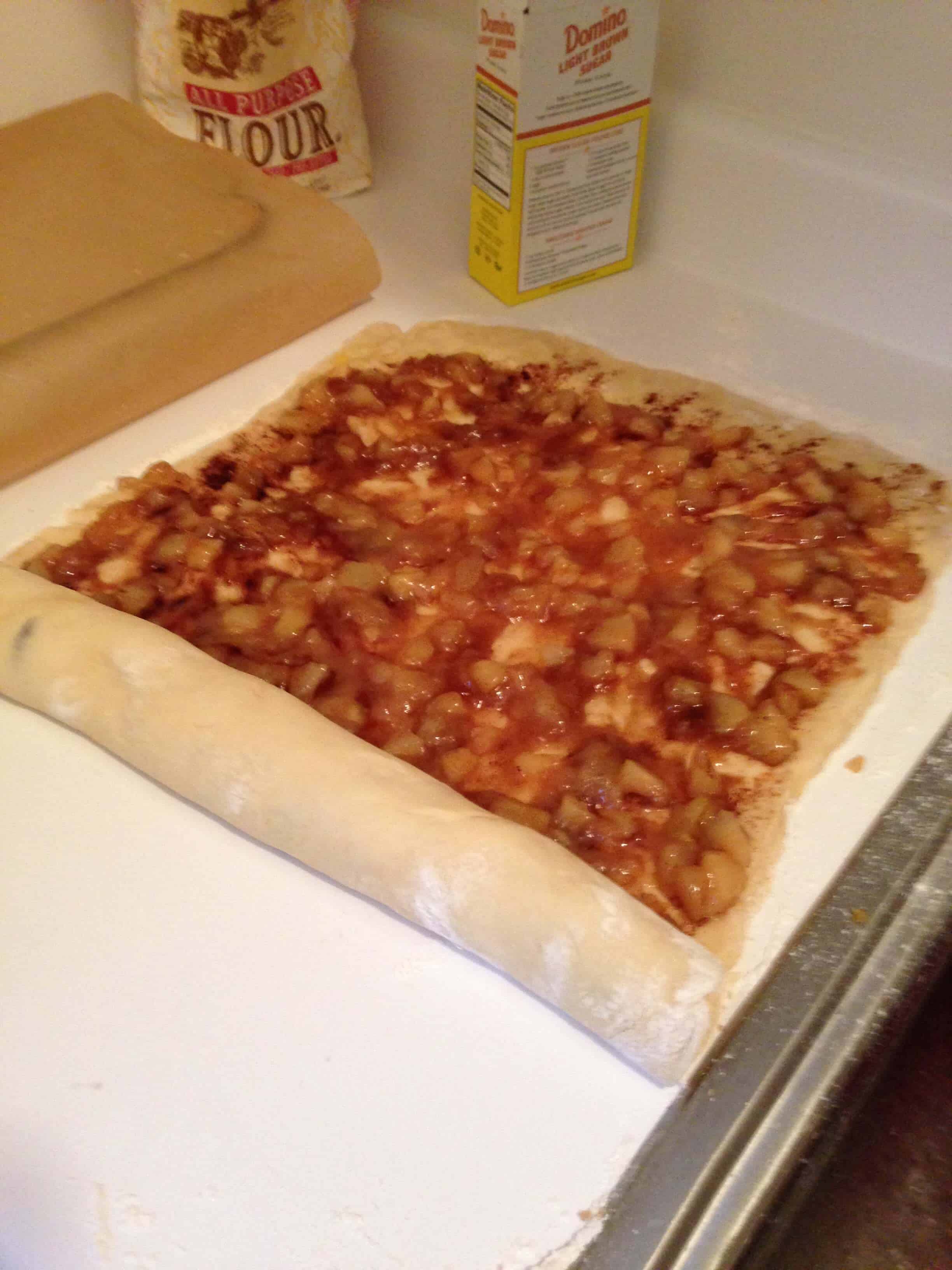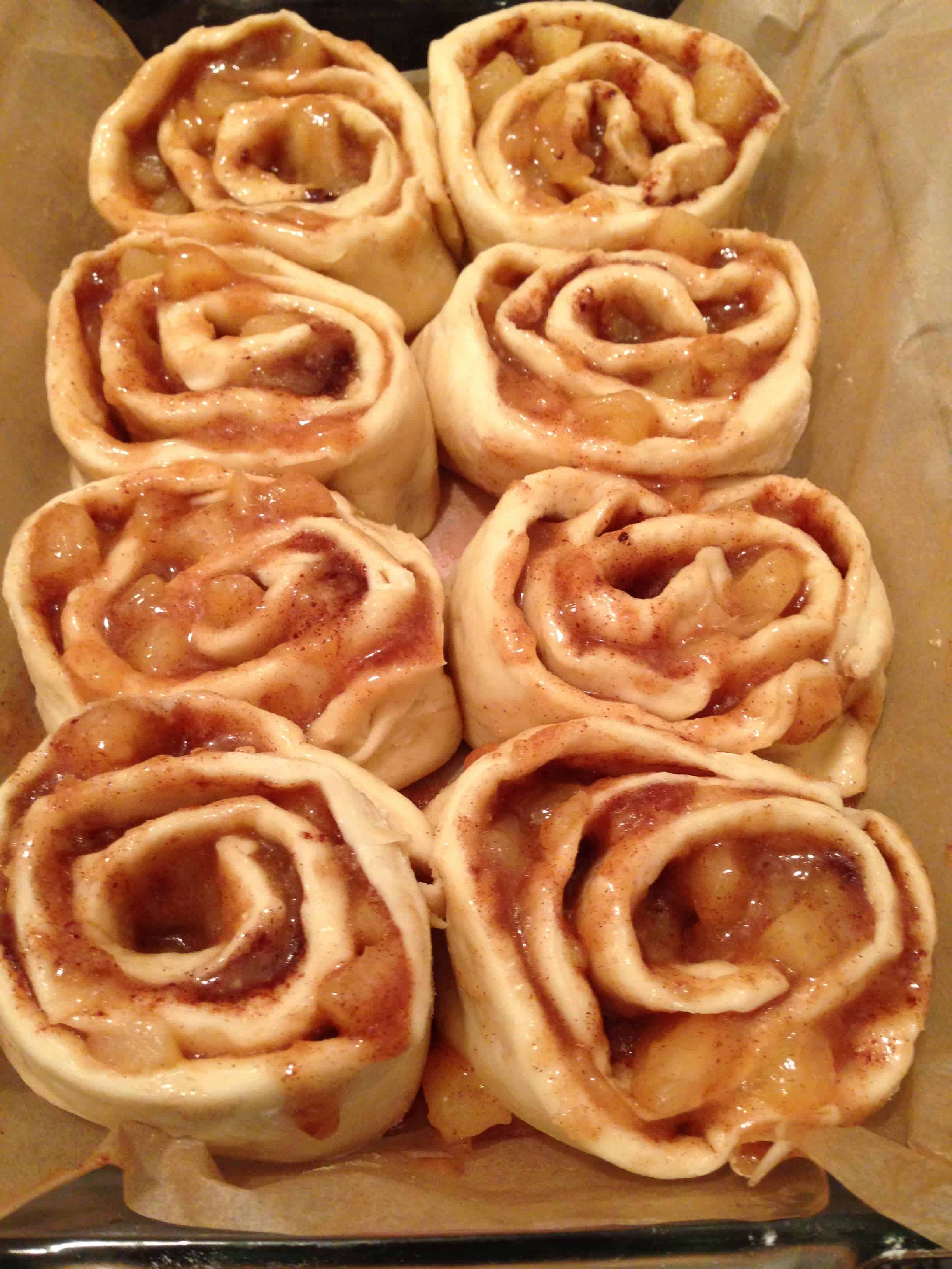 把面团擀成一个大的长方形,直到大约3/4厘米厚。将黄油融化,涂在整个面团上。将红糖和肉桂均匀地撒在面团上,然后在上面盖上苹果派的馅料。从较远的一边将面团水平卷起来。把生面团揉成一团。把生面团切成8等份(如果你想要更小的肉桂卷,你可以把它切成更多的皮),放在一个抹油的锅里,在每个面包卷之间留出半英寸。用涂了油的保鲜膜覆盖,让它们再次发酵(大约30分钟)。在350度下烤30-35分钟,或者烤到面包卷变成金黄色,中间看起来很硬。带着潮湿的苹果馅料,你要确保它们煮透了,否则会变湿的。烤面包卷时,准备糖霜和焦糖酱。