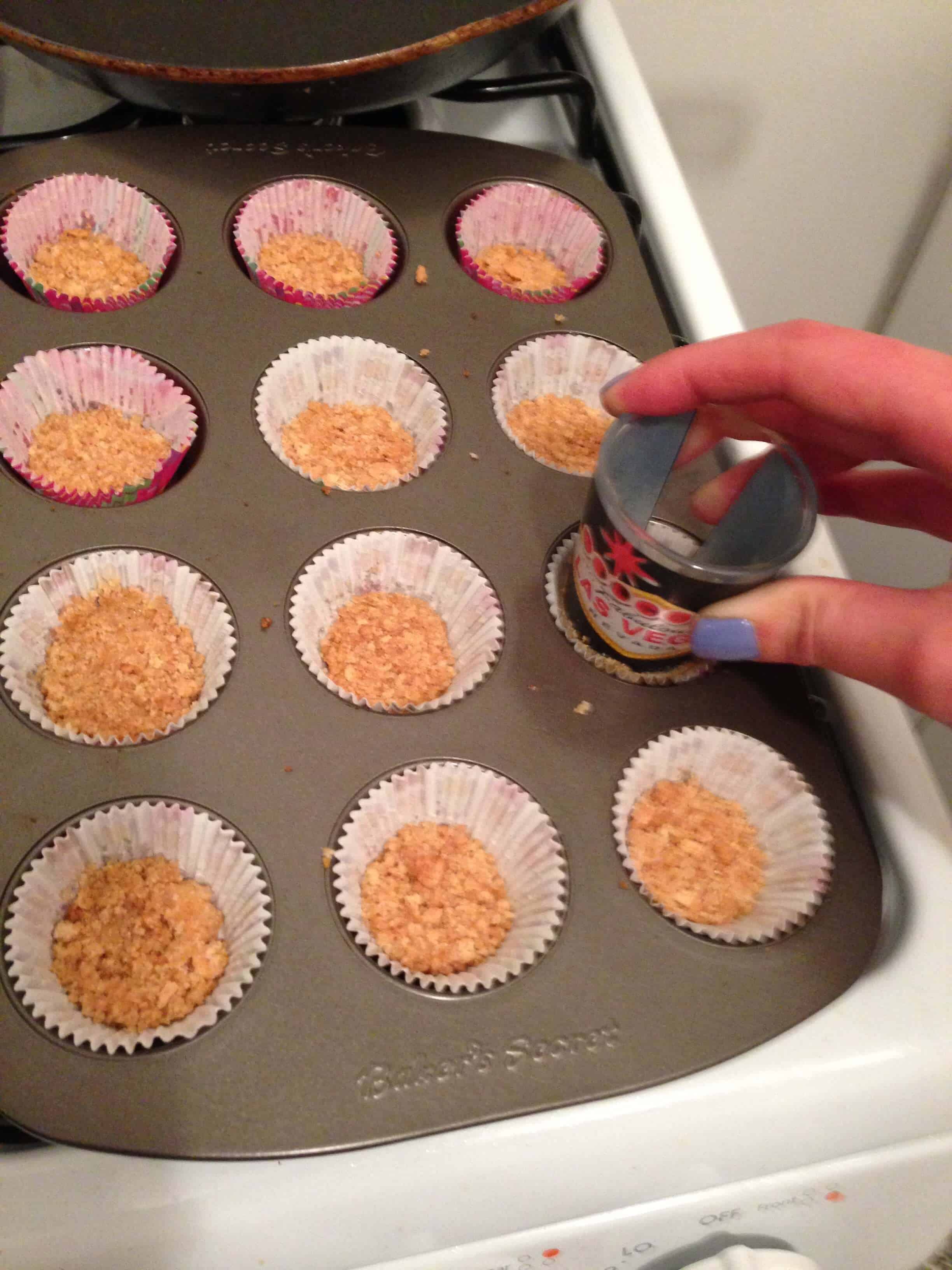将烤箱预热到350华氏度,并用烤杯排列在蛋糕罐。粉碎全麦饼干的套筒成细屑。您可以使用食物处理器,如果你有一个,或者简单地将饼干在一个塑料袋里,并用扁平的物体粉碎他们。我使用的金属杯的底部。倒入屑进入一个中等大小的碗里,加入融化的黄油和糖。混合直到碎屑均匀地涂在黄油中,勺子将混合物的一汤匙到每个杯形蛋糕衬垫(1茶匙为迷你蛋糕)。使用一个镜头玻璃(或其它平底对象),按下所述麦饼干屑,以形成在每个衬垫外皮。让这些烤5分钟,然后冷却他们完全允许地壳变硬。