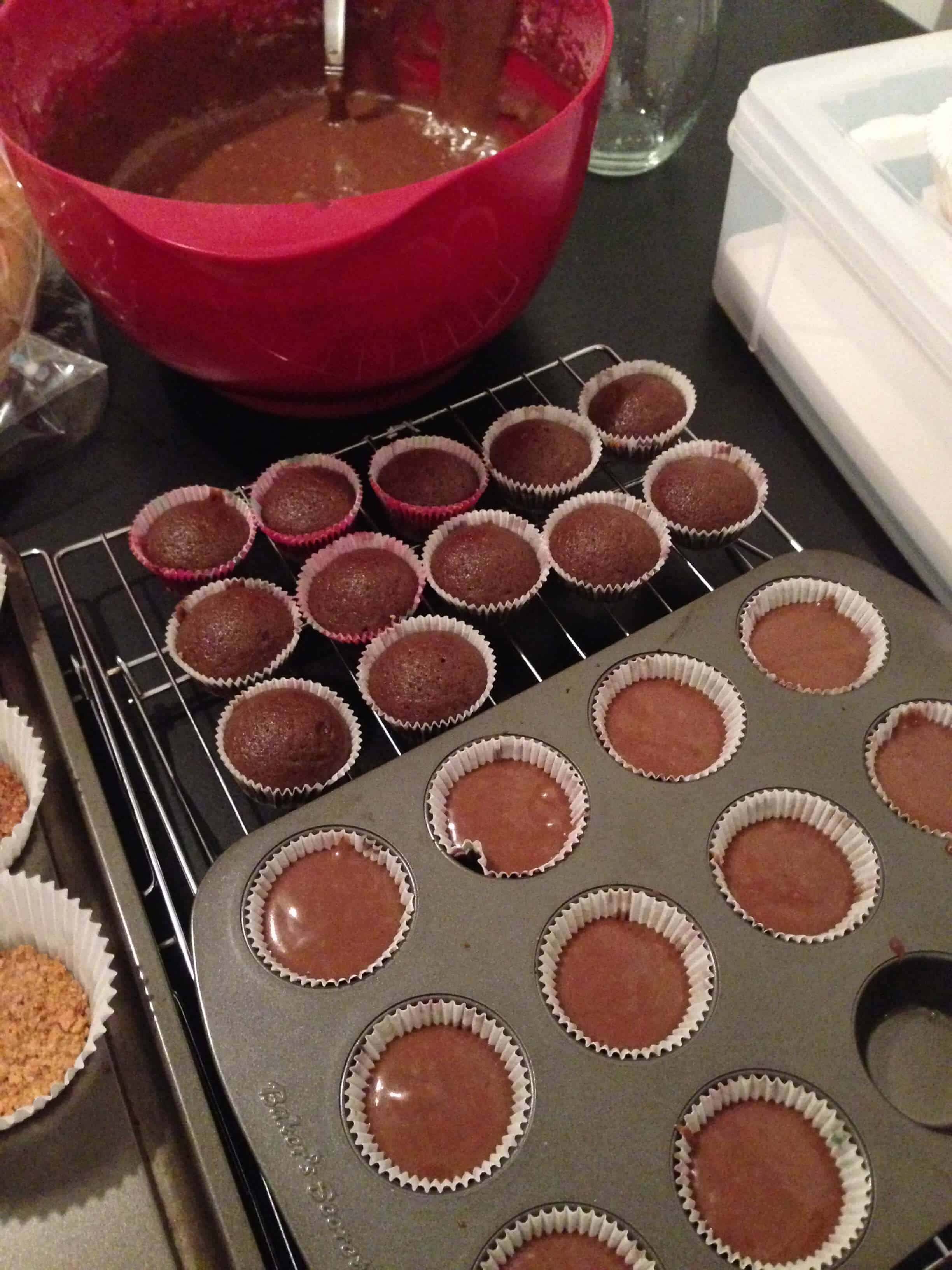 由于全麦饼干结壳烘烤,开始做面糊。在一个大碗里,一起搅拌面粉,糖,可可粉,小苏打,泡打粉和盐。加入鸡蛋,咖啡,牛奶,植物油,和香草精和节拍为中速2-3分钟,直到成分完全合并。面糊会有点runnier比普通蛋糕面糊。填写完全的方式,每个蛋糕内衬2/3,烤15-18分钟(约10分钟的迷你纸杯蛋糕),或直至插入蛋糕牙签出来干净与一些面包屑。让蛋糕结霜之前冷却。