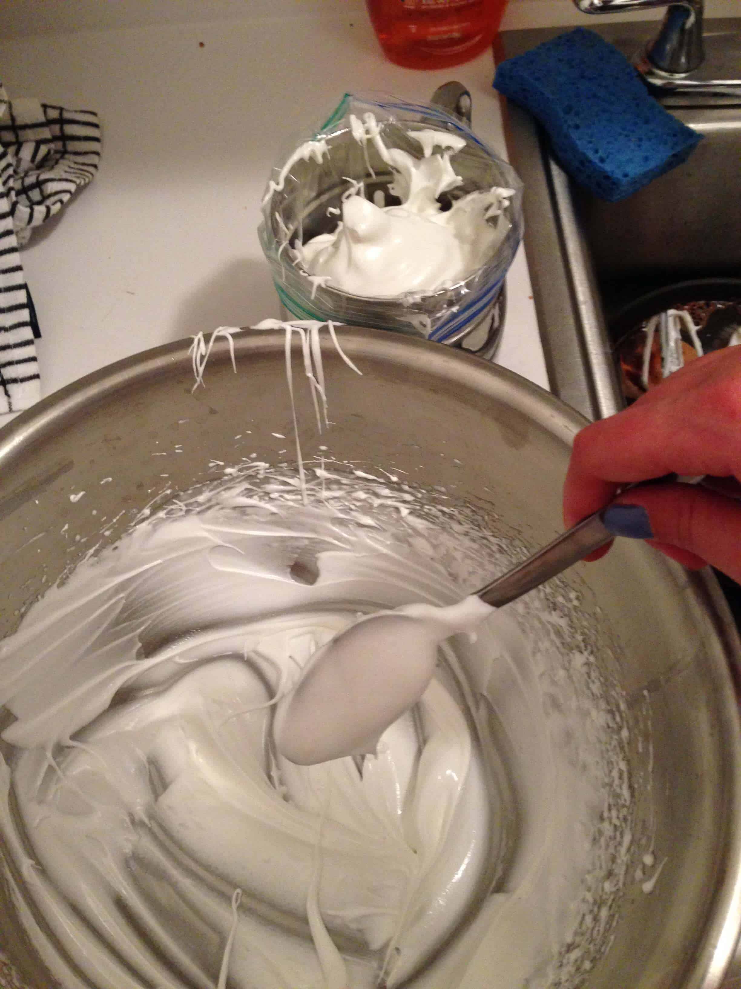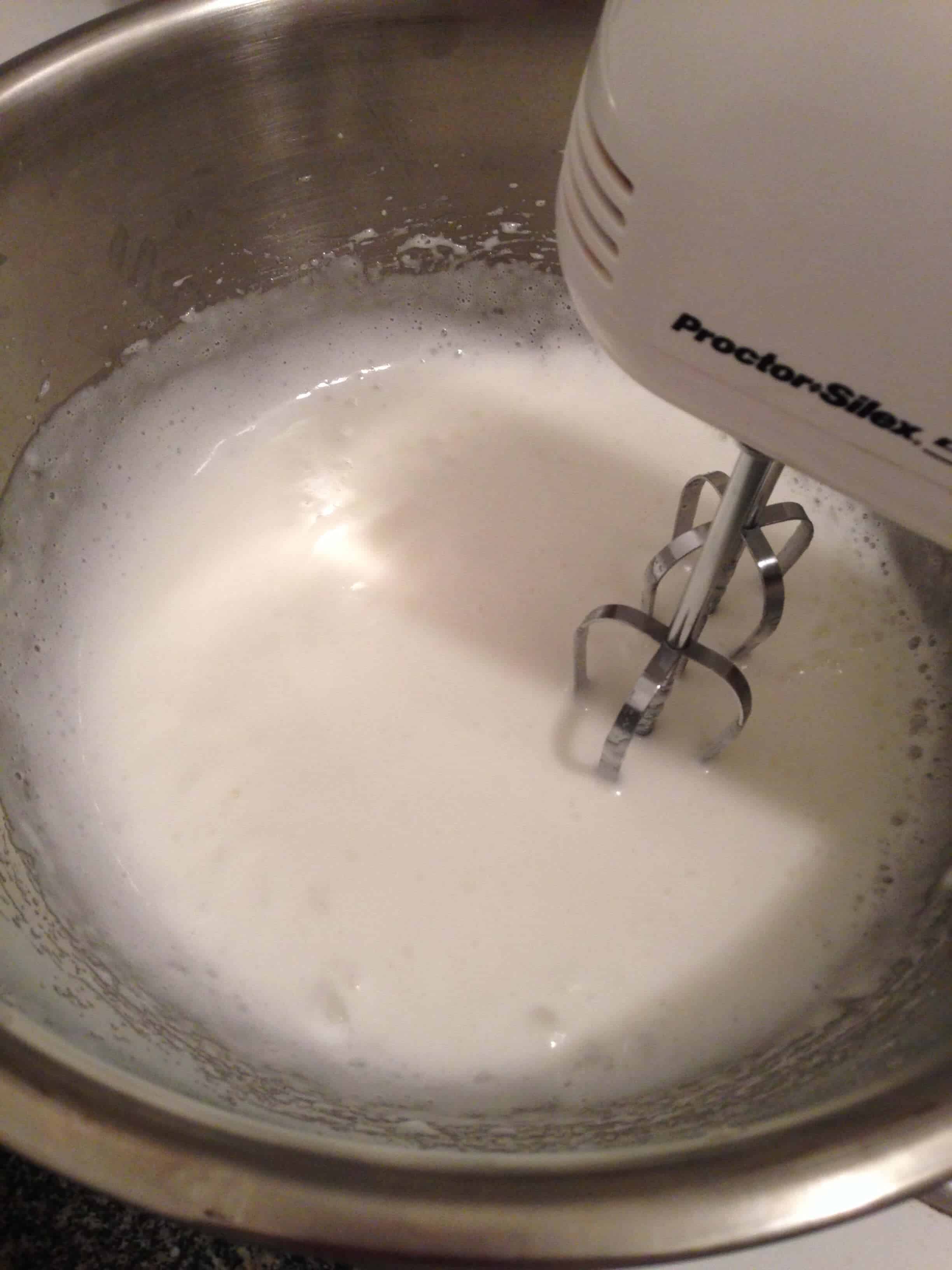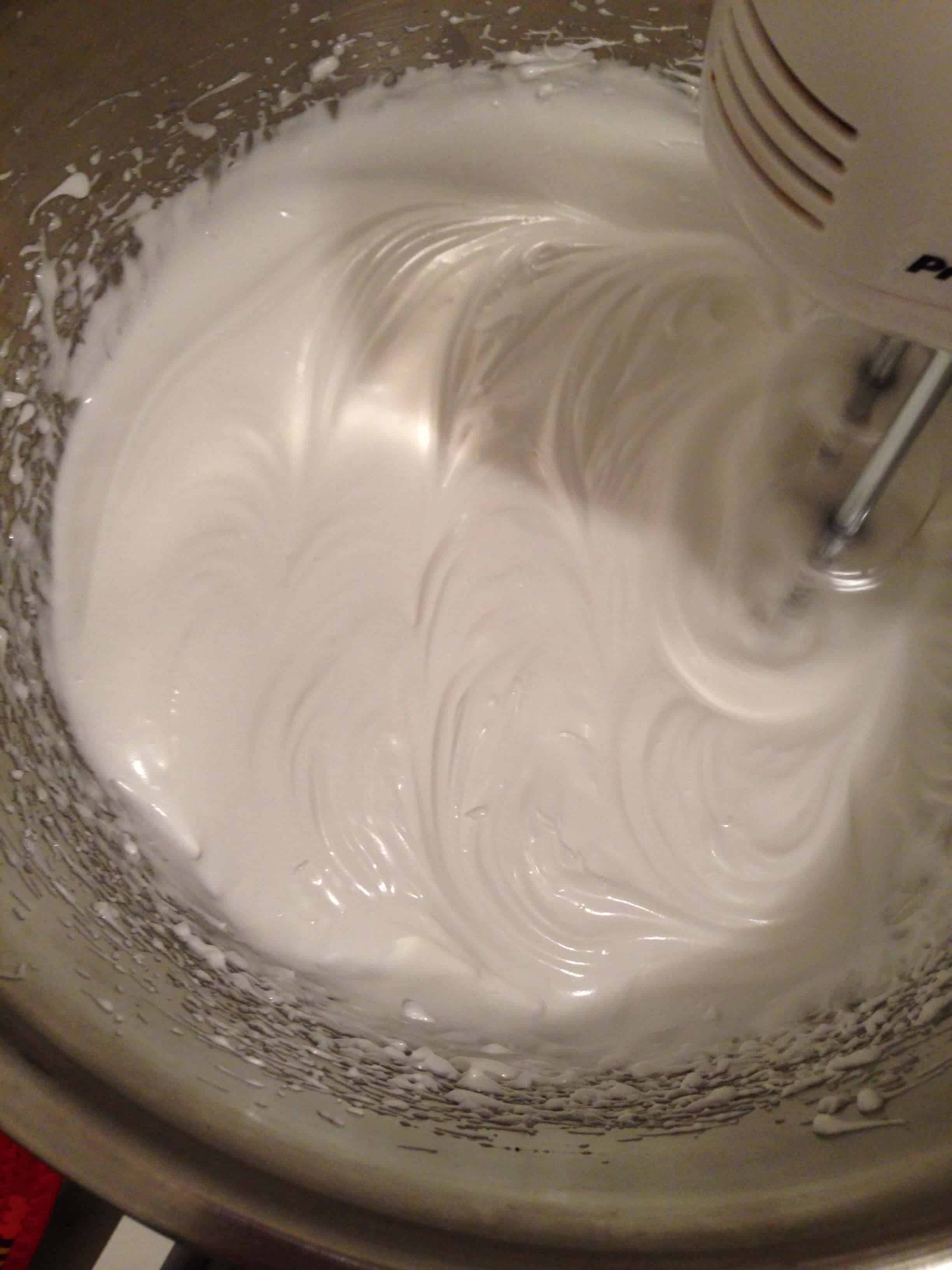 在双层锅,一起搅拌蛋清和糖,直到糖完全溶解,蛋清是温暖的触感,约2-3分钟。从火上移开,并继续殴打,直到蛋清形成坚硬,闪亮的峰值(约5分钟)。