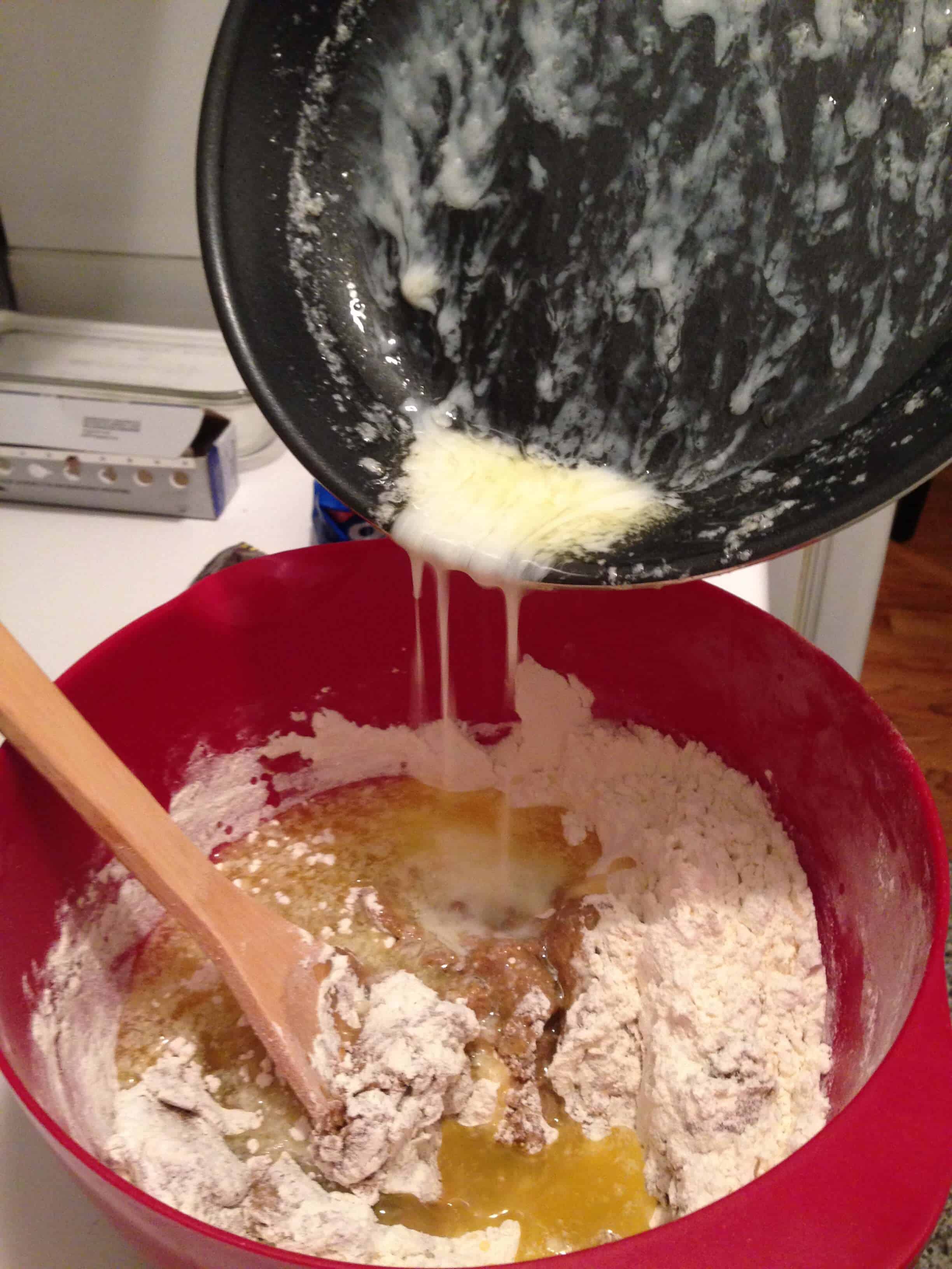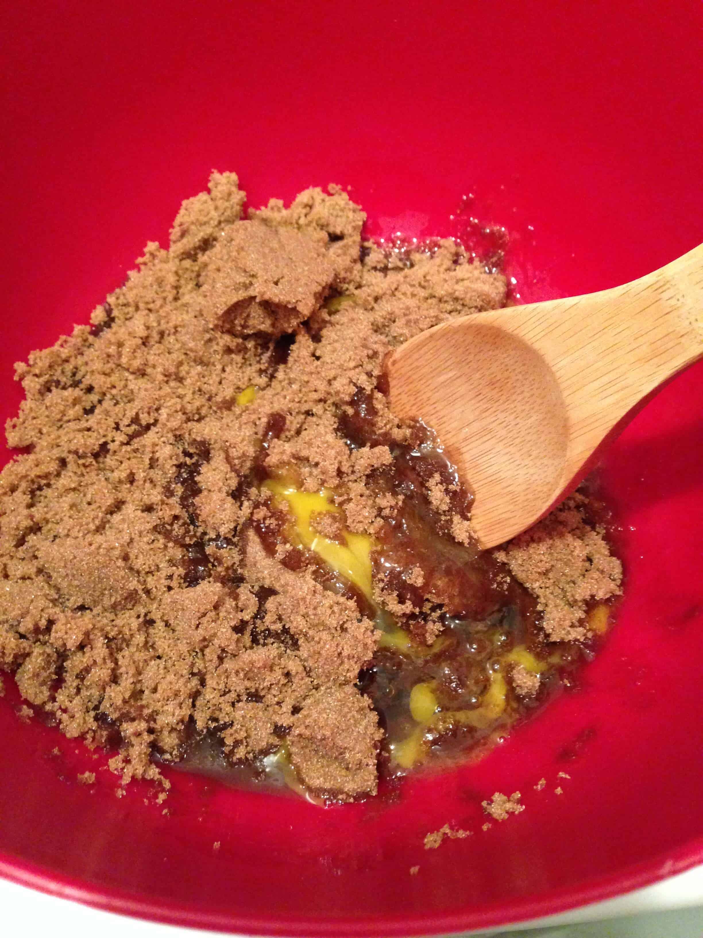 将烤箱预热到华氏350度,用小火融化黄油,待其冷却。把鸡蛋打到一个大碗里,加入红糖和一杯面粉。混合,然后加入第二杯面粉。倒入融化的黄油和香草。搅拌直到所有材料完全混合。