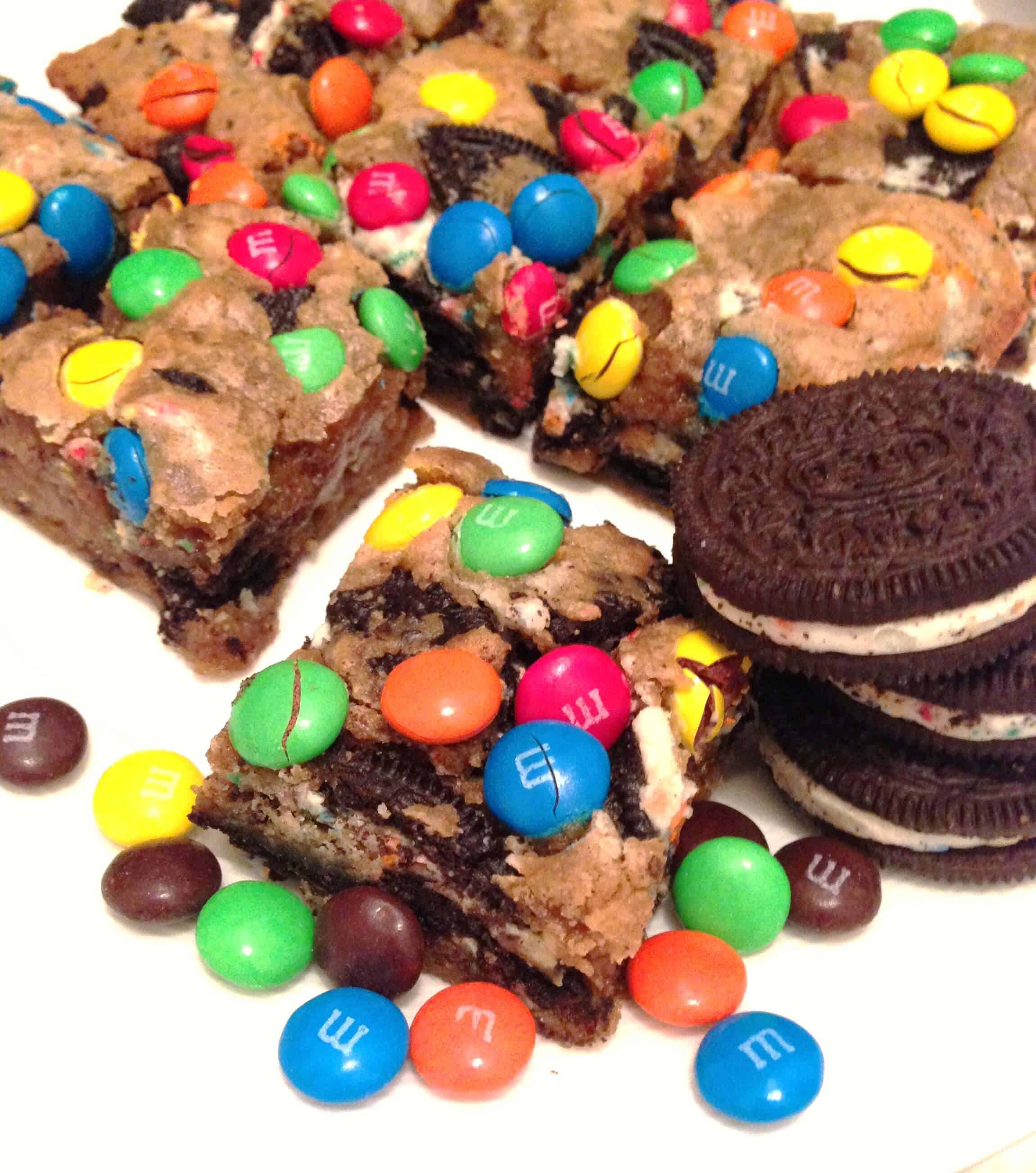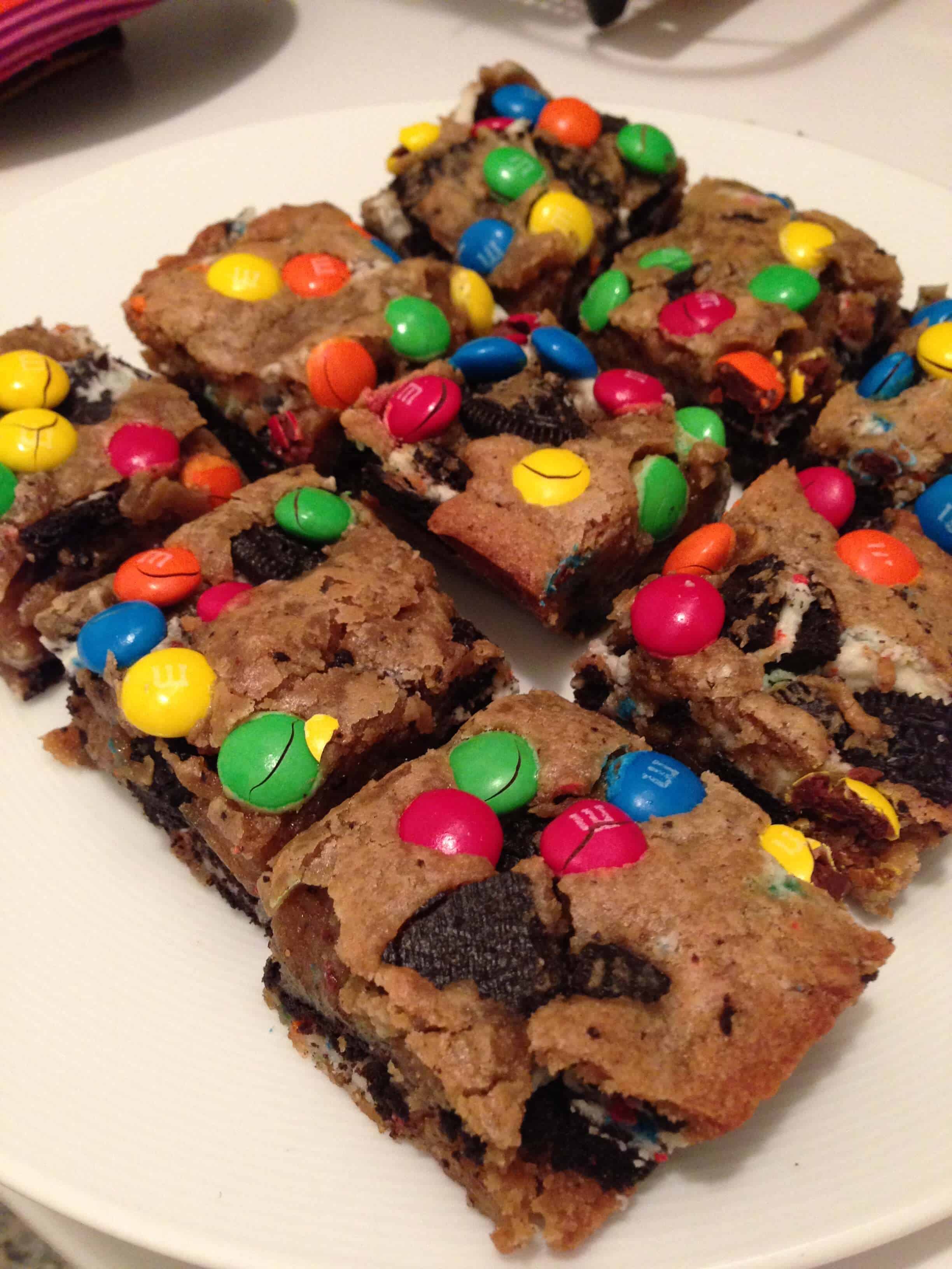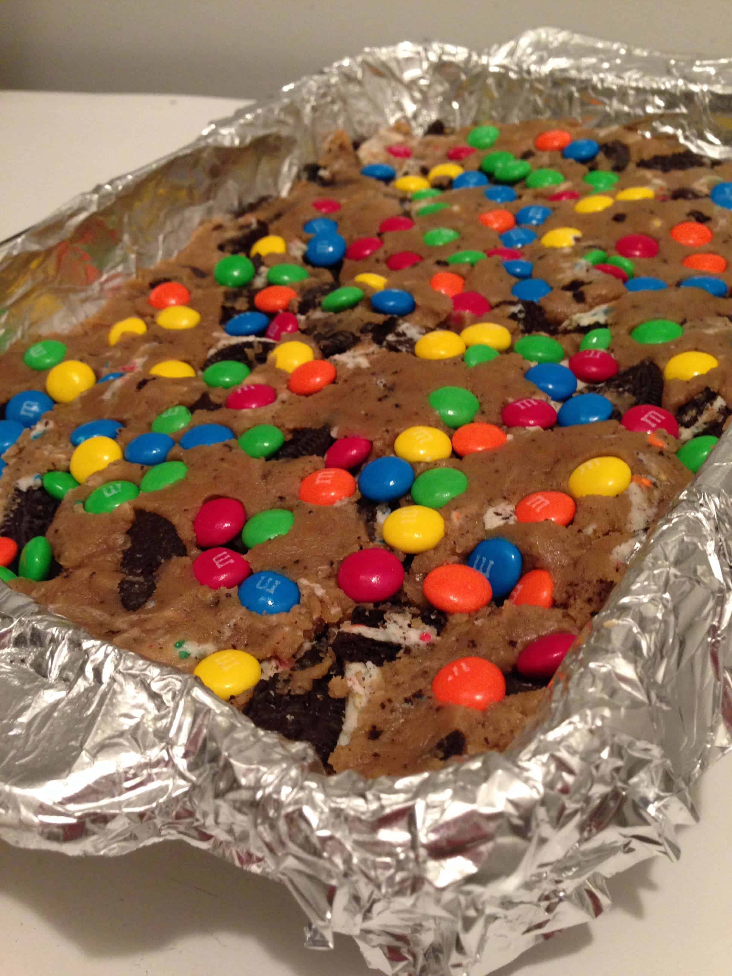 加入奥利奥,轻轻搅拌,直到奥利奥均匀分布。将面团放入抹油的8英寸烤盘中。x 13英寸),然后在上面撒上m&m巧克力豆。轻轻地将m&m巧克力豆压入面团中。烤28分钟,或者直到边缘变成金黄色。完全冷却后再切,食用。