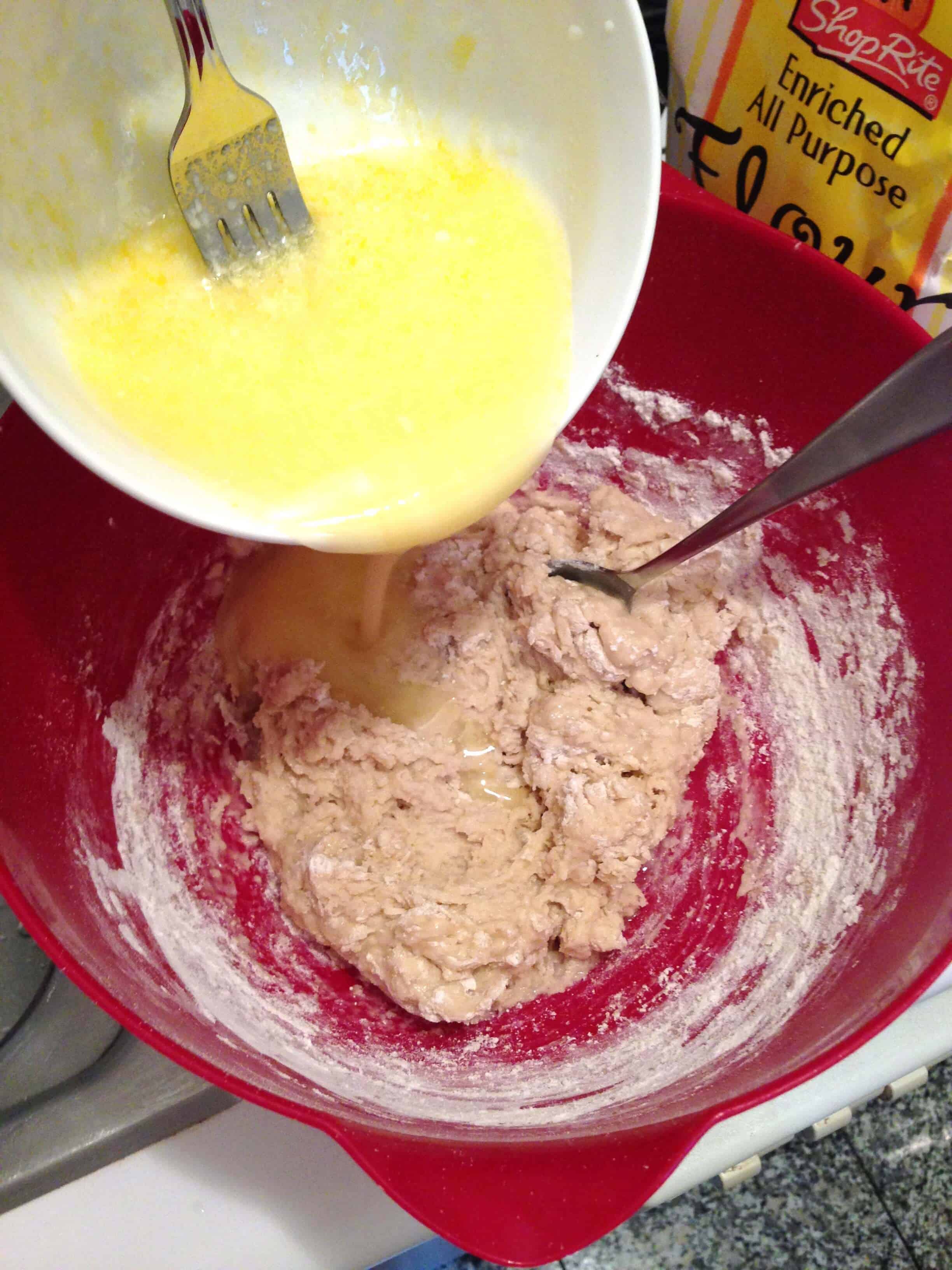 在一个大碗里,将水、酵母和一汤匙砂糖混合。搅拌,搅拌5分钟左右。当混合物看起来有泡沫的时候,加入剩下的糖和盐。在另一个碗里,我加入了酪乳、油和鸡蛋。搅拌材料直到鸡蛋和其他材料融合在一起。倒入酵母混合物,搅拌至混合。倒入两杯面粉,用勺子搅拌,直到所有材料混合在一起。慢慢加入剩下的面粉,搅拌直到面团清洁碗的边缘。在撒了少许面粉的表面上,用手揉面团大约10分钟。将用来检验面团的大碗抹上油脂,然后盖上抹布。 Let the dough rise for about an hour (until dough had doubled in size).