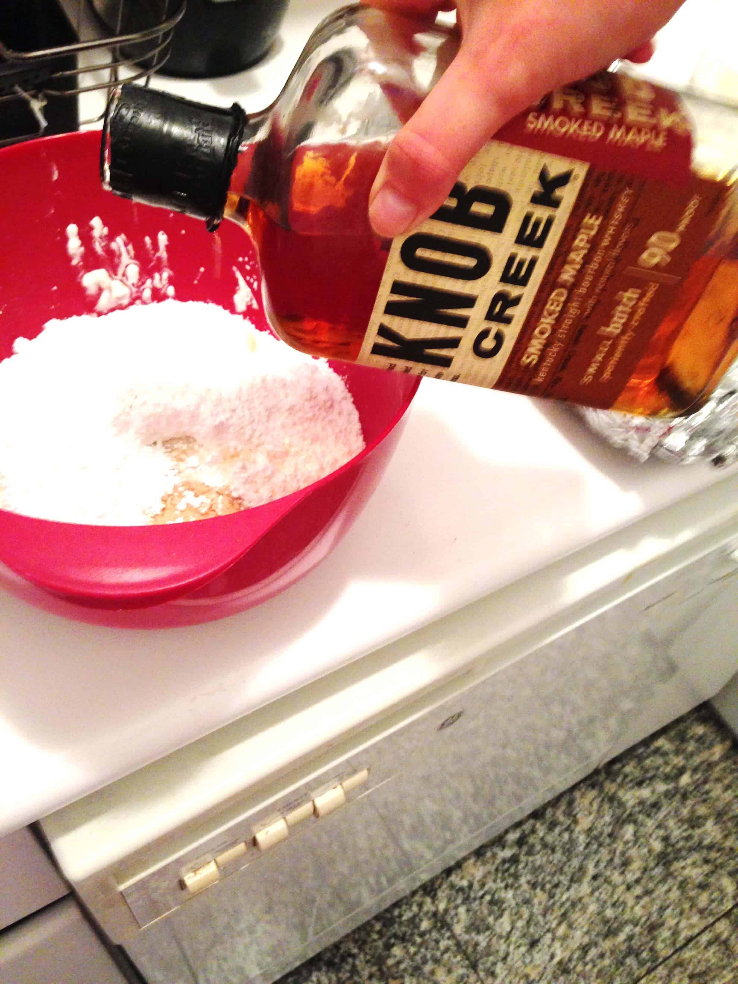 当面包卷升起的时候,用搅拌机把奶油芝士和黄油混合在一起。加入香草、玉米糖浆、柠檬汁和枫木波本威士忌。混合,然后分两次加入糖粉。