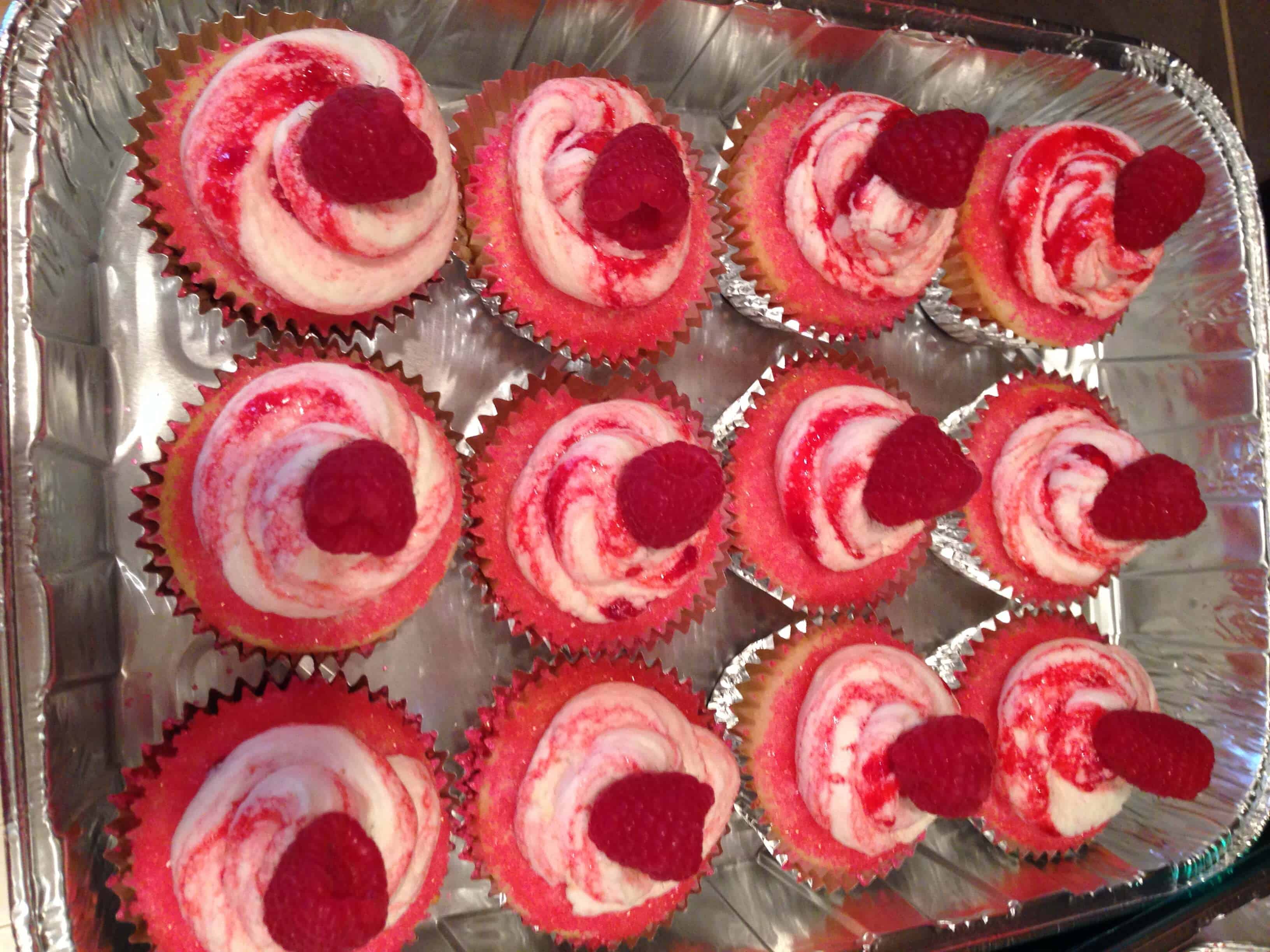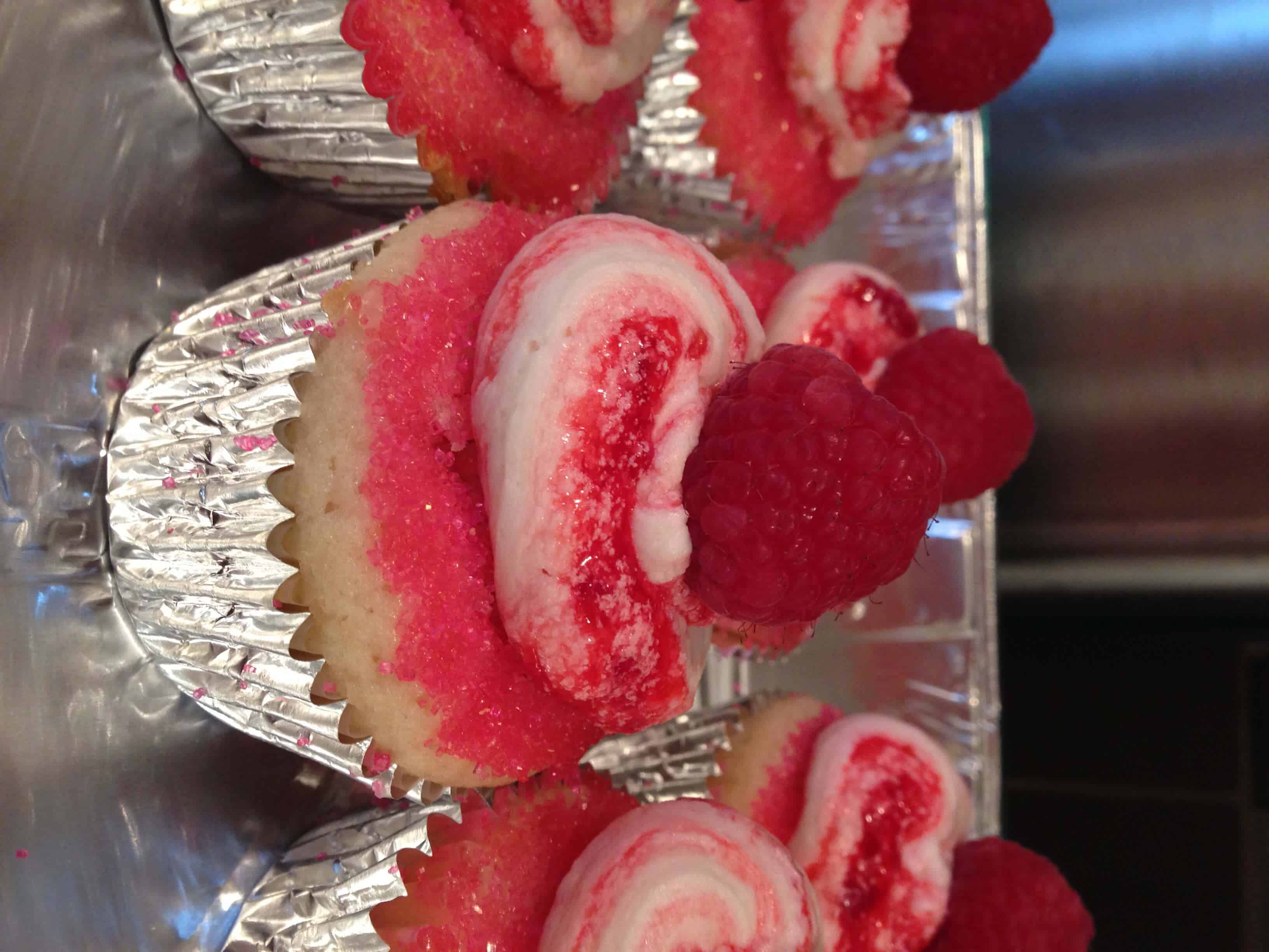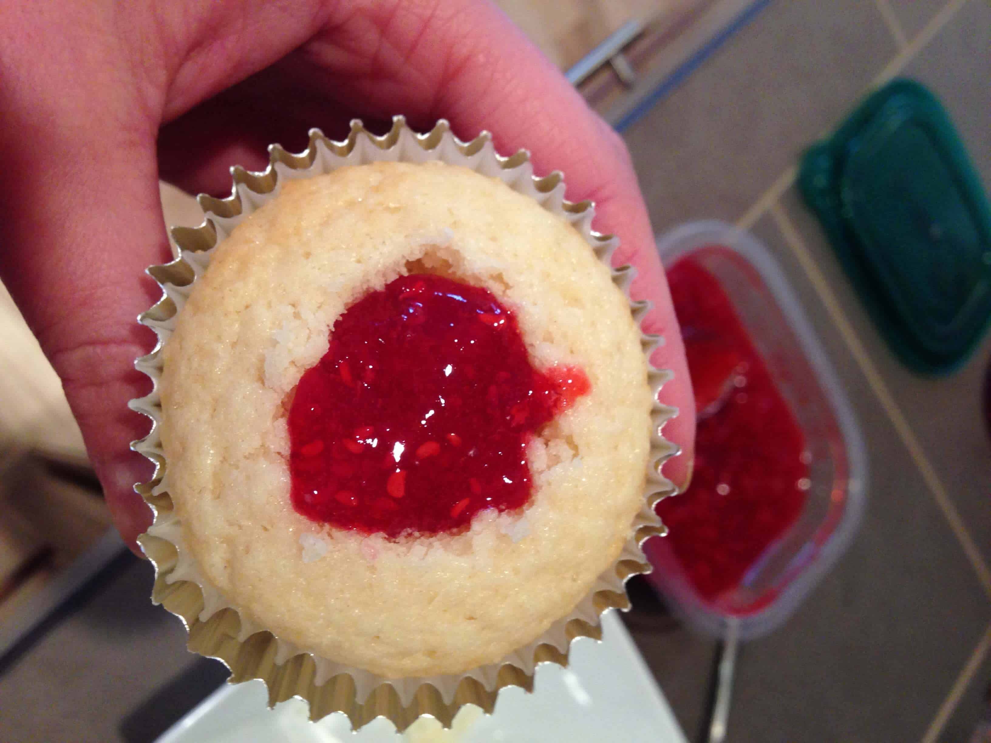 霜冻的蛋糕,补保鲜袋包(我没有在我妹妹家的任何结霜袋或装饰提示)与结霜,并添加果酱。轻轻移动卡纸绕包,直到它已被均匀地扭曲成结霜。切割袋的尖端来创建一个3/4英寸开口,并且管的结霜到杯形蛋糕。与顶部的树莓完成的蛋糕。他们尝到了厉害!话又说回来,任何事情我做我妈妈的酱总是味道鲜美