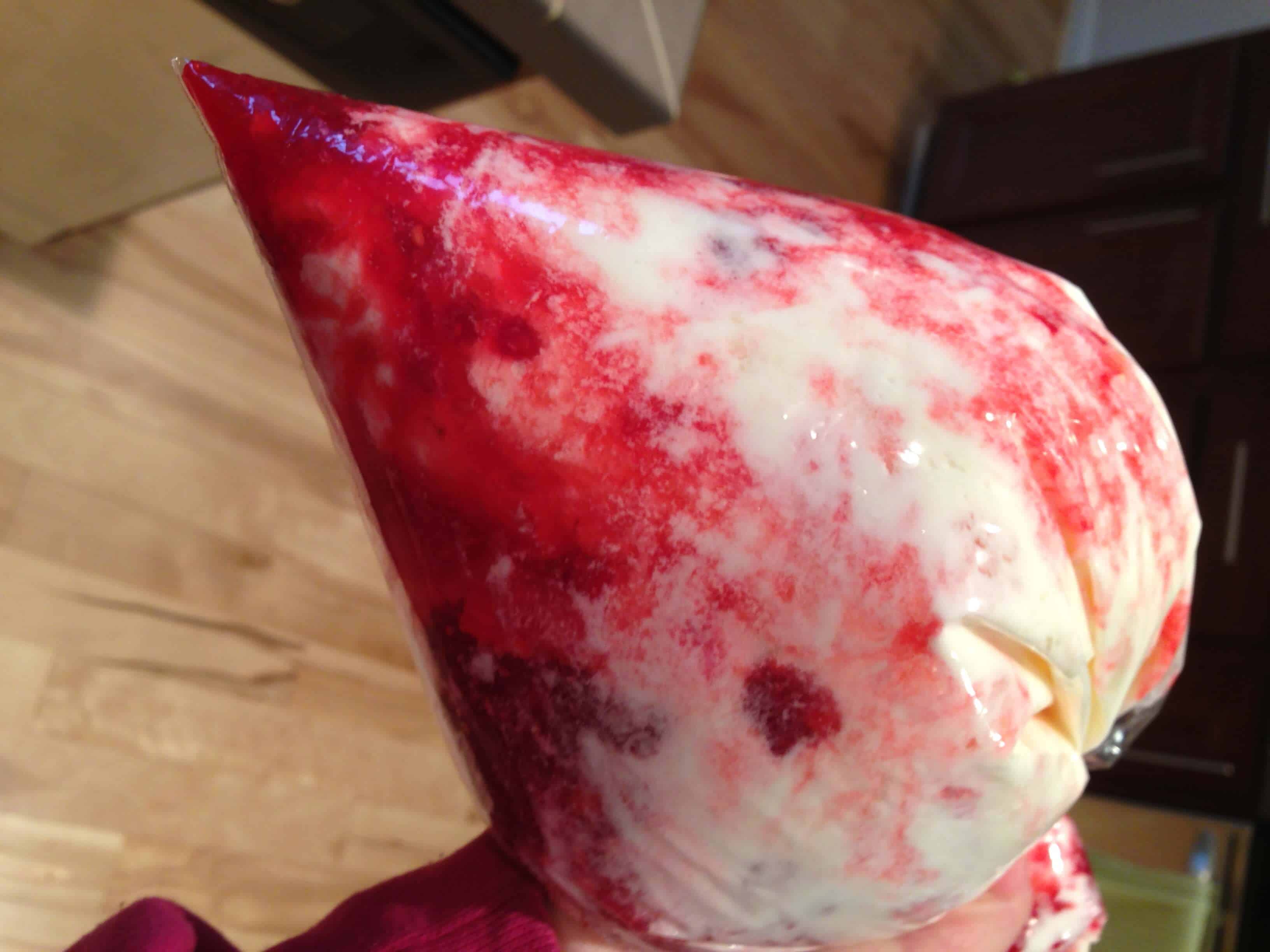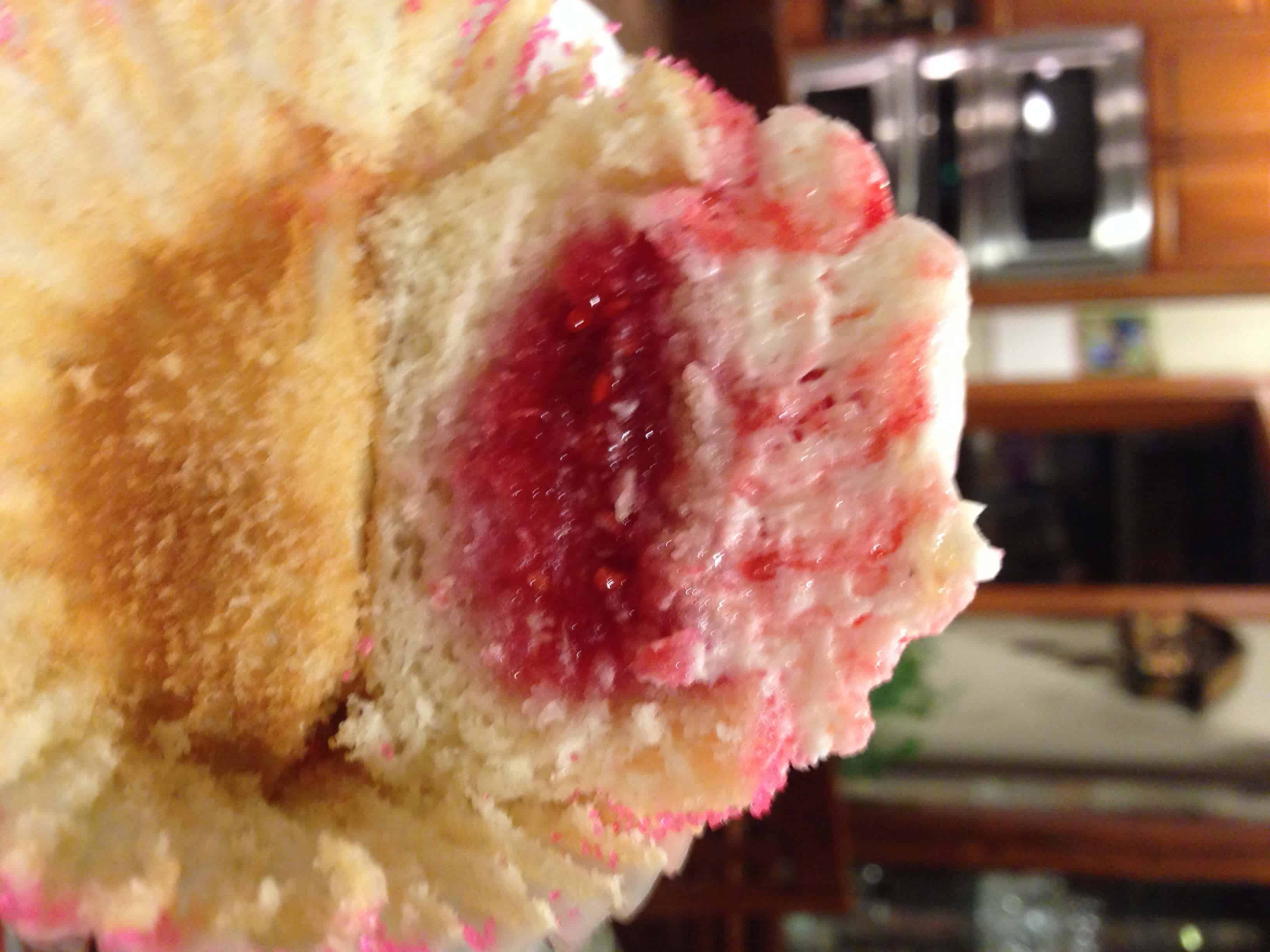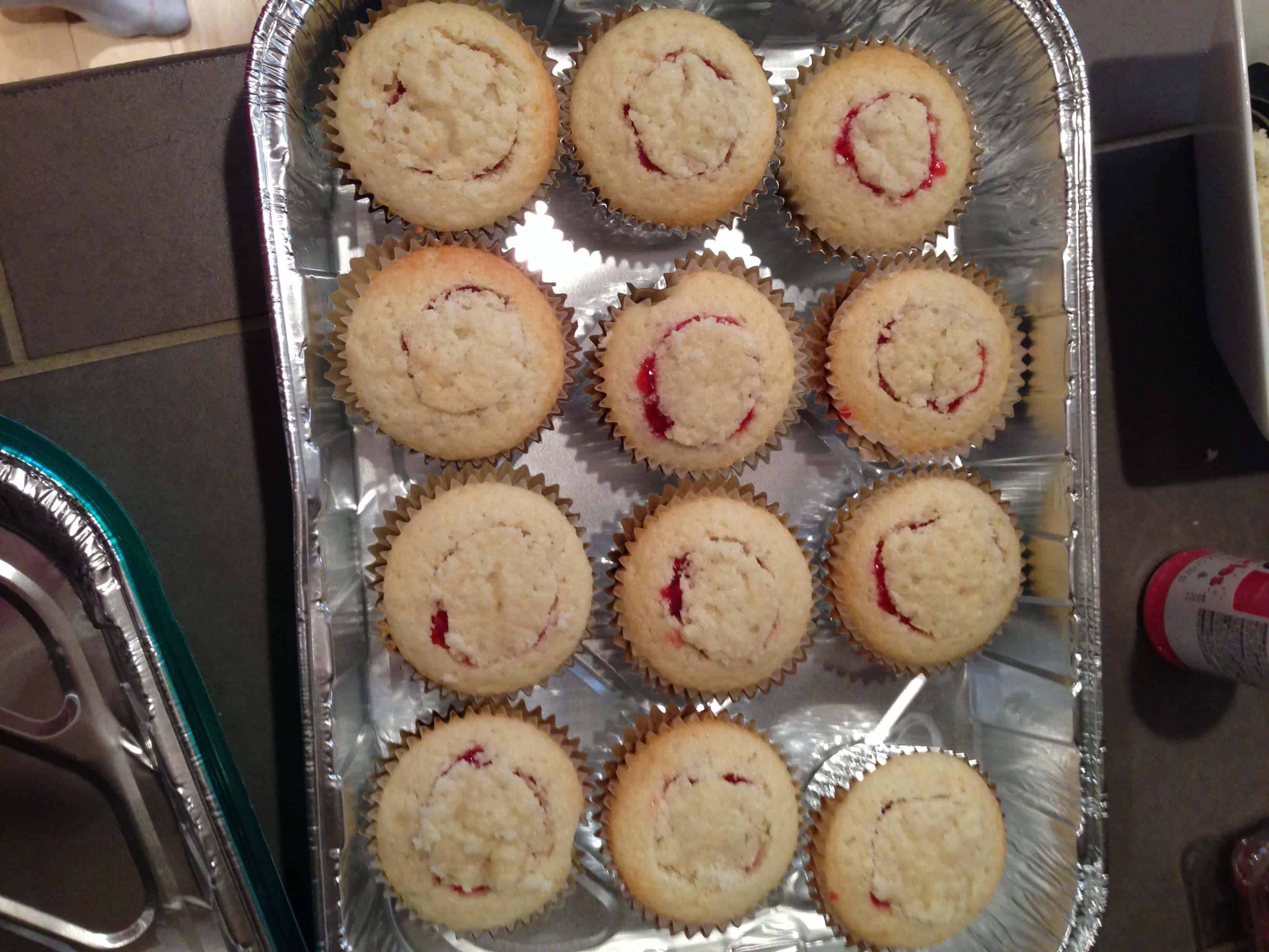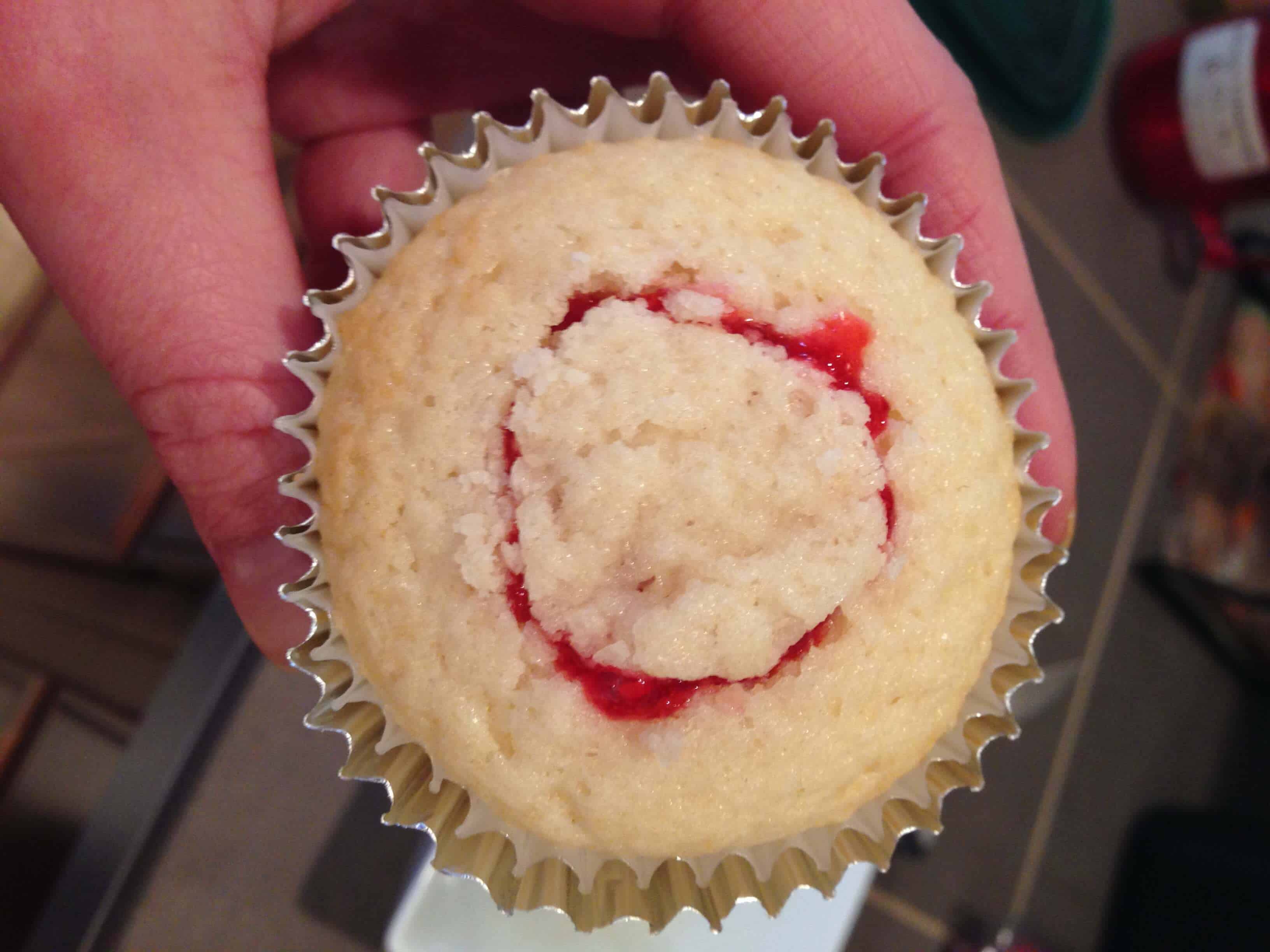 霜冻的蛋糕,补保鲜袋包(我没有在我妹妹家的任何结霜袋或装饰提示)与结霜,并添加果酱。轻轻移动卡纸绕包,直到它已被均匀地扭曲成结霜。切割袋的尖端来创建一个3/4英寸开口,并且管的结霜到杯形蛋糕。与顶部的树莓完成的蛋糕。他们尝到了厉害!话又说回来,任何事情我做我妈妈的酱总是味道鲜美