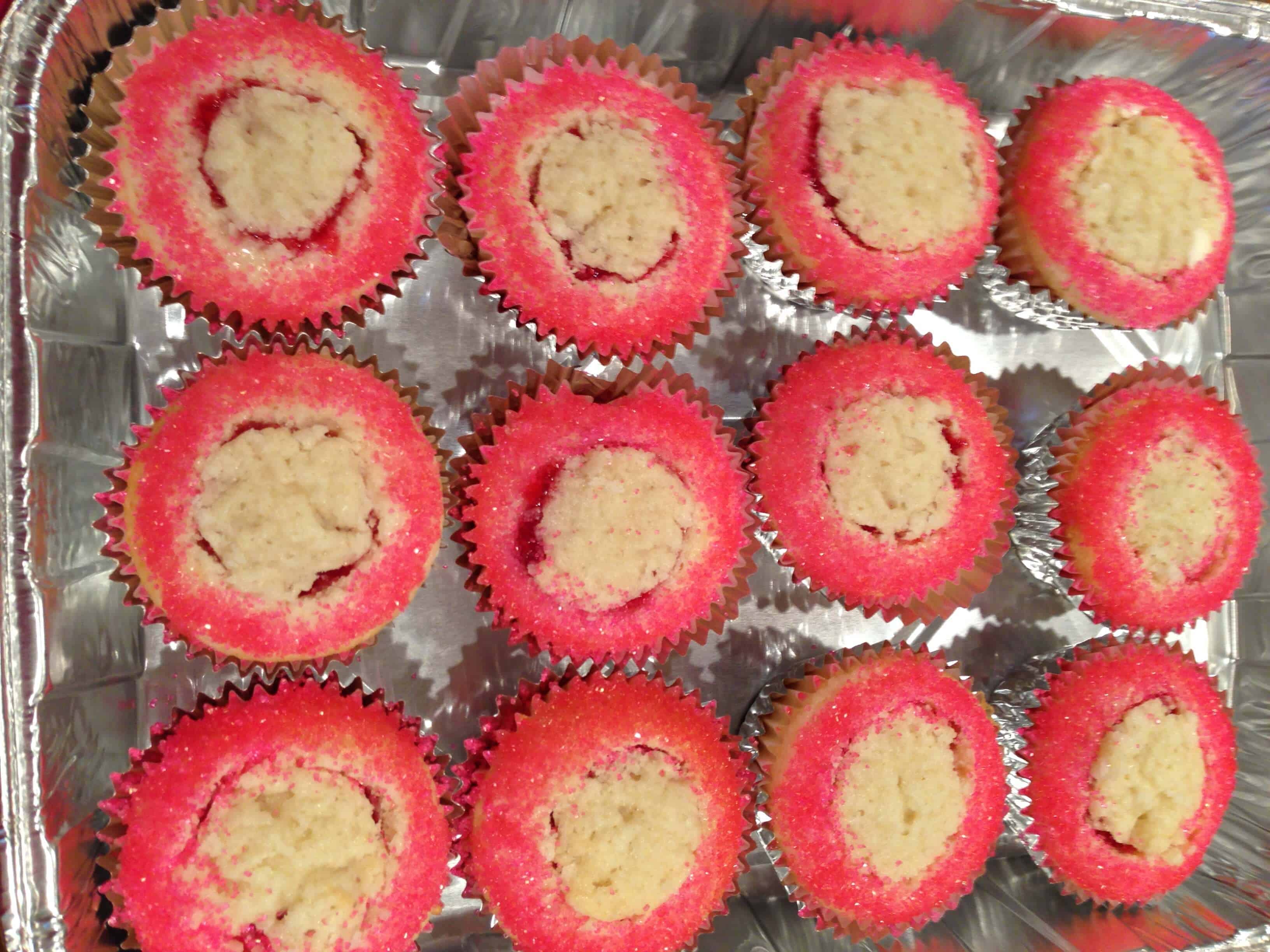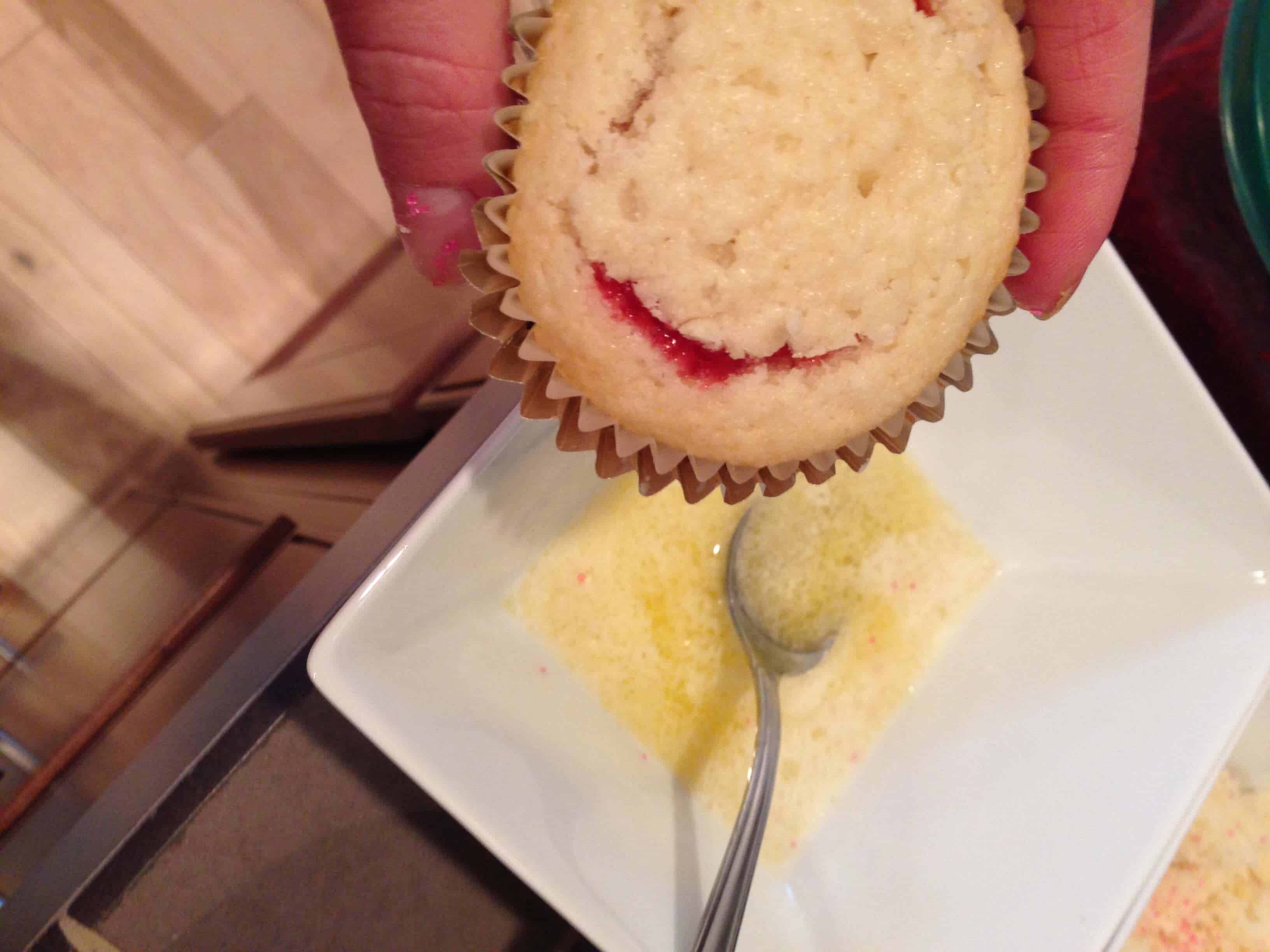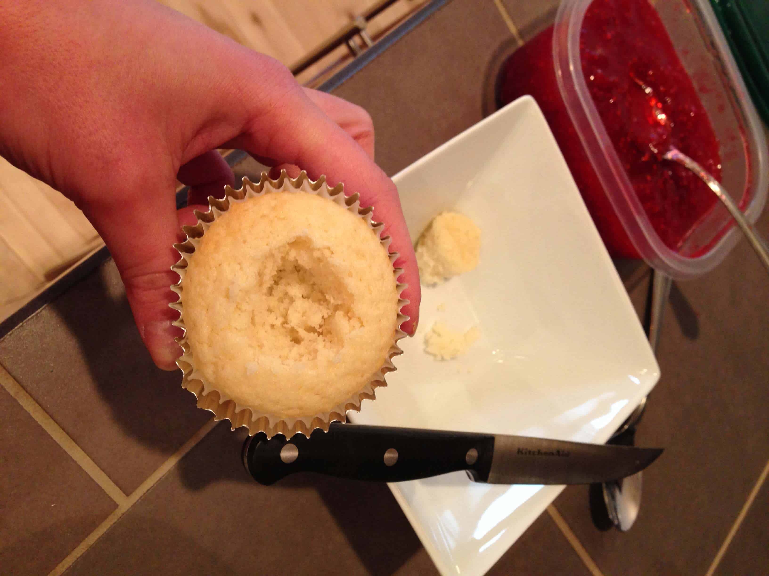 一旦蛋糕完成冷却,切出用锋利的刀的中心的杯形蛋糕的。圆应约在直径为1英寸,约3/4英寸深。确保有大约保持在底部蛋糕的1/2英寸,这样果酱不会通过渗透到蛋糕的底部。装满果酱汤匙每个蛋糕,然后把切的顶部1/4英寸出来中心顶部的卡纸。