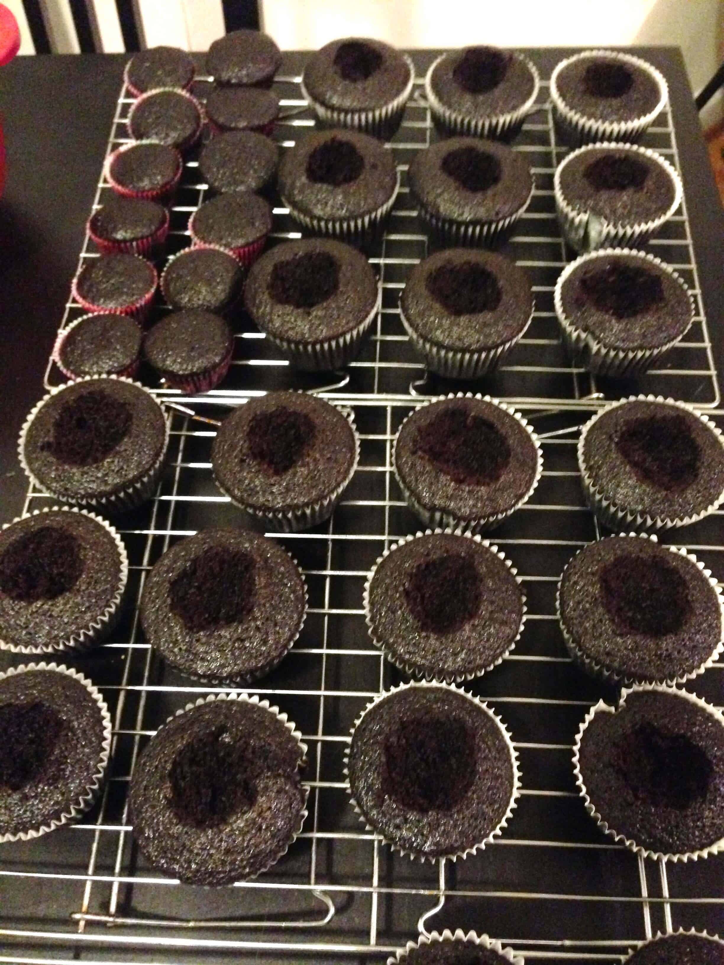 烤箱预热到华氏350度线是标准尺寸的蛋糕锅用衬垫。放到一个中碗的巧克力和可可粉。倒在混合物中的热咖啡,一起搅拌至顺滑。设置在冰箱混合物5分钟冷却。同时,一起扫面粉,糖,盐和小苏打在介质中碗;搁置。拂油,蛋,醋,和香草提取物到冷却的巧克力咖啡混合物直到光滑。逐步加入面粉混合物,搅拌至顺滑。平均分配面糊松饼锅杯之间,尽显他们约2/3。烘烤,直到蛋糕被设置,只是坚定的触感,17至19分钟。 Cool the cupcakes in the pan on a wire rack for 10 minutes, then remove the cupcakes from the pan and place on the wire rack to cool completely, about 1 hour.