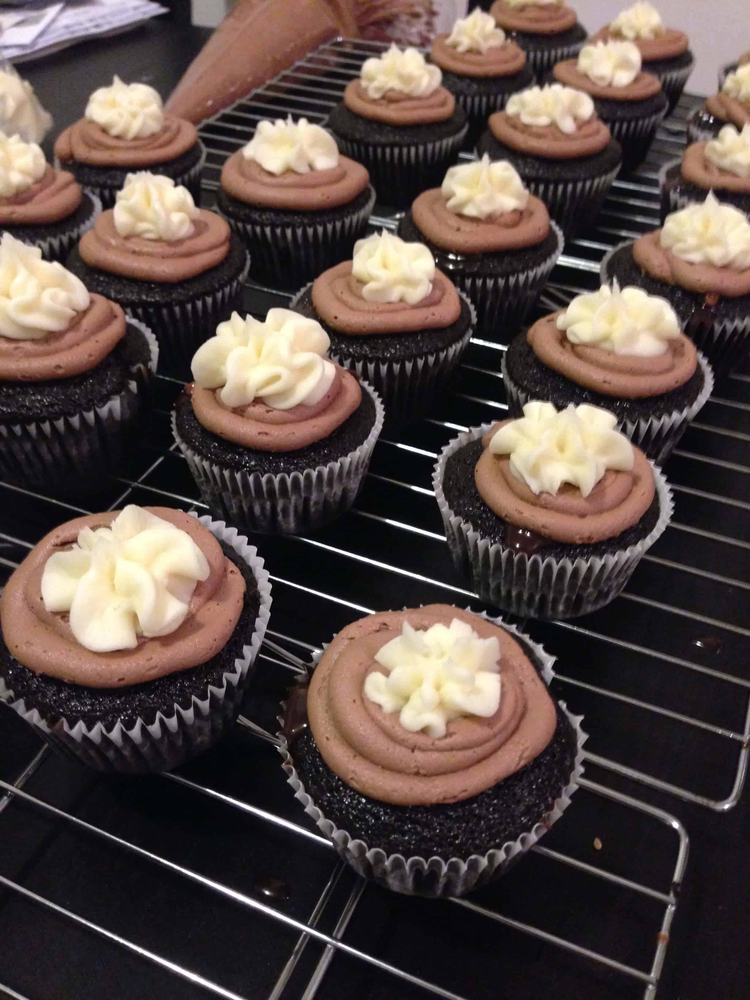 当蛋糕已经冷却,镂空每个杯形蛋糕(1英寸daimeter)的中心。与榛子馅的汤匙填写。在花生酱管道奶油使用大圆头。使用所保留的香草奶油,管结霜的花生酱的奶油的顶部上,使用星尖端的漩涡。如果需要的话,小雨温暖花生酱在结霜。顶配松露蛋糕每个。和TAH DAH!更多花生酱比你所能想象的。