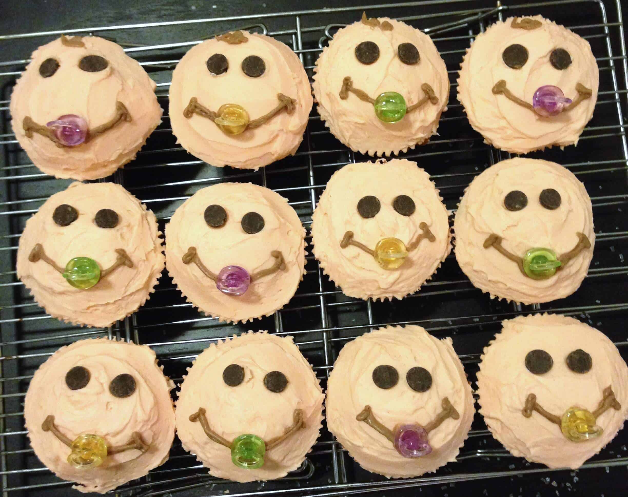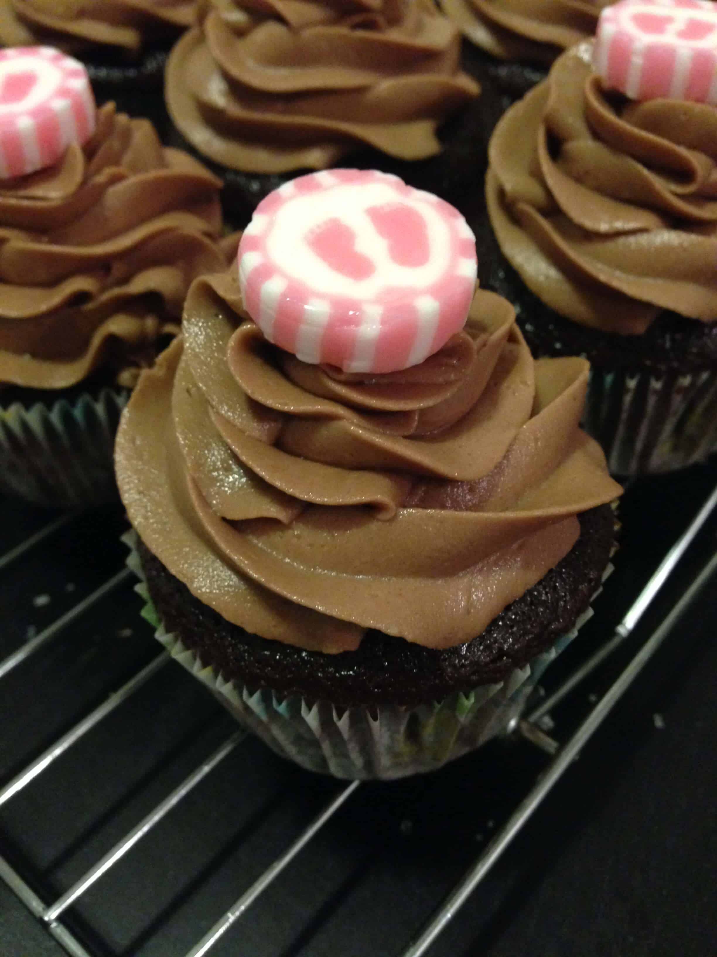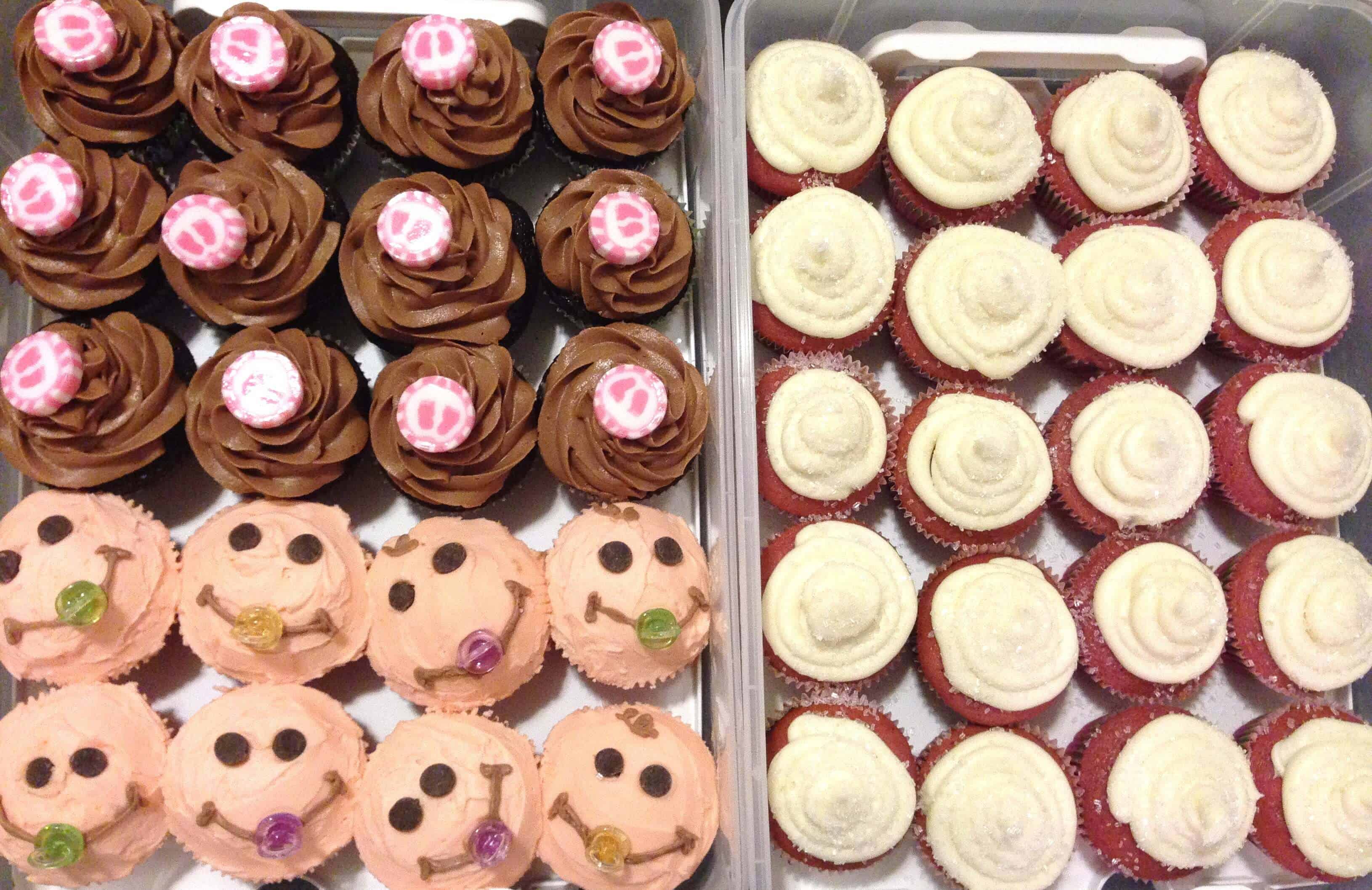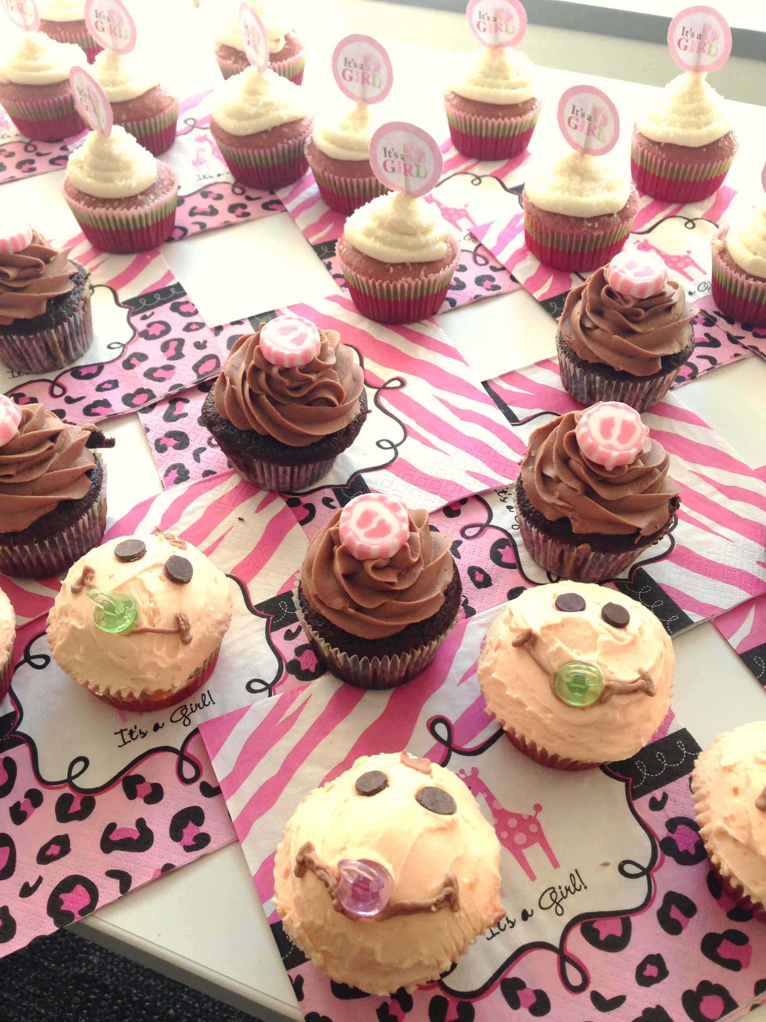 对于香草纸杯蛋糕,我用迷你奶嘴、一些巧克力糖霜和巧克力片来装饰它们,让它们看起来像婴儿的脸!我用了一个圆形的顶端和纸杯蛋糕的顶部来装饰粉色的天鹅绒,用了一些婴儿糖和一个星形的顶端来装饰三层巧克力纸杯蛋糕。每一种都很棒!I was very pleased with the taste and appearance of these cupcakes, and I think everyone at the party liked them too It was a wonderful evening at the office.