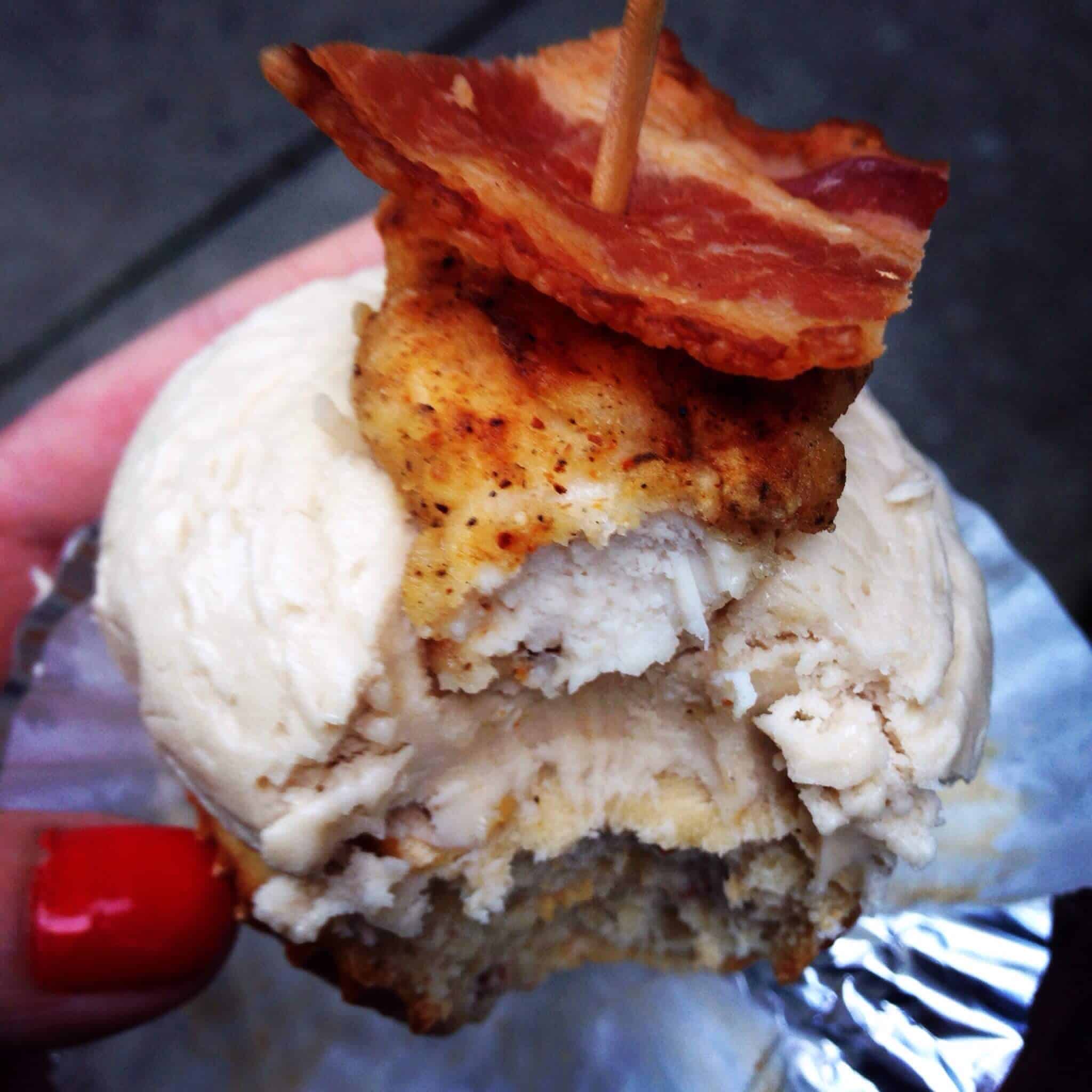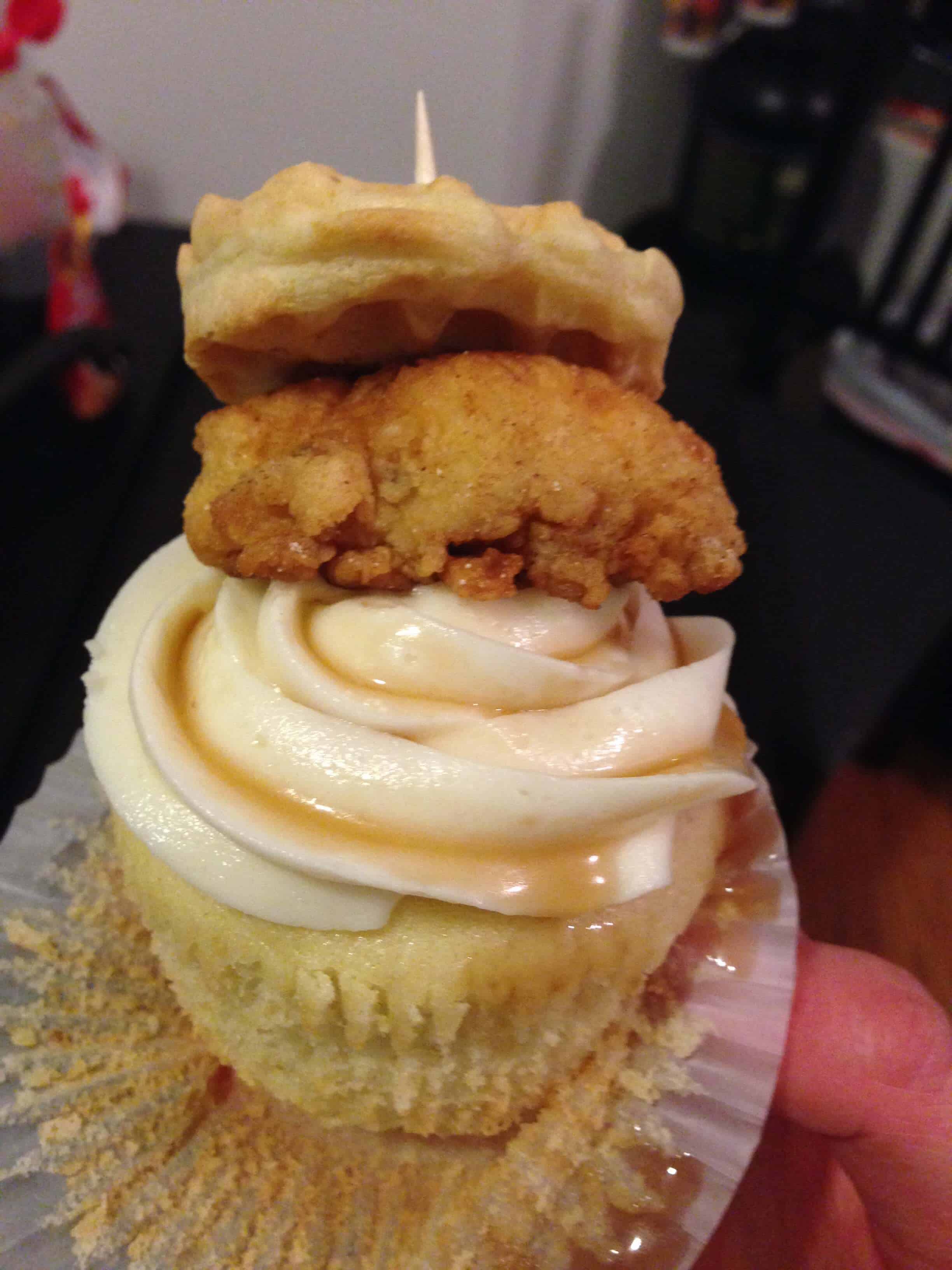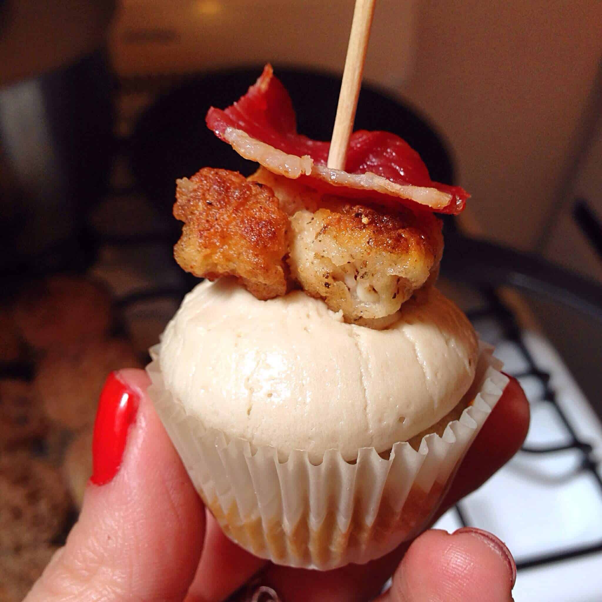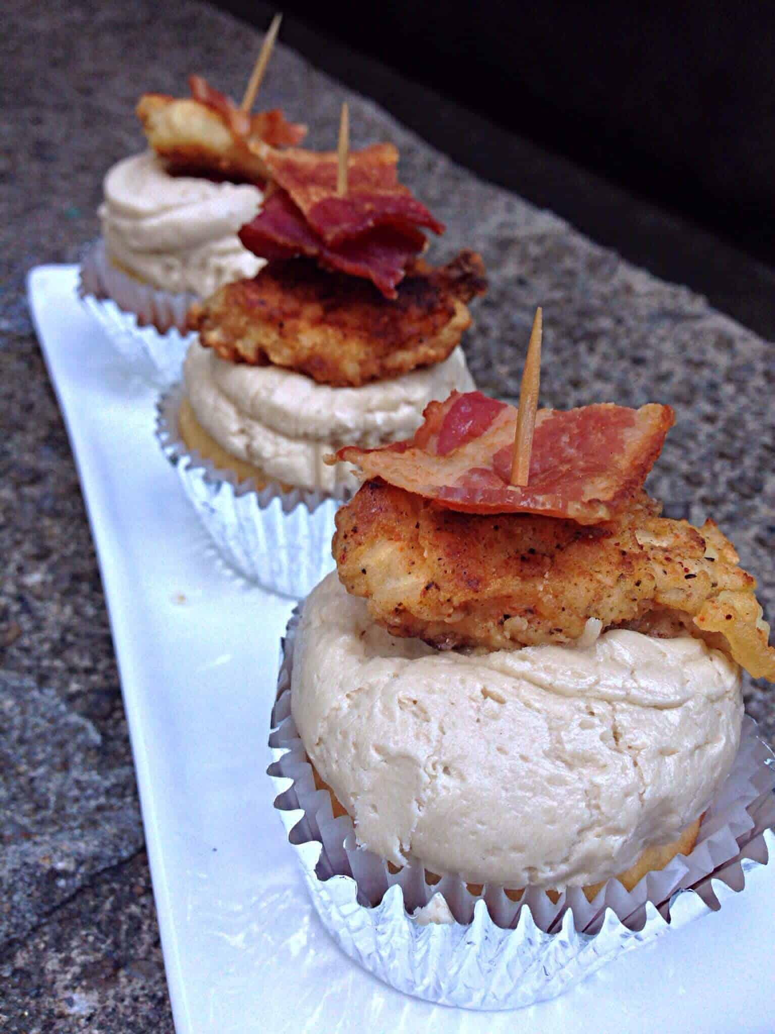 哈哈,它们真好吃!枫糖纸杯蛋糕和奶油的甜味与鸡肉和培根的盐和香料相平衡。I love the salty/sweet combo, and the chicken and pecans give the cupcake great texture You definitely need to try these!