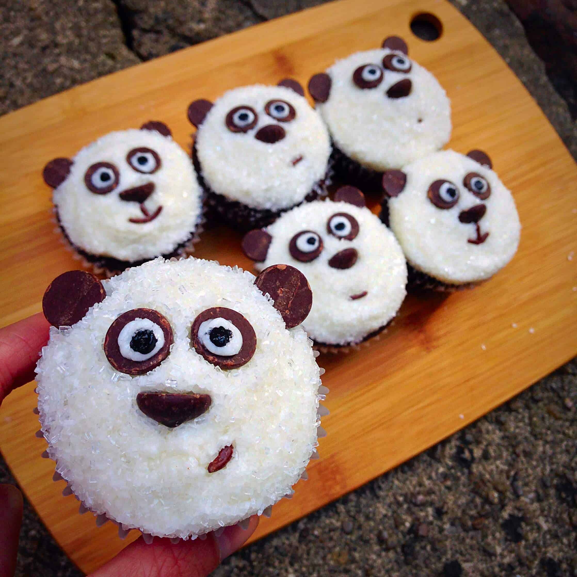 当蛋糕完全冷却后,用一个大而圆的刀尖撒上糖霜。将磨砂纸杯蛋糕沾入一碗白糖末中,确保整个表面都覆盖着糖霜末。在蛋糕的上三分之一处放两个大的巧克力片,让眼睛朝下。在眼白上加一小块糖霜,在瞳孔上加一点黑糖霜或黑糖霜。在糖霜的上边缘放两个巧克力片,用来做耳朵。在蛋糕中间横着放一块巧克力片,用来做鼻子。用棕色的糖屑,做成熊猫的嘴巴。这是有趣的部分,你可以让熊猫有你选择的任何表情