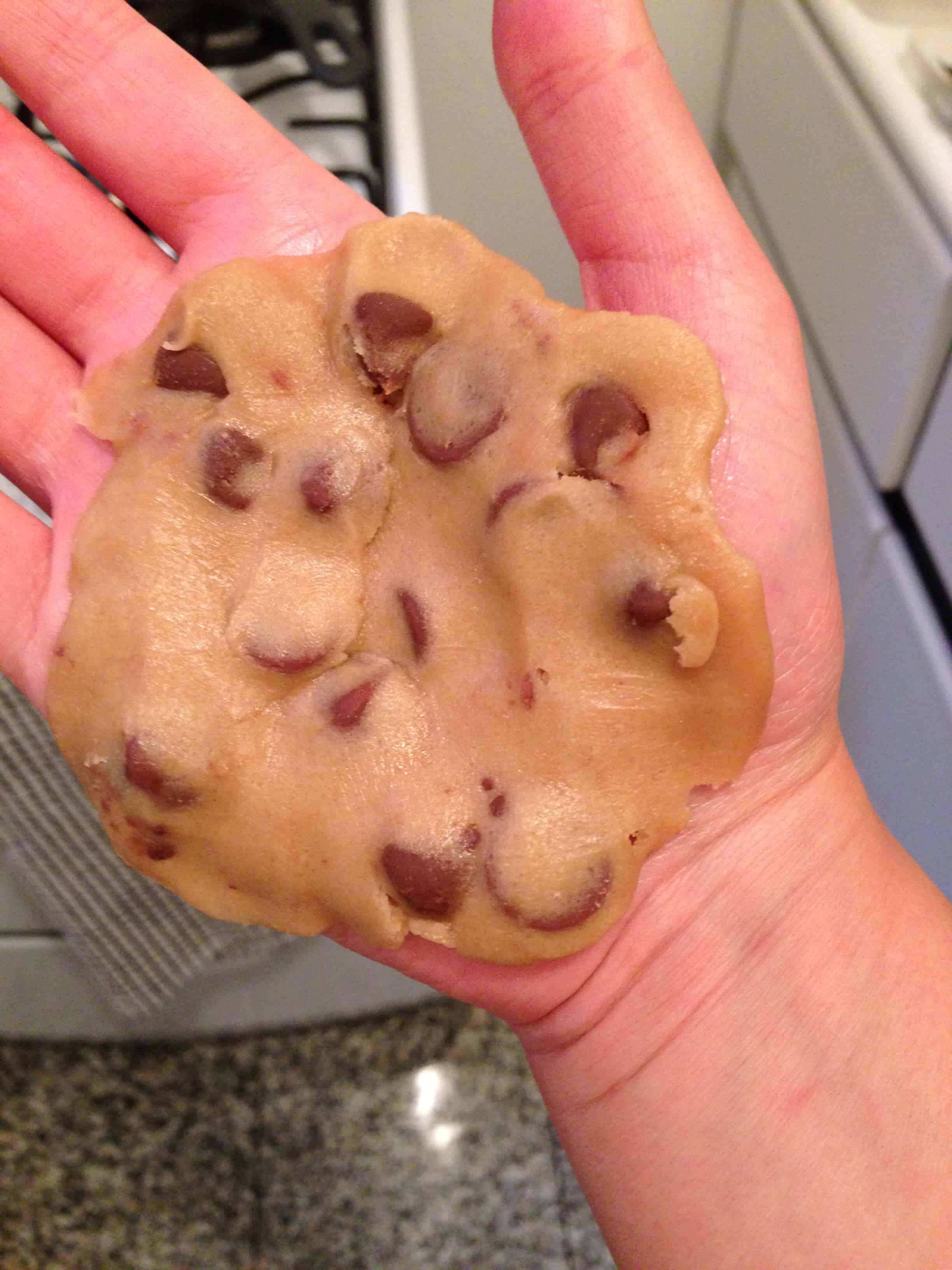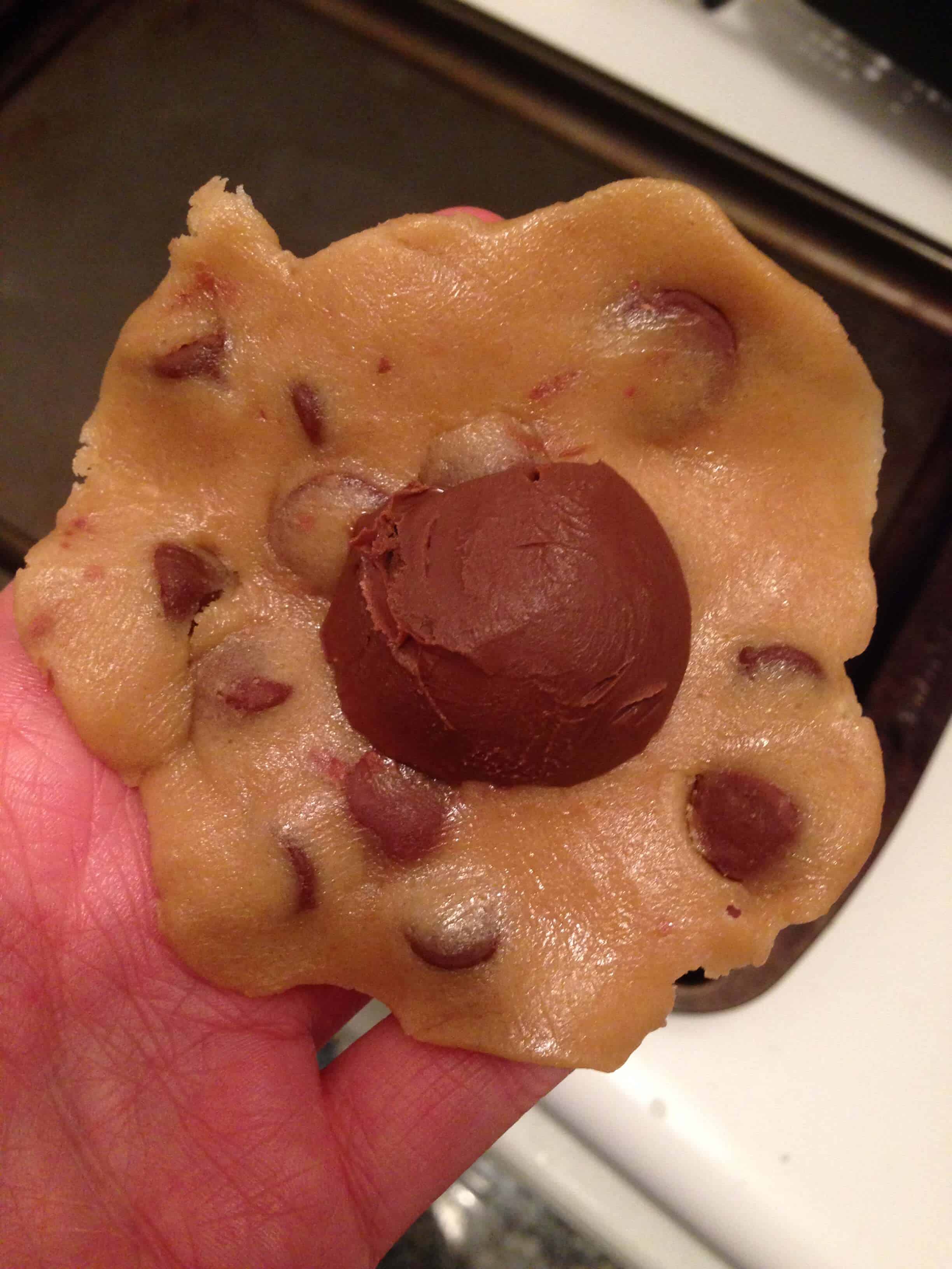 第二天早上,把烤箱预热到350度。用大约1 1/2汤匙的曲奇饼面团做成曲奇饼球,用手掌将面团压平。在中间放一茶匙冷却的Nutella,然后把面团折叠起来,轻轻揉成一个球。