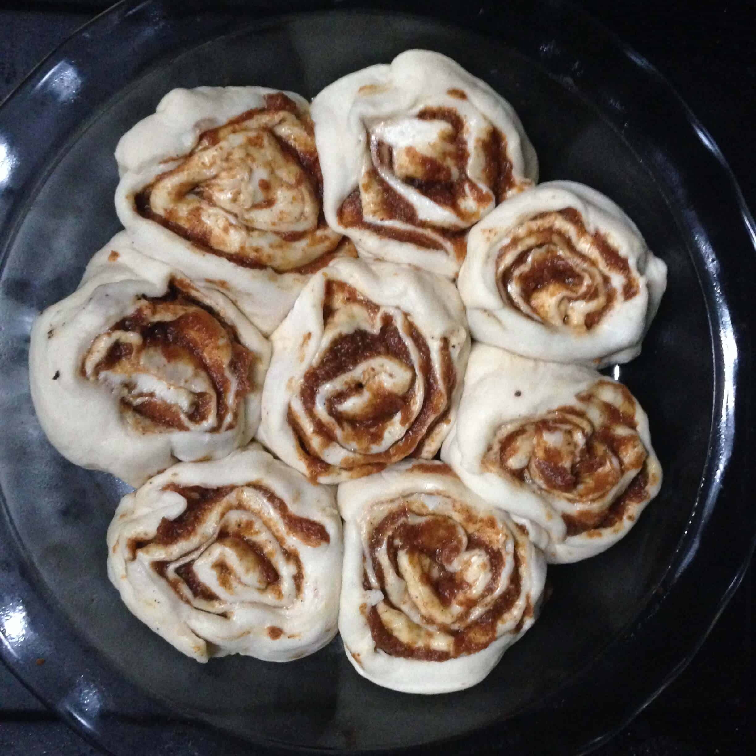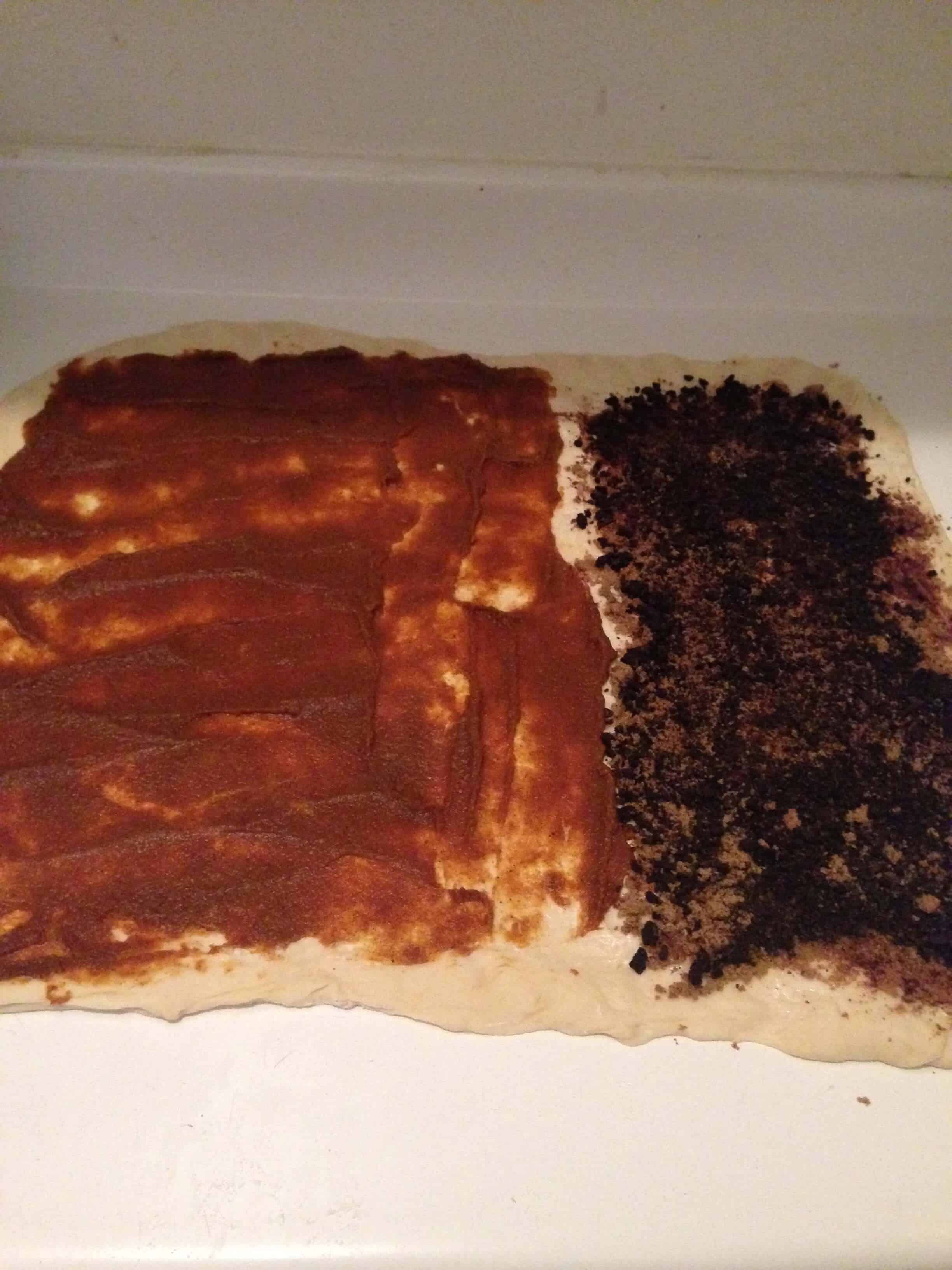 滚面团成一个大的矩形,直到它是关于一个厘米的1/2厚。熔体在整个面团矩形黄油和蔓延。在一个小碗里,搅拌在一起南瓜茸,红糖,肉豆蔻,肉桂。传播南瓜饼整个面团均匀地填充(我也尝试了奥利奥风味,如见上面...配方来照片!),让面团一英寸处发现的矩形的顶部。从远端水平卷起面团。面团滚成一个紧密的卷。切割面团日志到8个等份(你可以把它切成多件,如果你想肉桂卷更小),并将其放置在抹油烧热,留下约各卷之间半英寸。封面与润滑保鲜膜,并让他们再次上升(约30分钟)。烘烤在350 30-35minutes,或者直到辊是金黄色和中心显得坚挺。虽然辊烹饪,准备结霜。