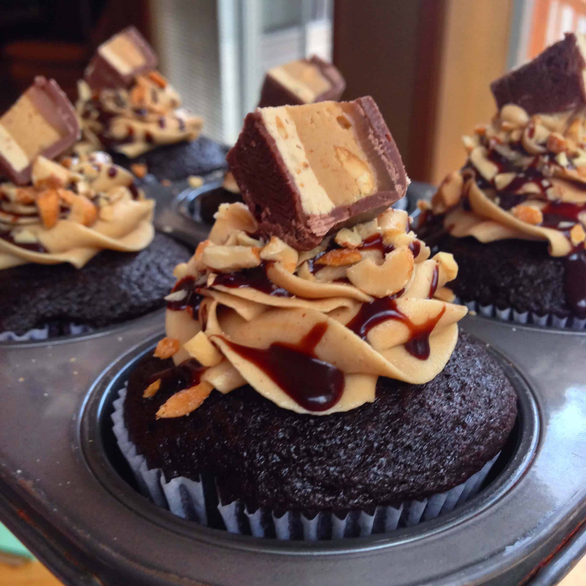 - 顶部具有焦糖和巧克力细雨伽纳彻,花生碎,和一块嘲笑杆的每个杯形蛋糕。