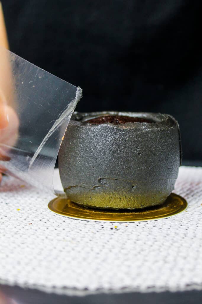 制作这些金杯形蛋糕的最后一个工具是醋酸纤维板! 这是我用来磨平蛋糕和有弯曲边的纸杯蛋糕上的糖霜的小塑料片。