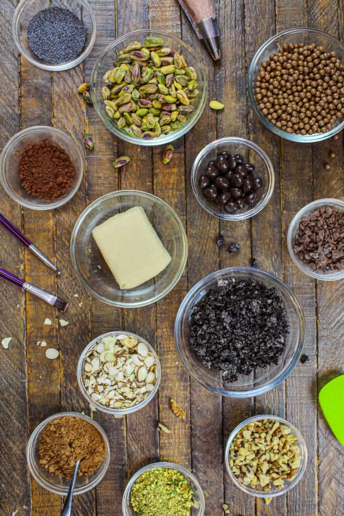 为了把这个想法生活,我用几个不同的浇头。粉碎奥利奥,罂粟籽和巧克力糖霜使它看起来像潮湿,营养土的顶部一些杏仁片。