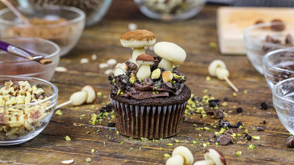 - 装饰这些蘑菇蛋糕,巧克力管结霜的小漩涡到每个冷却蛋糕。