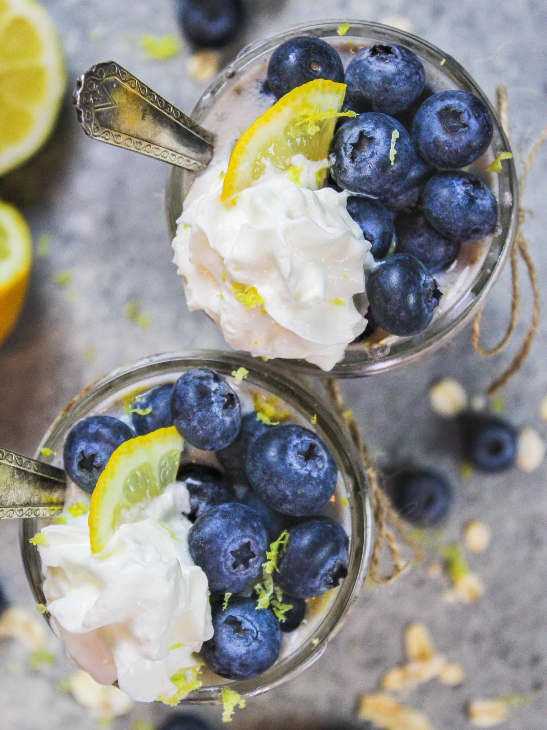 - Add 1/2 cup rolled oats, 2 tsp chia seeds, 2 Tbsp brown sugar, 1/4 cup greek yogurt, 1/2 cup blueberries, 2/3 cup milk and 2 tsp lemon zest (if desired) into a mason jar or bowl.