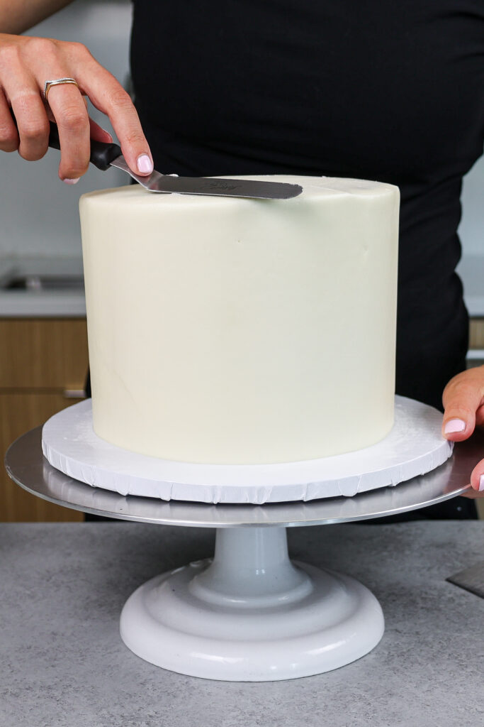 平滑使用A.板凳刮刀,然后将蛋糕放入冰箱(30分钟)或冰箱(10分钟)中冷却,直到糖霜摸起来很硬。