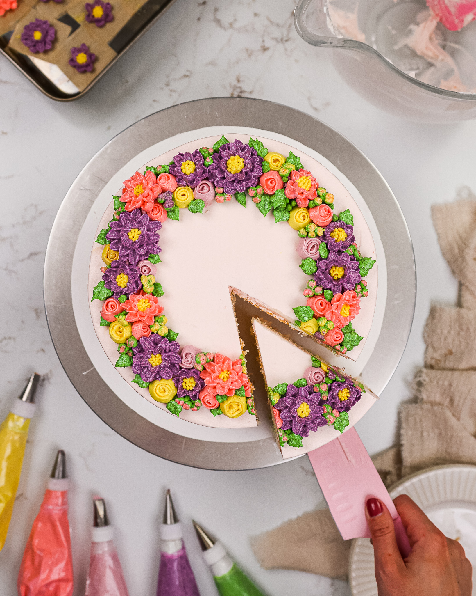 学习如何做这个华丽的奶油淇淋花蛋糕!它用温柔的香草蛋糕层磨砂和美味的自制奶油乳酪。