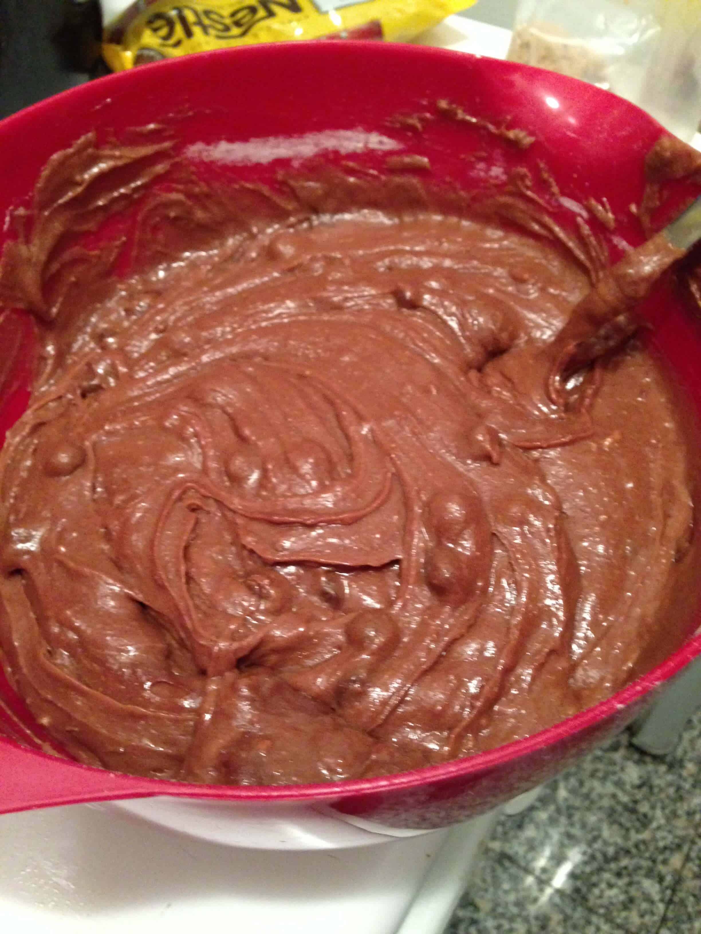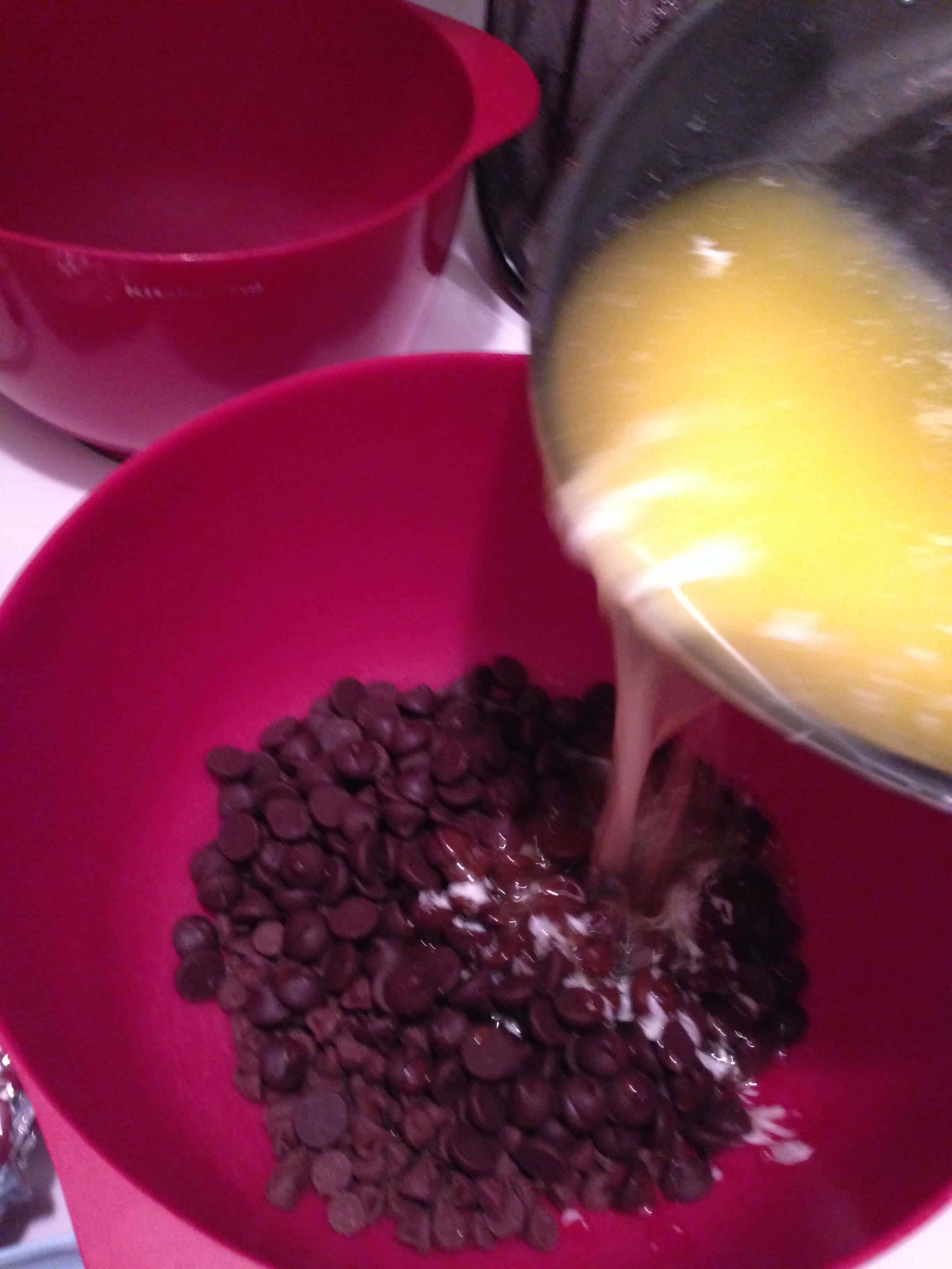 加入鸡蛋和香草提取物,也将其搅拌。混合融化的巧克力。在面粉中搅拌并混合直至混合(不要过度混合)。搅拌巧克力片。将面糊撒入准备好的锅中。烘烤25至35分钟。仔细观察并在牙签插入中心时从烤箱中取出。让完全冷却。