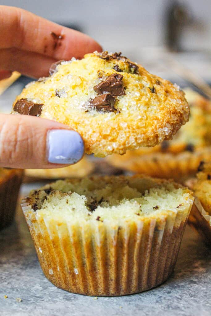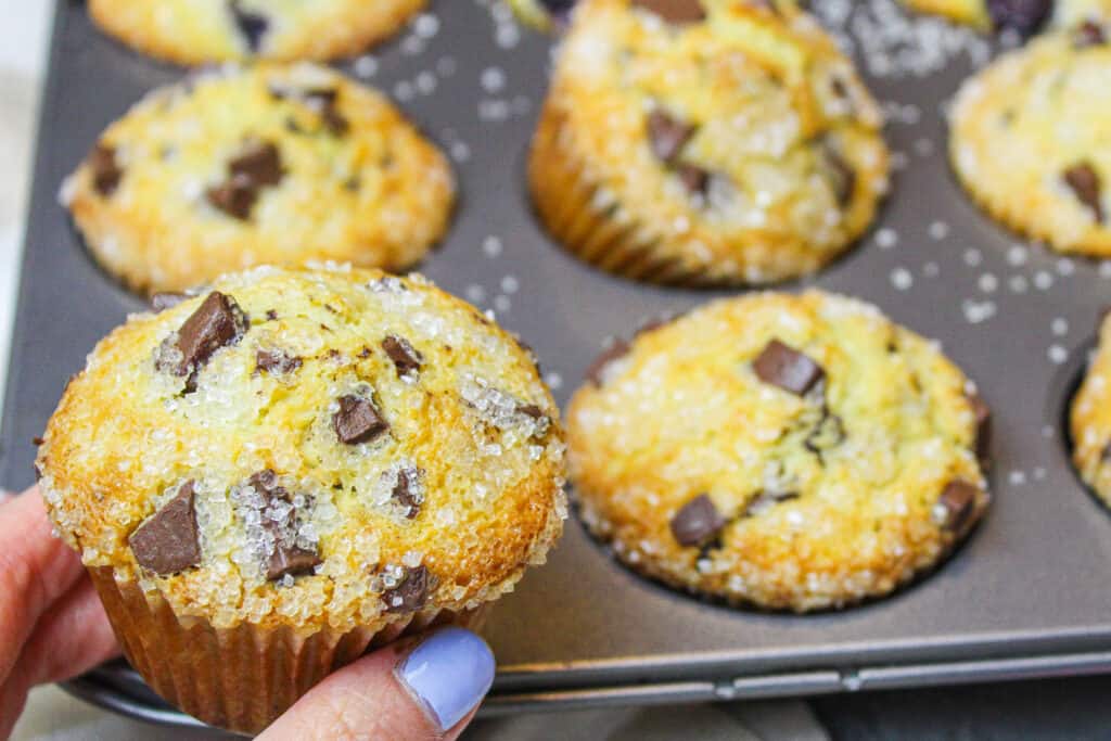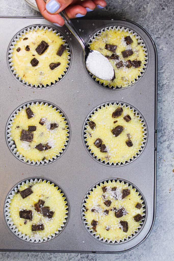 - 如果需要,在每个松饼顶部添加撒上粗糖和一些额外的巧克力。