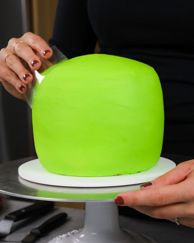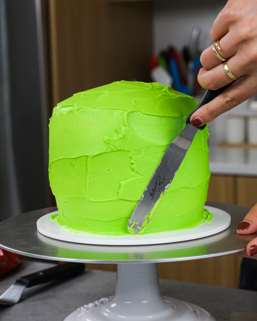 - 从冰箱或冰箱上取出蛋糕,并在蛋糕周围柔滑一层厚厚的鲜绿色黄油奶油。使用醋酸薄片或小的偏移刮刀以使糖霜平滑。