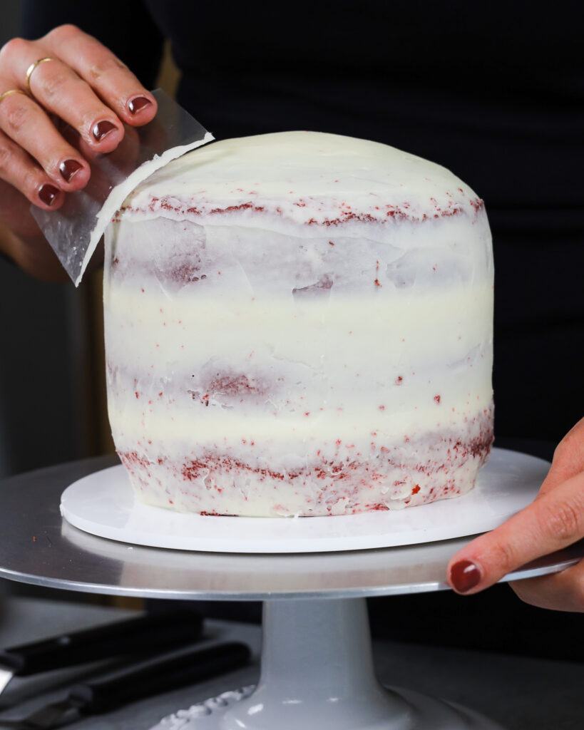 - 在蛋糕周围加入一层薄涂层,使蛋糕层完全覆盖。使用偏移刮刀和/或板凳刮刀平滑,然后将蛋糕放在冰箱(20分钟)或冰箱(10分钟)中,直到糖霜牢固地触摸为止。