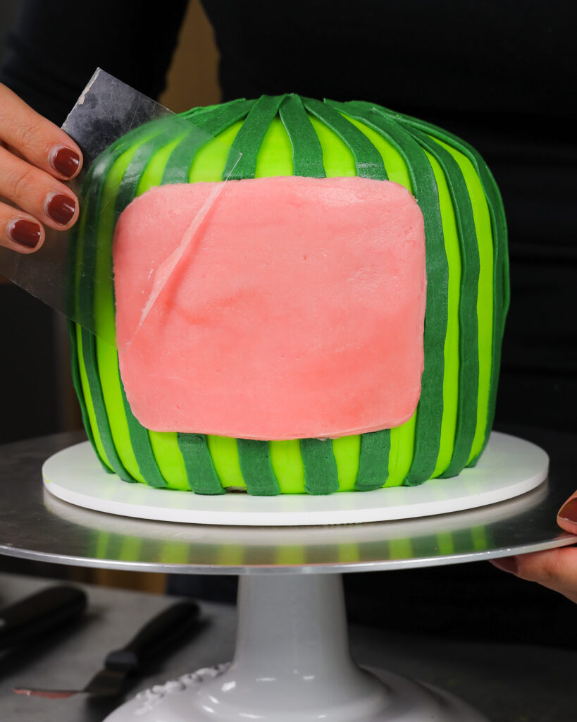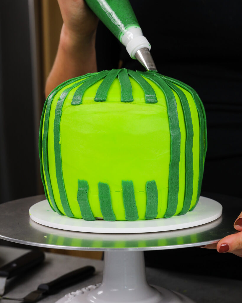 管道深绿色的奶油条纹在蛋糕的侧面。我建议从蛋糕的后部开始。我花了几条条纹来掌握它,这样最好的条纹就会在前面!