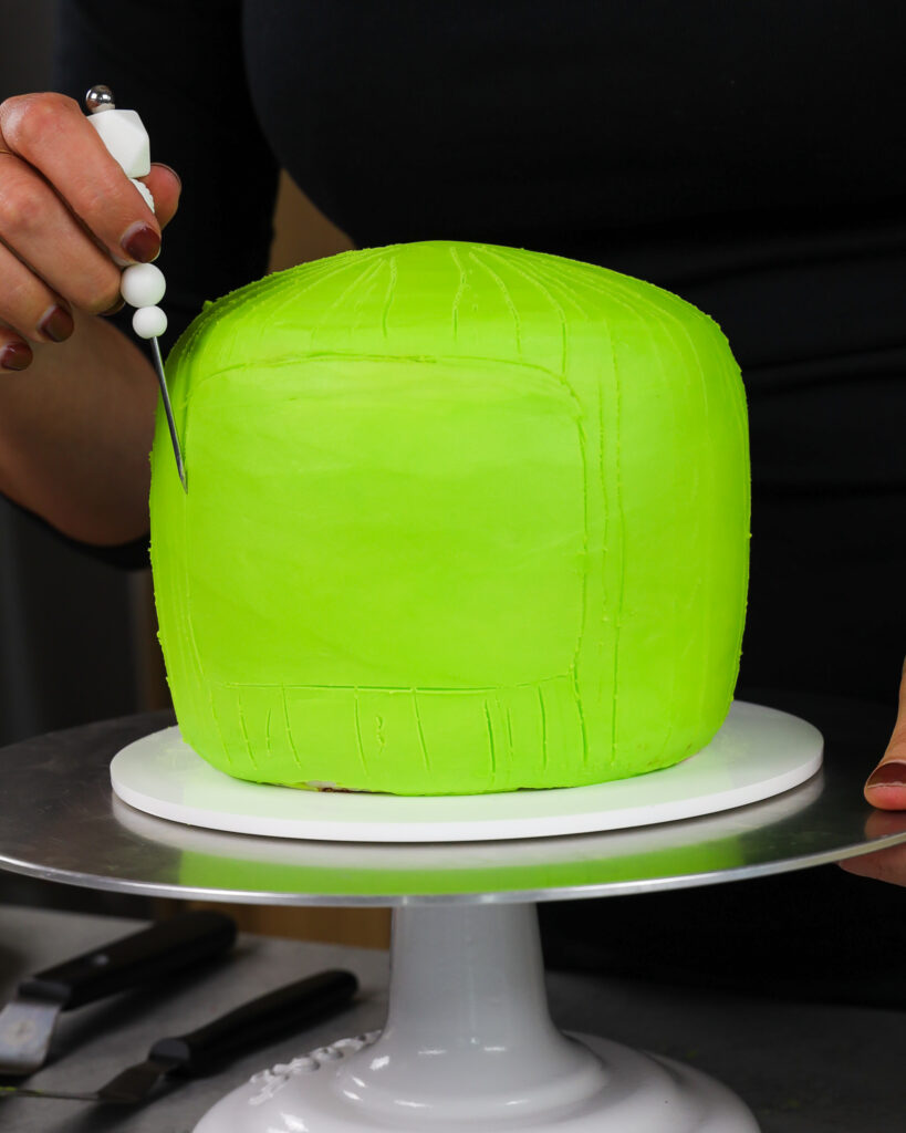- 从冰箱或冰箱中取出蛋糕。使用牙签或抄写员轻轻地追踪您要在哪里管道和条纹。管道深绿色的奶油条纹在蛋糕的侧面。我建议从蛋糕的后部开始。它需要几个条纹才能掌握它,这样最好的条纹就会在前面!