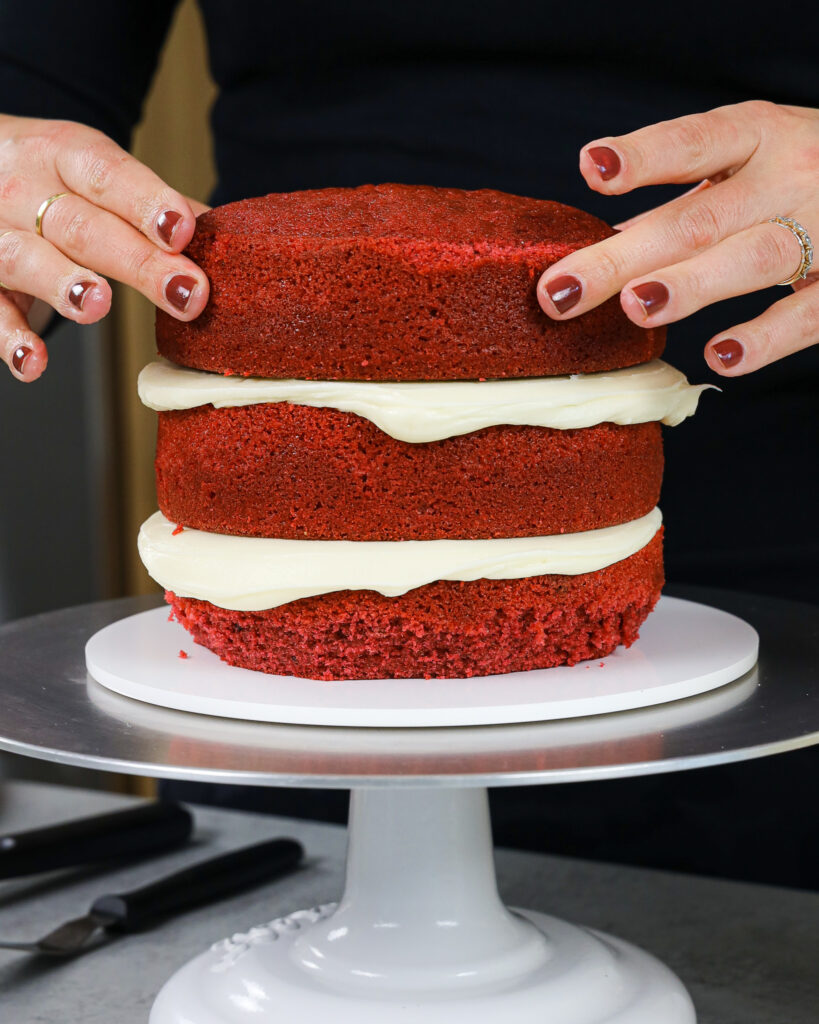 - 在组装之前将蛋糕层冷却约20分钟蛋糕。它使修剪,堆叠和冻结它们变得更加容易!