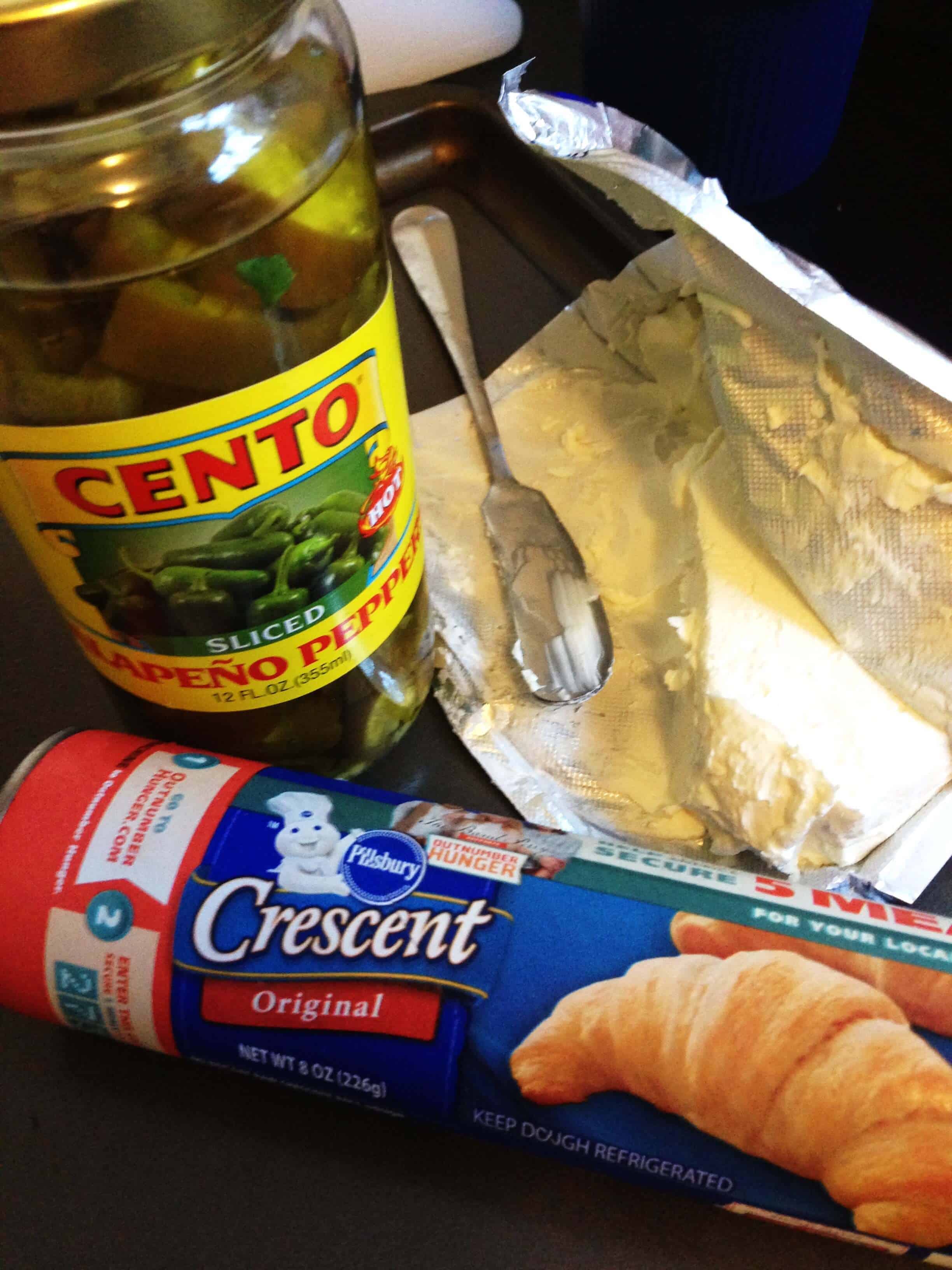 在每个三角形面团的底部撒上大约1/2汤匙的奶油奶酪,在上面撒上1/2汤匙的腌墨西哥胡椒。