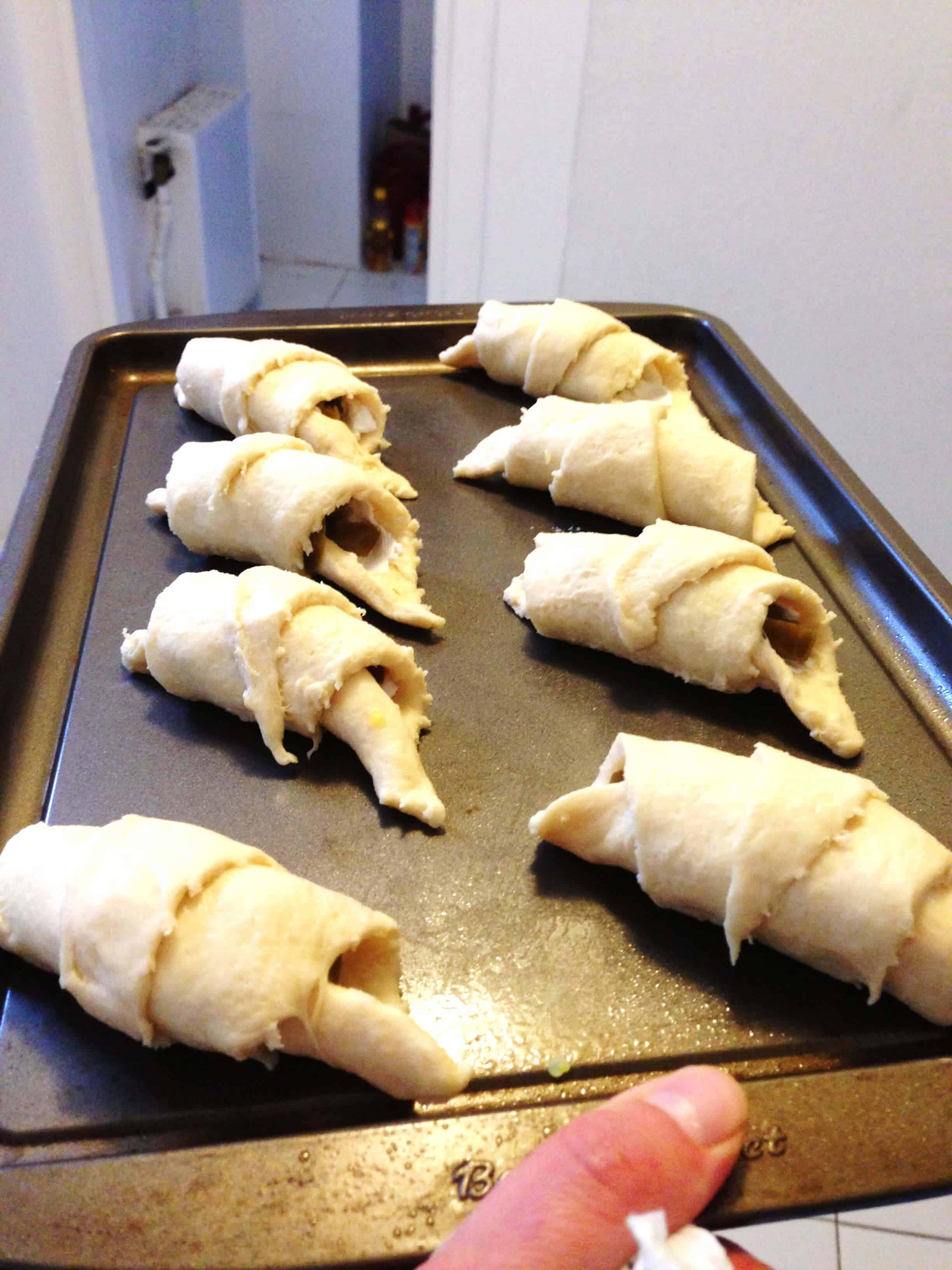 把每一弯月牙从底部开始卷起来。放入烤箱烤10分钟左右,直到变成金黄色。