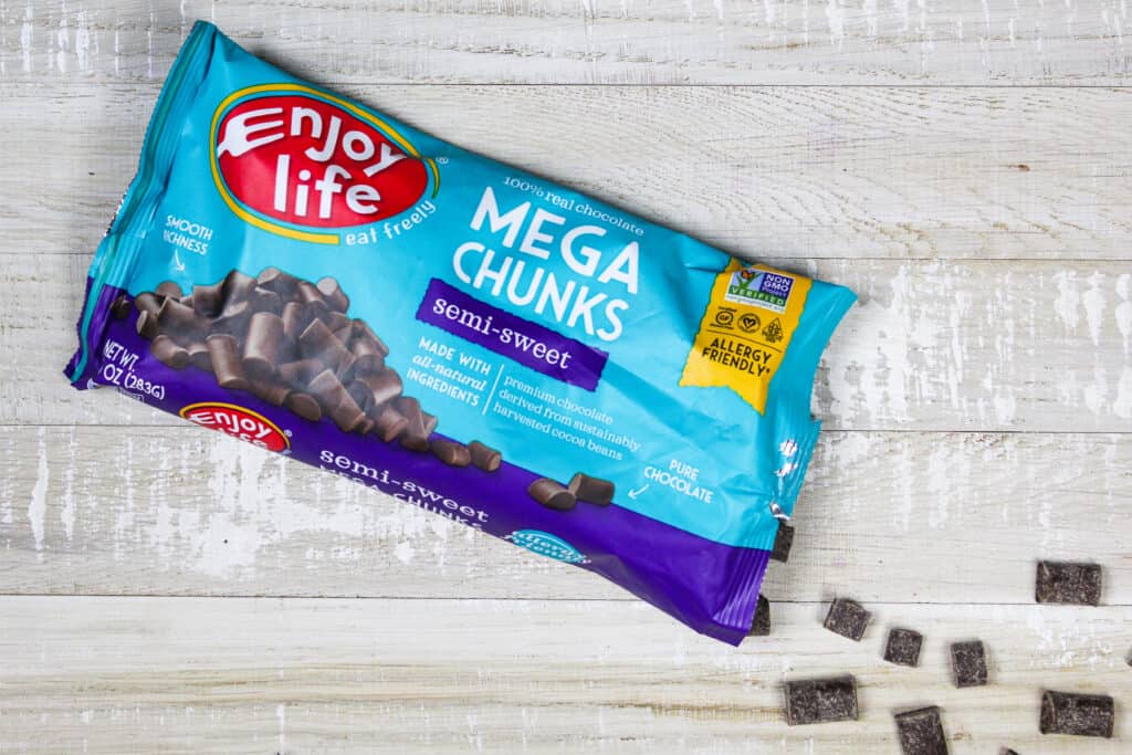 - 巧克力脆片- 采用素食巧克力片或大块,没有乳制品!您可以在大多数杂货店的烘焙区中找到它们。我通常使用享受生活品牌。